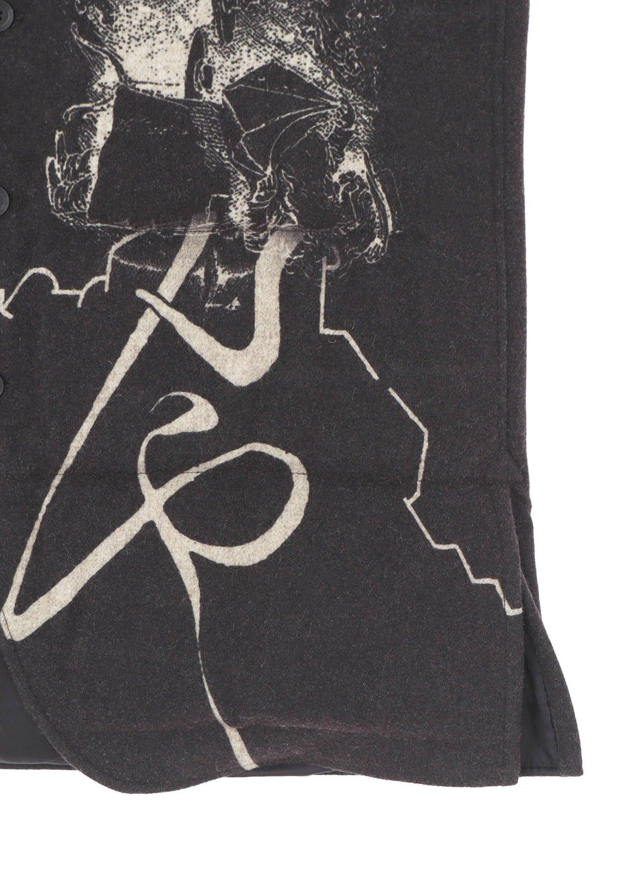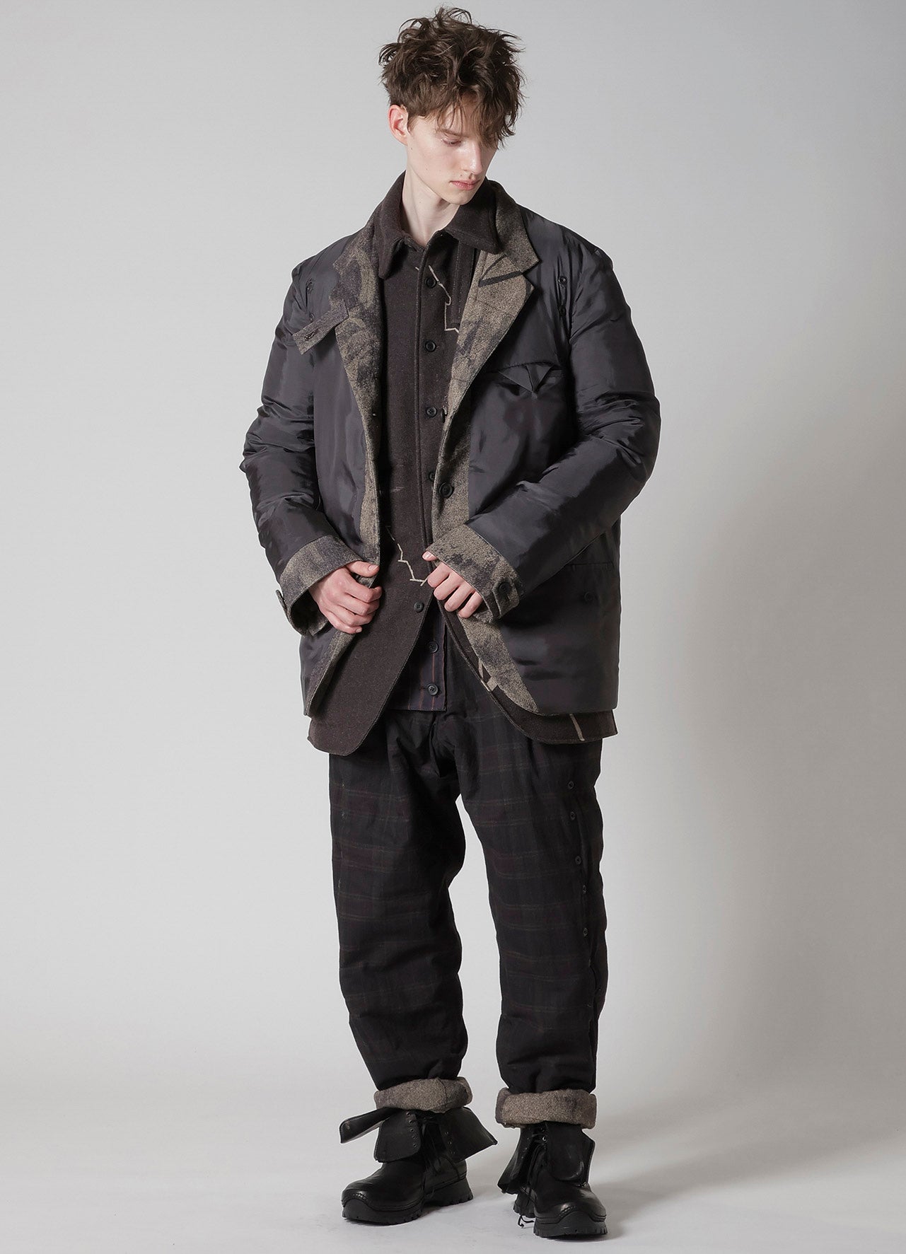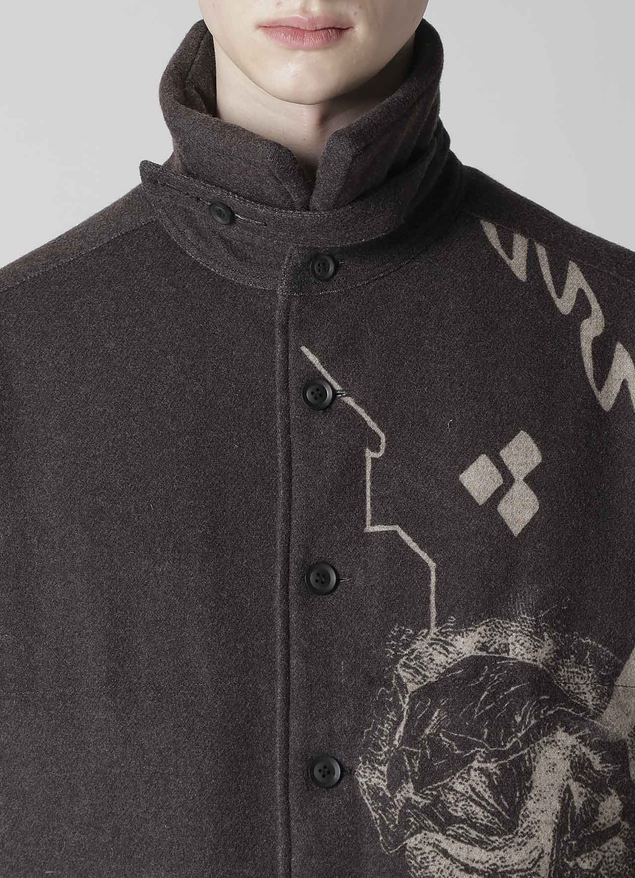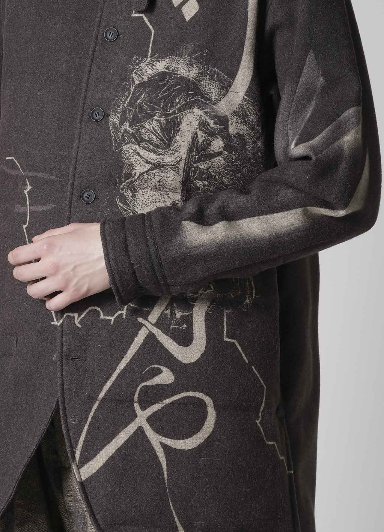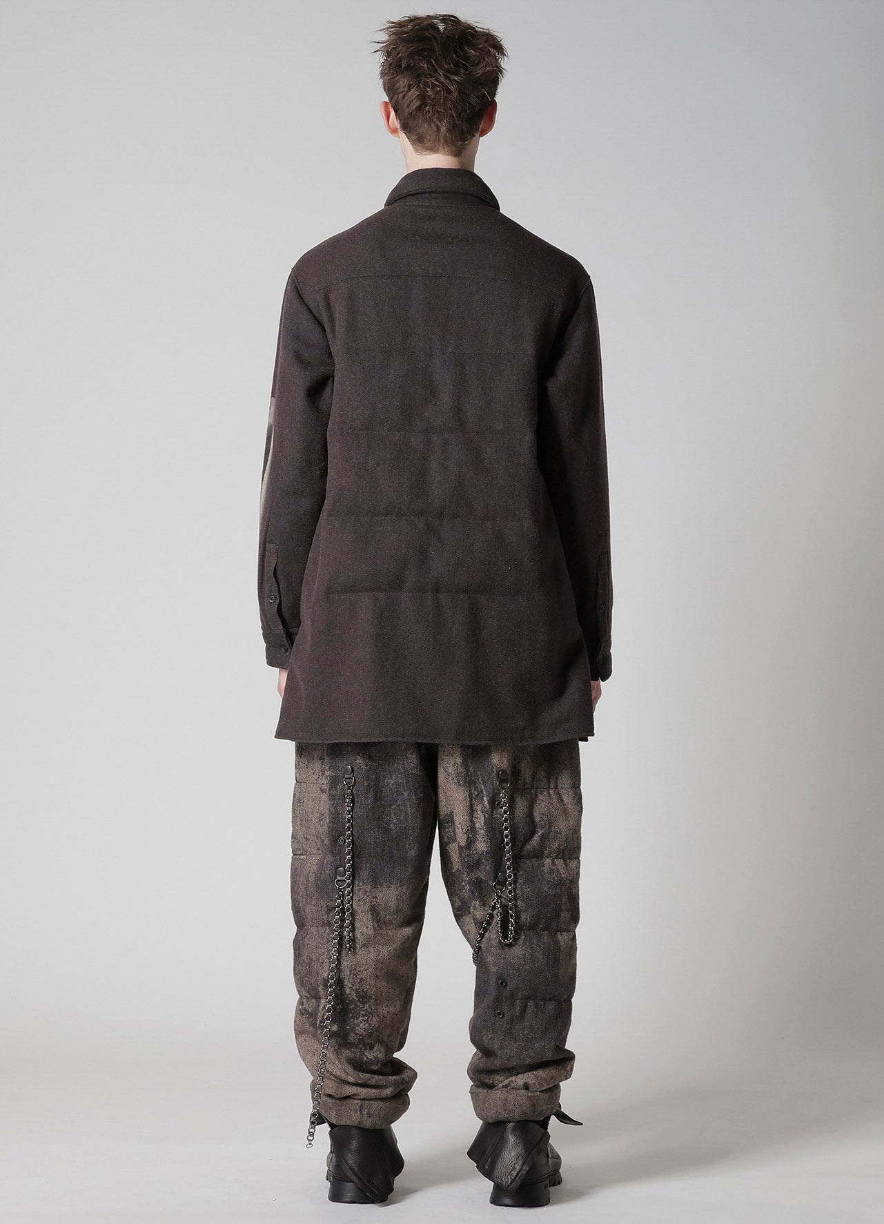 Ce chemisier matelassé saisissant de la collection Yohji Yamamoto POUR HOMME A/W 2025-26 marie la laine de Suffolk et de Mérinos pour une chaleur et une sensation luxuriante. Le design artistique du tissu est vibrant grâce à l'impression jet d'encre d'une usine de Kyoto, établissant un nouveau standard d'élégance pour la mode masculine.