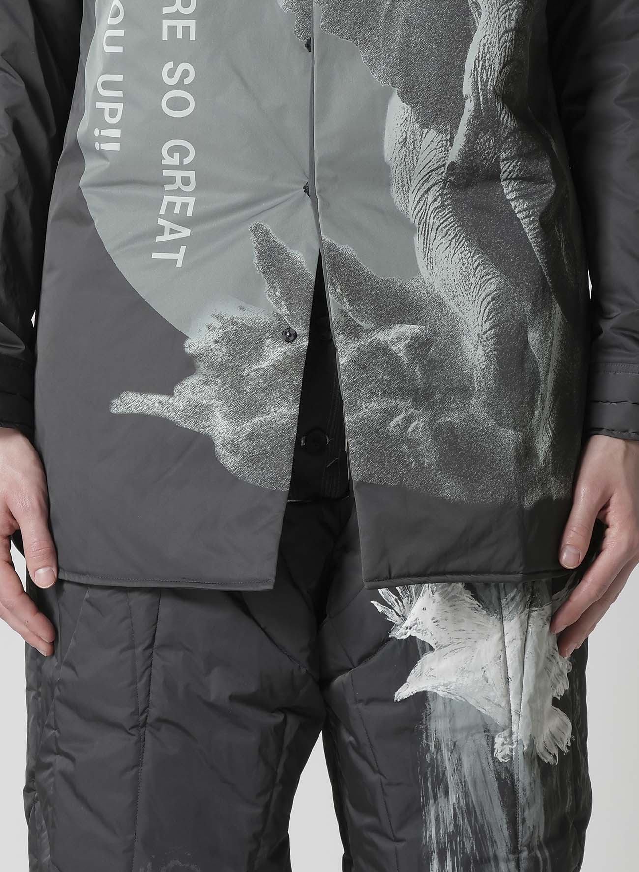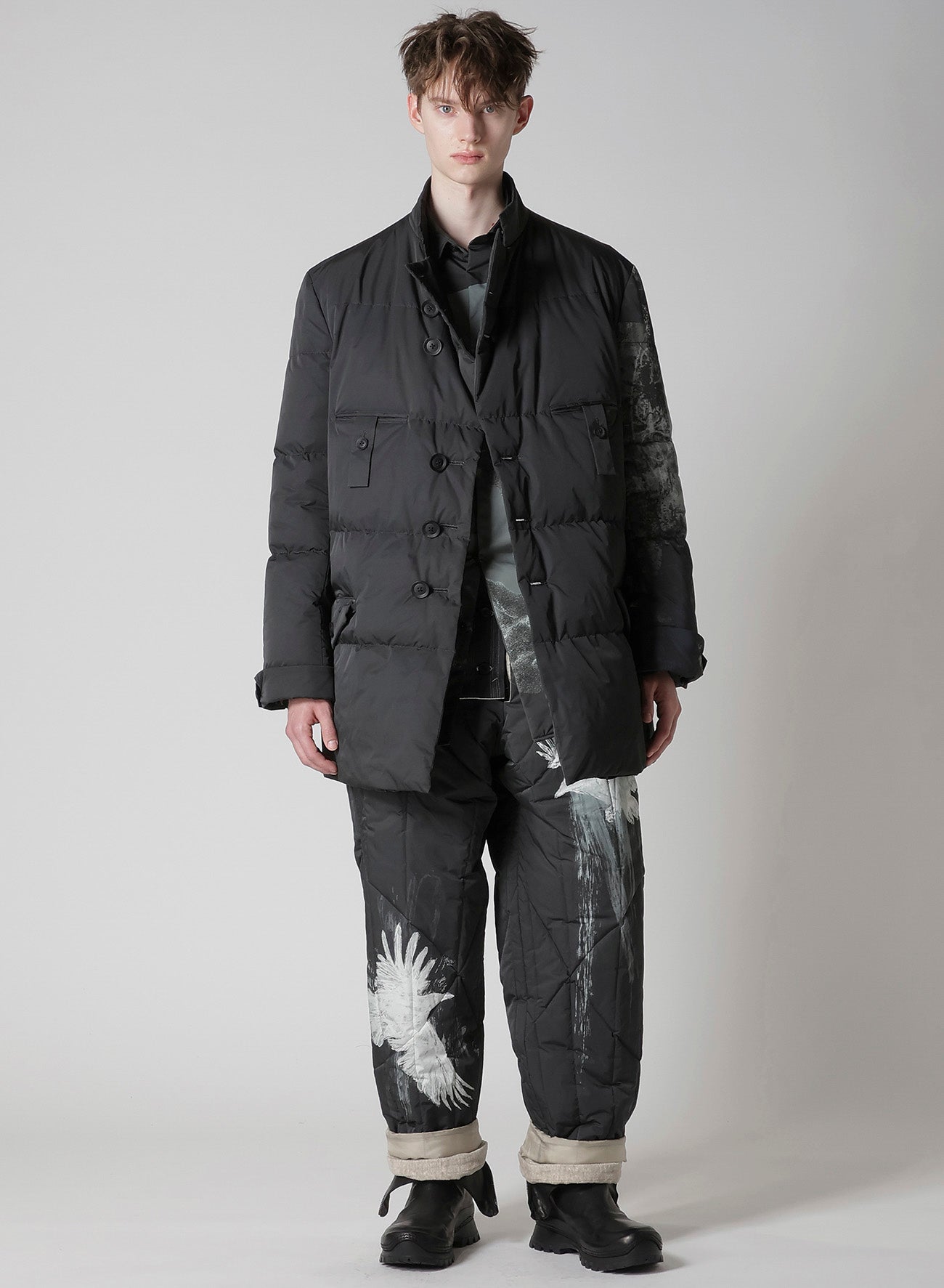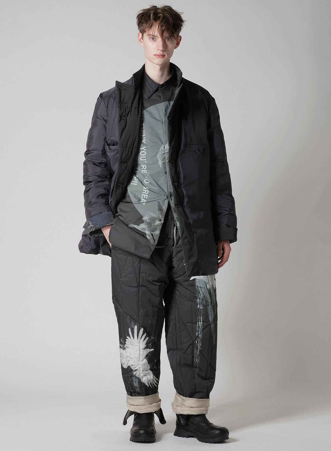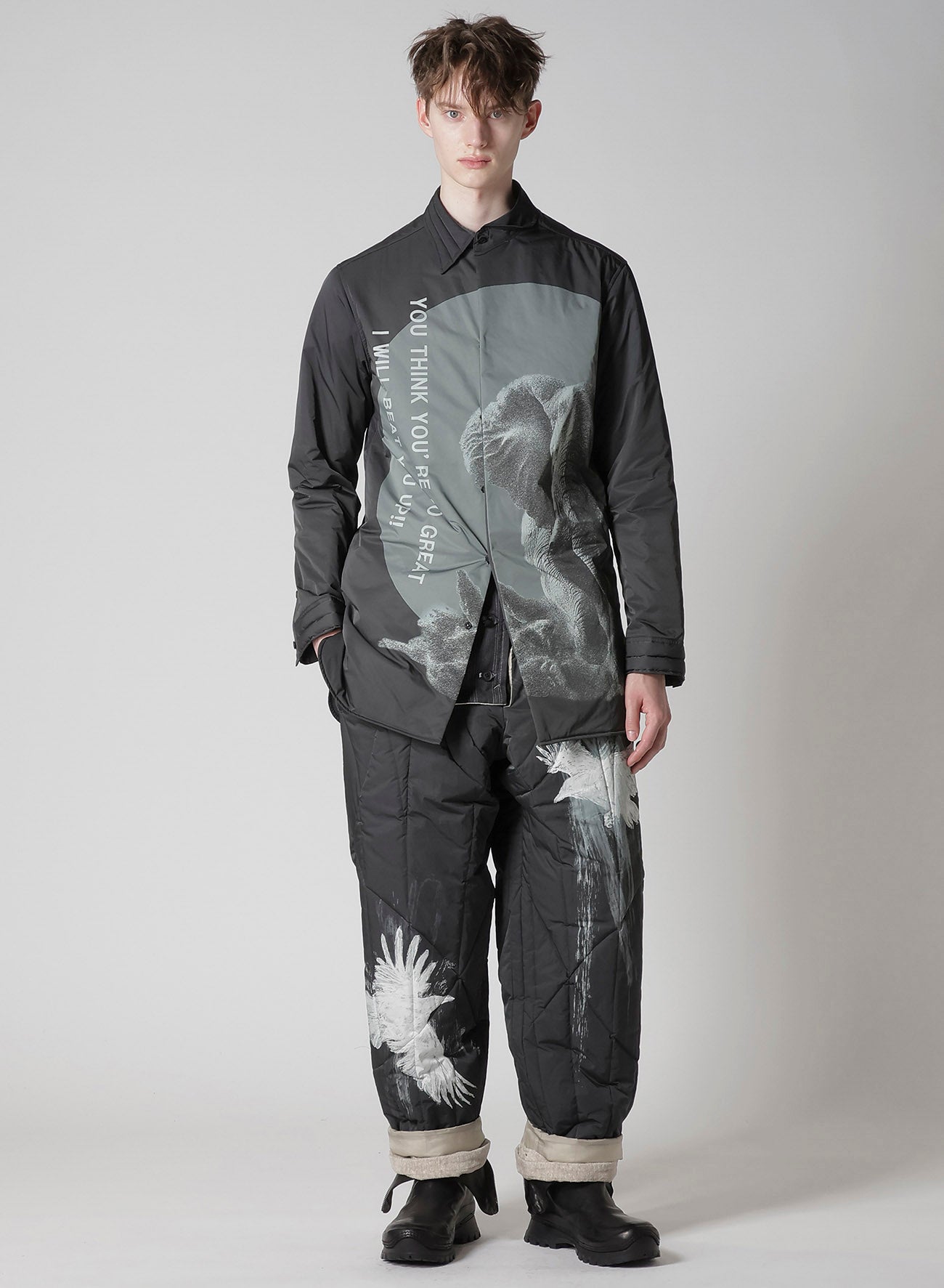 Le look présente une blouse à motif éléphant issue de la collection Yohji Yamamoto POUR HOMME A/W 2025-26, mettant en avant un tissu en Twill utilisant du fil de polyester dans la chaîne et la trame. Le motif unique d'éléphant est imprimé par jet d'encre dans une imprimerie de Kyoto, ajoutant une originalité à cette pièce remarquable.