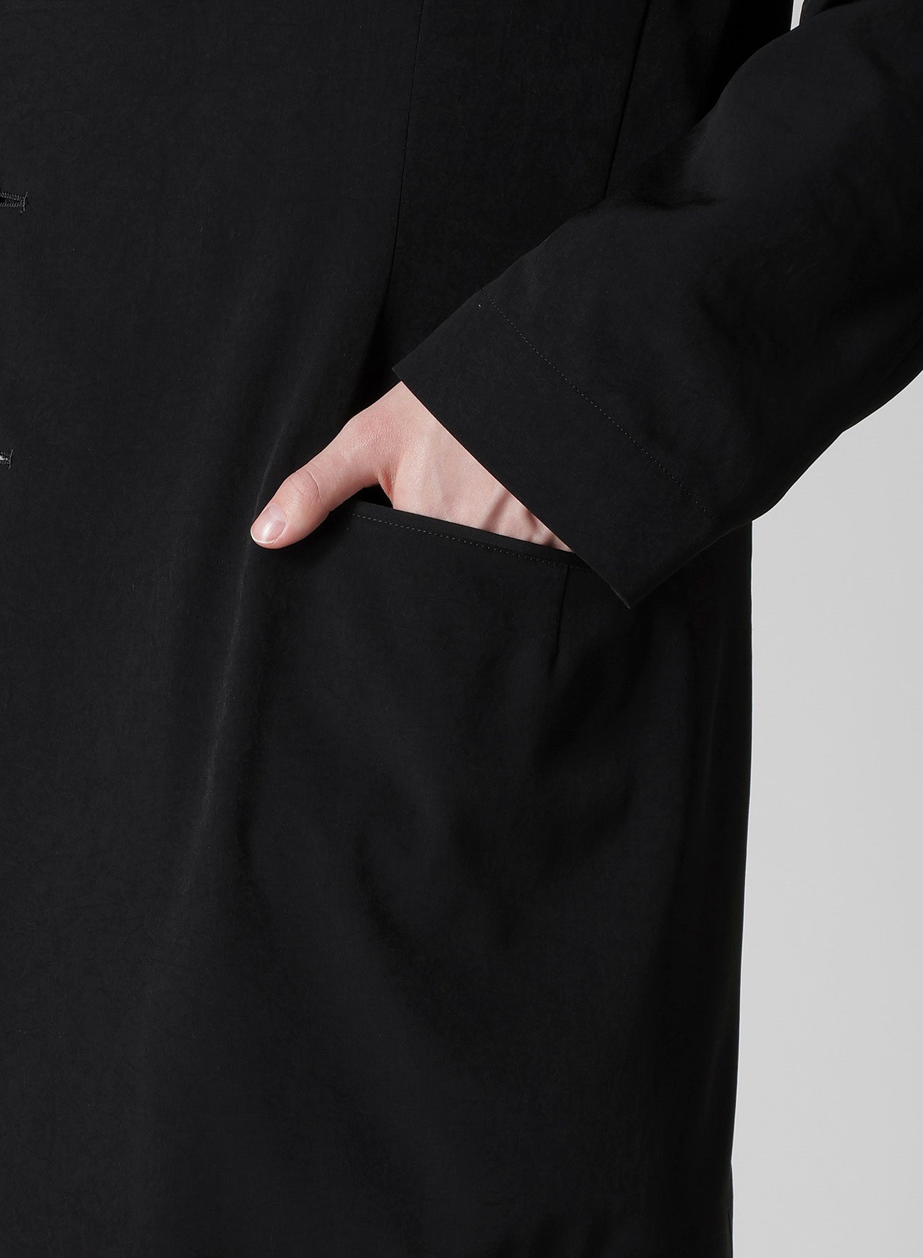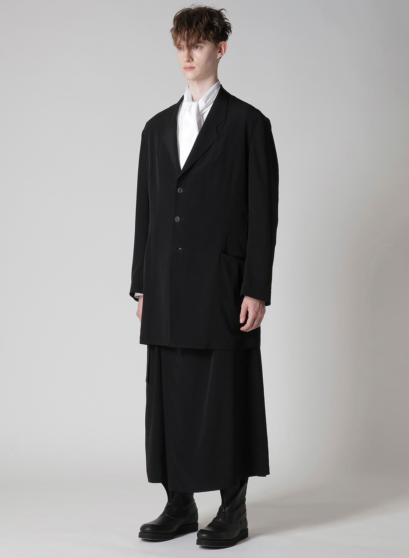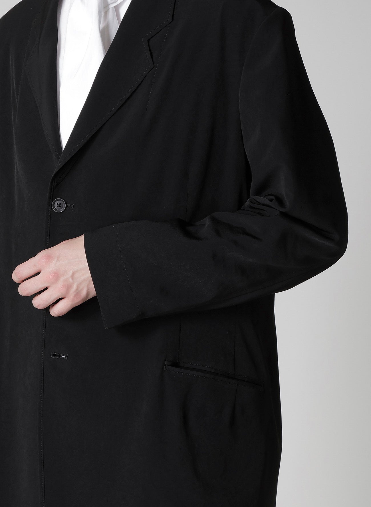 Cette veste combine triacétate et polyester avec un design de revers unique. Le matériau, une signature de Yohji Yamamoto, est reconnu pour son éclat doux et sa sensation luxueuse. Le tissage en toile plate, utilisant des fils de chaîne fortement torsadés, confère à la veste une drapée riche.