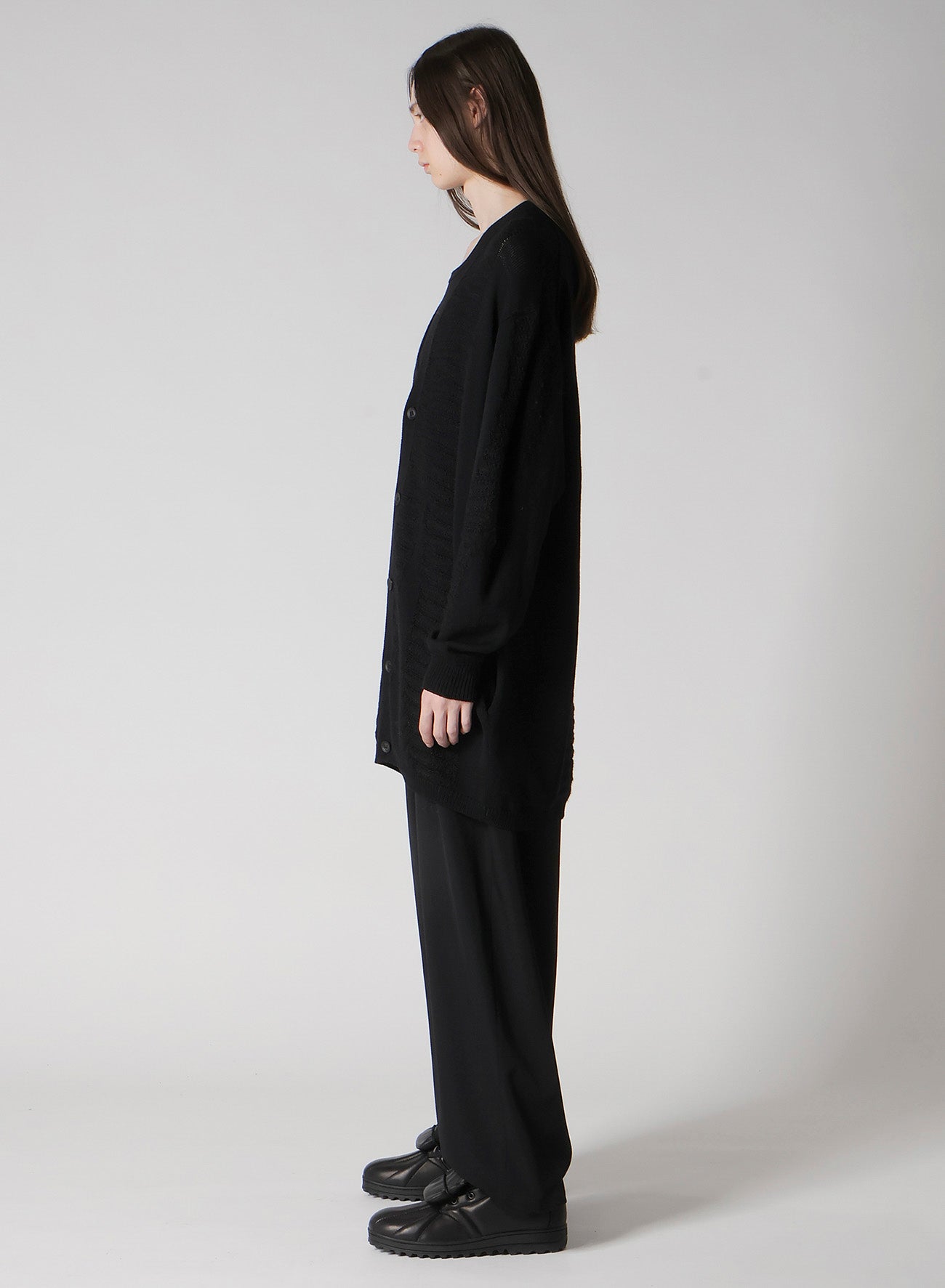 Ce cardigan à col en V présente un design unique utilisant des fils de laine et d'alpaga. Il combine la laine des gagnants australiens comme ingrédient principal, un matériau slub naturel et de l'alpaga fin. La caractéristique principale est son tricot texturé, créant un look expressif et unique.