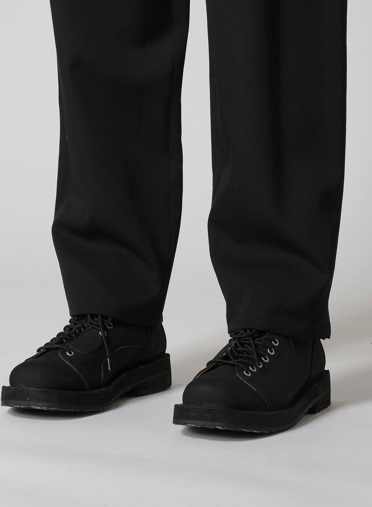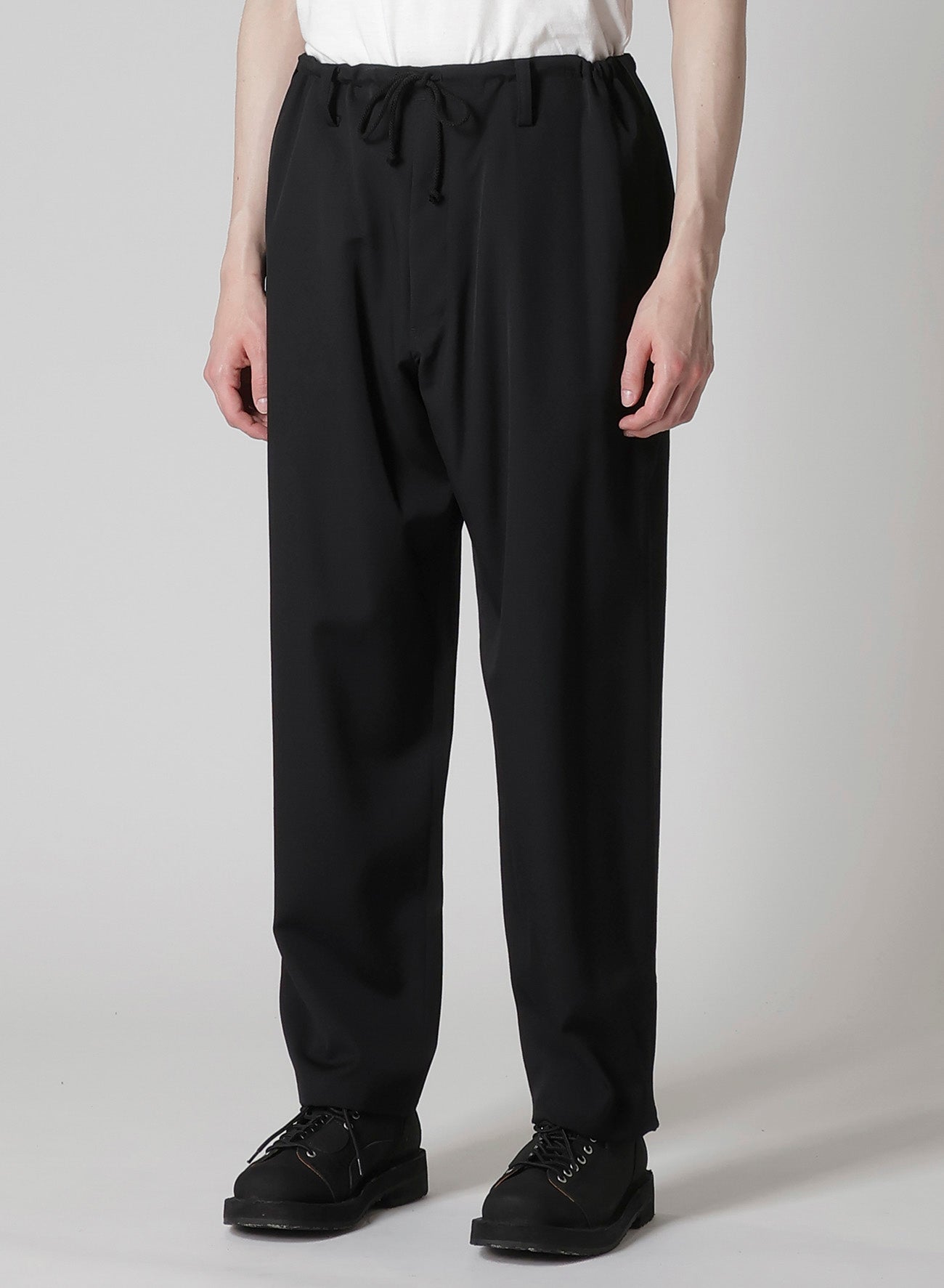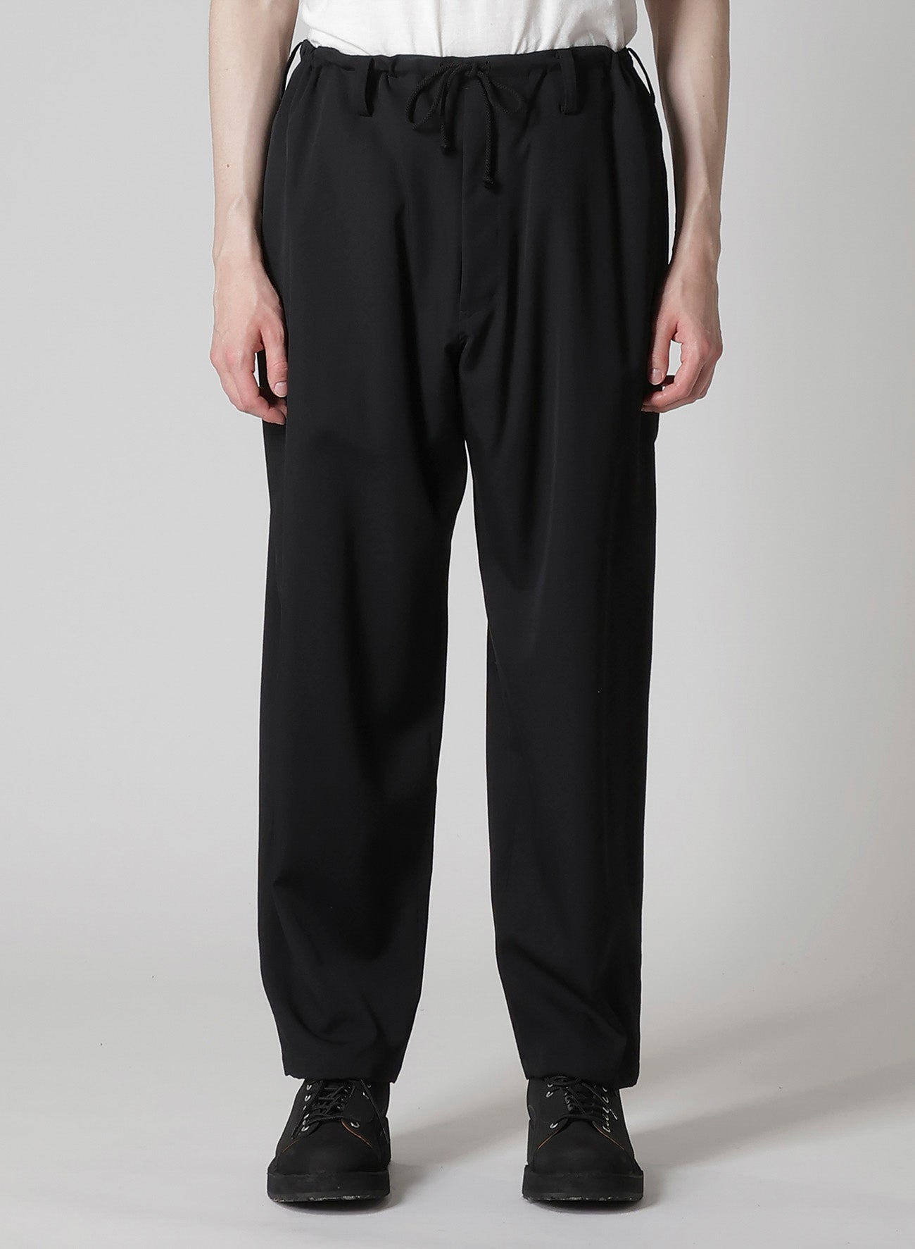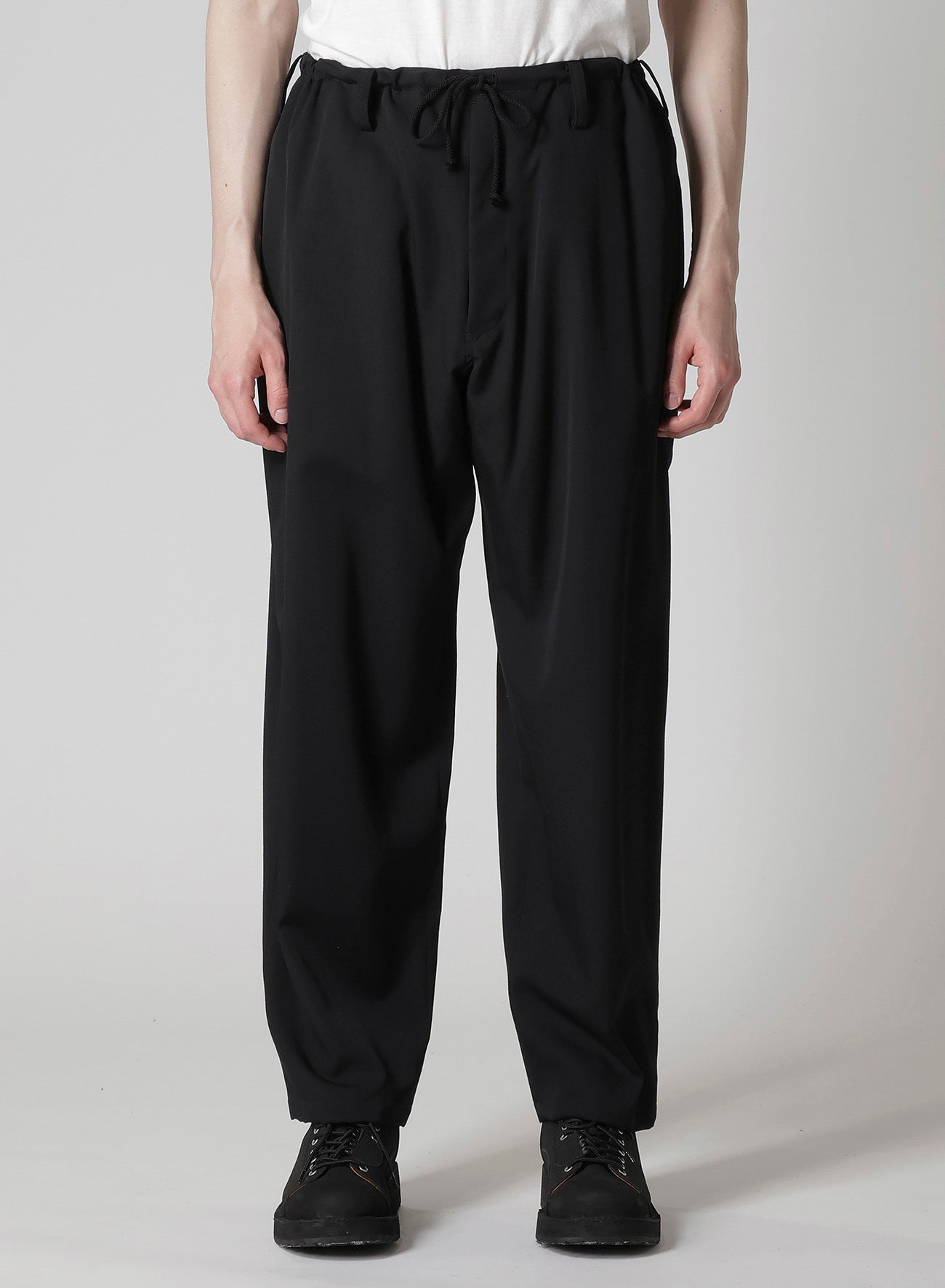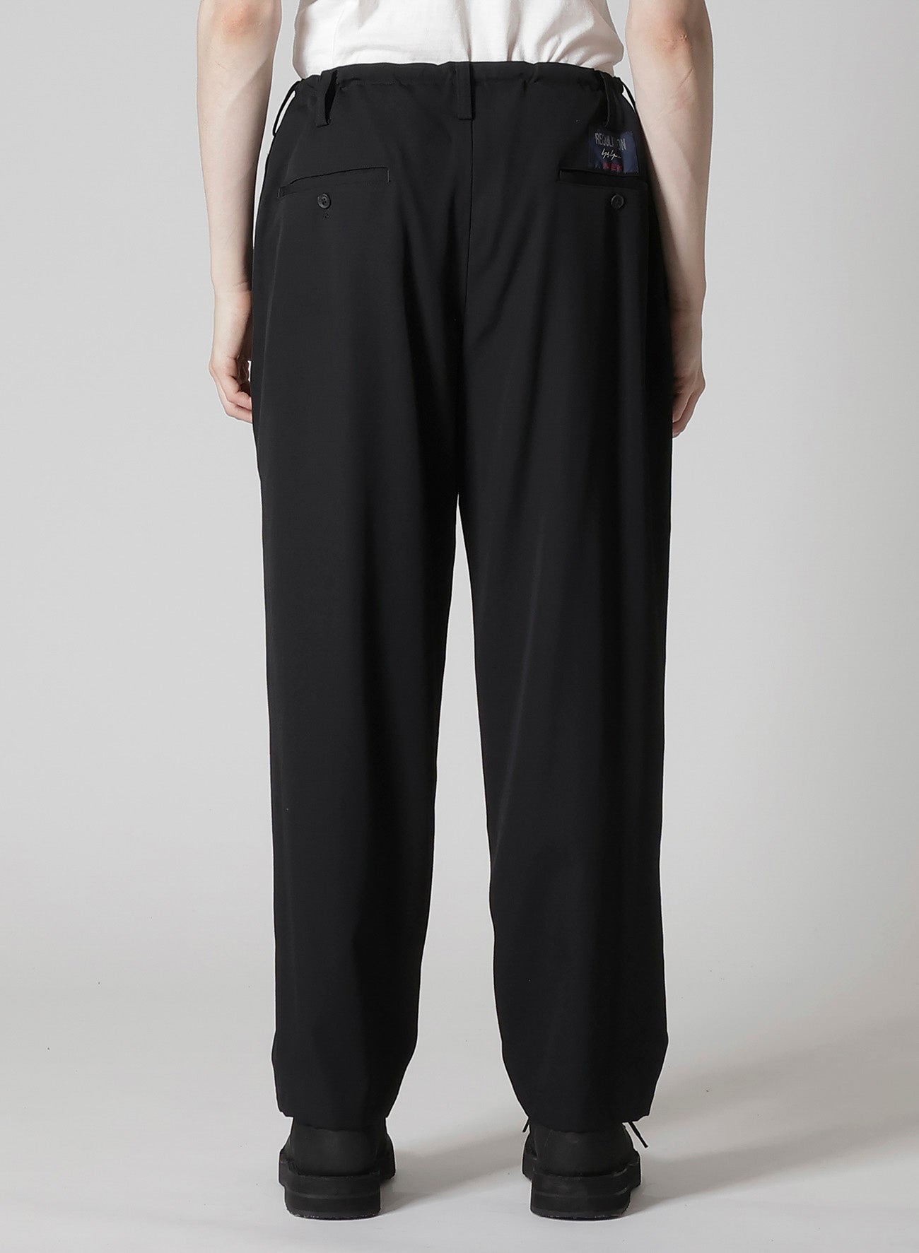 Les pantalons à nouer à la taille REGULATION Yohji Yamamoto, fabriqués en gabardine de laine signature, incarnent la polyvalence, s'harmonisant aisément avec diverses collections Yohji Yamamoto. Leur qualité de drapée douce, issue de la gabardine de laine lustrée, les distingue.