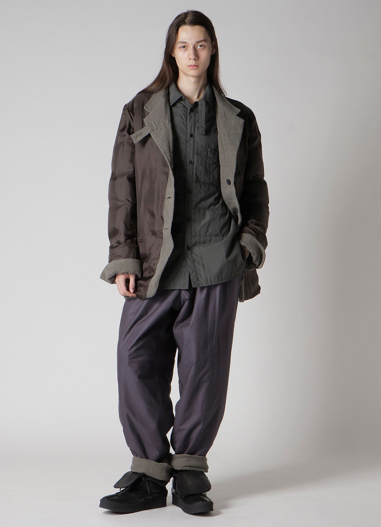 La collection A/W 2025-26 de Yohji Yamamoto POUR HOMME présente des pantalons avec un ourlet retroussé luxueusement conçu. Fabriqués à partir d'une base de LINEN combinée à du silk noil, ces pantalons offrent une texture unique avec des caractéristiques neppy. Ils sont teints à la main par des artisans de Kyoto Nishijin avec de l'encre de la préfecture de Nara.