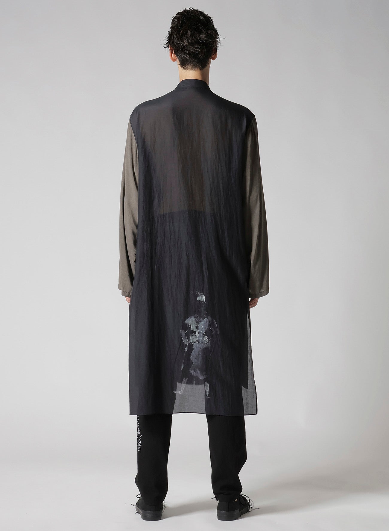 Un long chemisier de la collection Yohji Yamamoto POUR HOMME S/S 2025 associe soie brillante et rayonne teinte à l'encre Nishijin de Kyoto. Les artisans teignent à la main avec de l'encre de Nara, et le tissu est imprimé avec des croquis et messages manuscrits du designer. - Fabriqué en soie et rayonne - Teint à l'encre par des artisans de Kyoto - Comprend des croquis et messages du designer