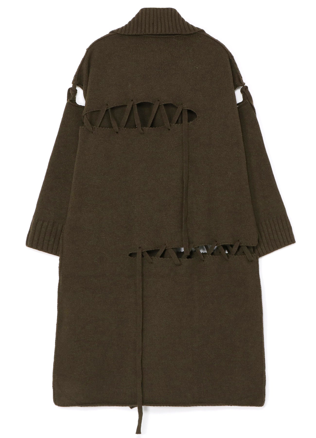 Ce tricot, réalisé en tricotant avec des fils doublés, donne un tissu robuste adapté comme vêtement d'extérieur. Des trous incorporés pour le cordon de serrage, créés avec des points cachés, et fabriqués à partir du même matériau, améliorent son design lacé frappant.