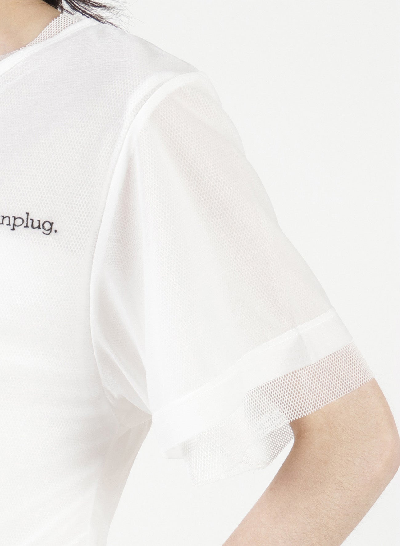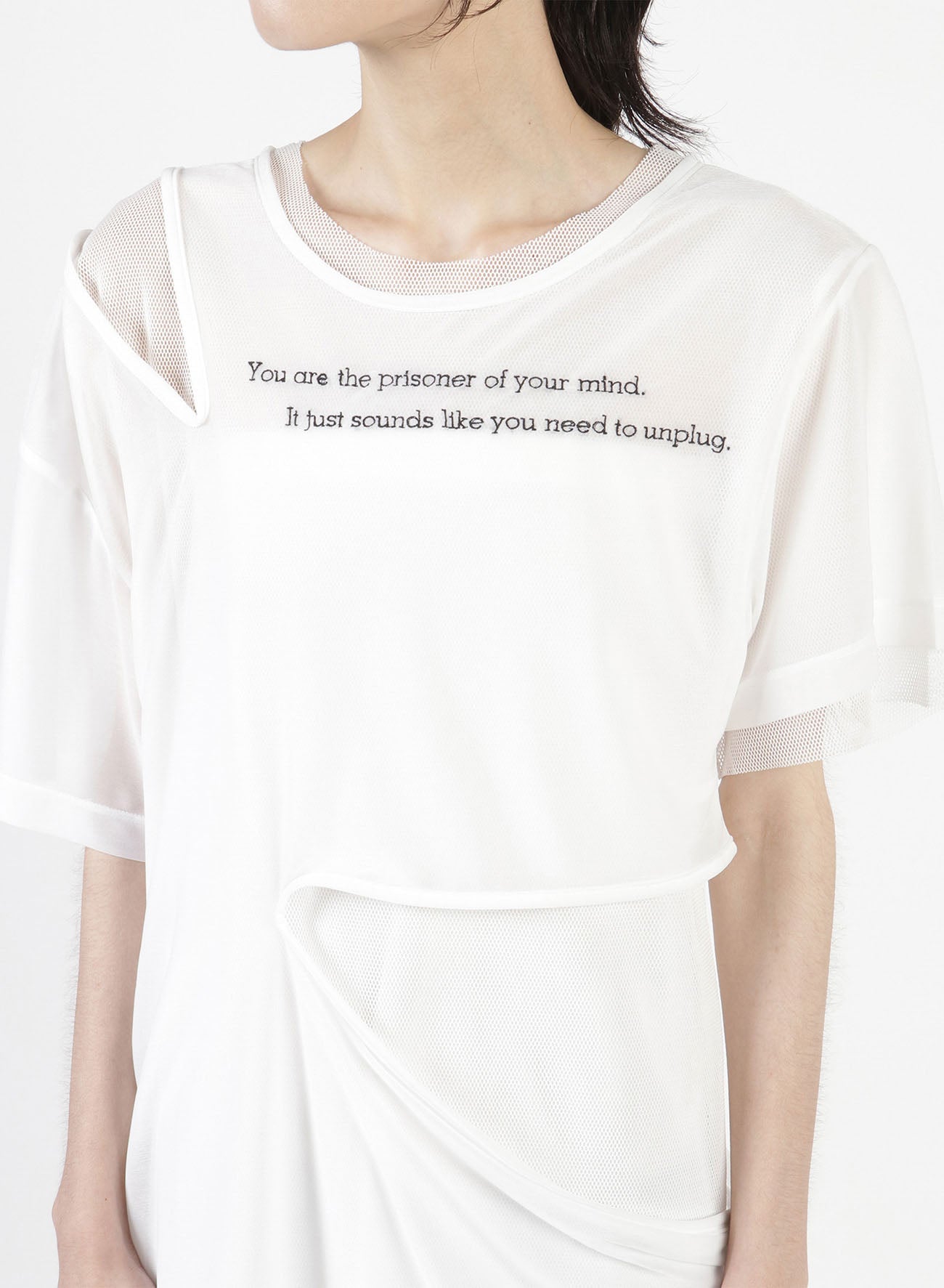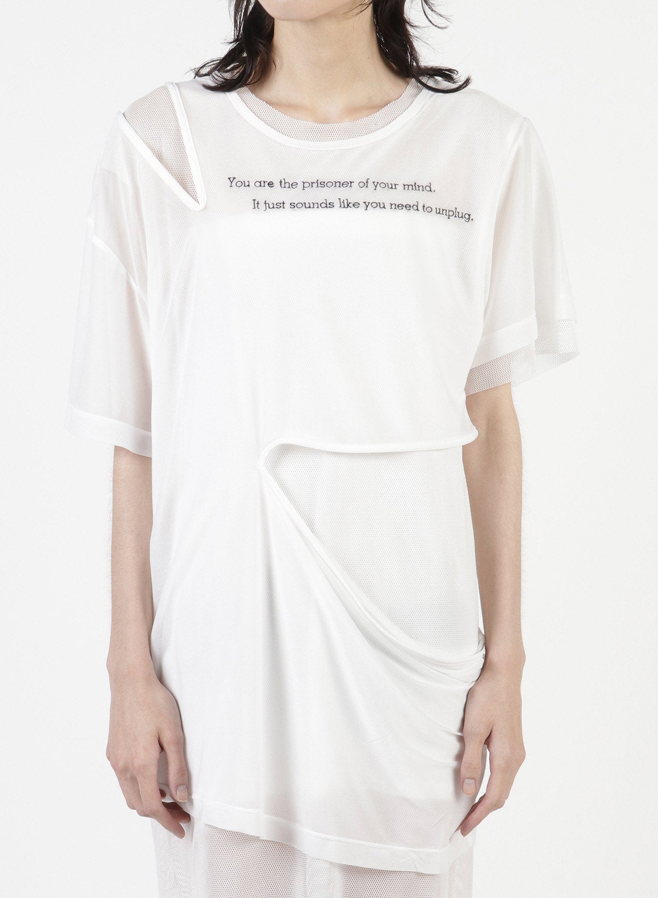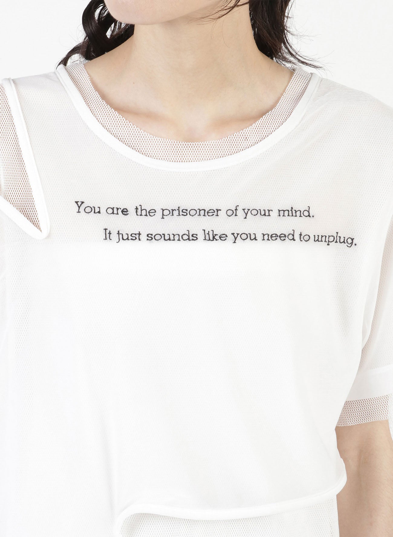 Ce haut est fabriqué à partir de tulle en fil de polyester tissé lâchement, offrant une élasticité modérée et une apparence en filet. Le matériau transparent est brodé de messages, accentuant sa finition délicate. Des fentes audacieuses sur les épaules et le corps font ressortir cette pièce, offrant un look printanier-été aéré et élégant.