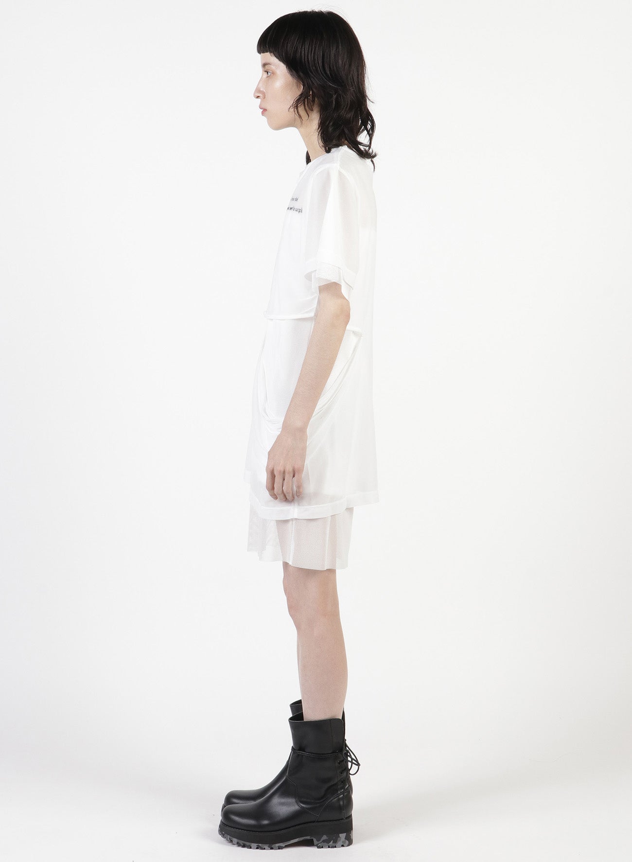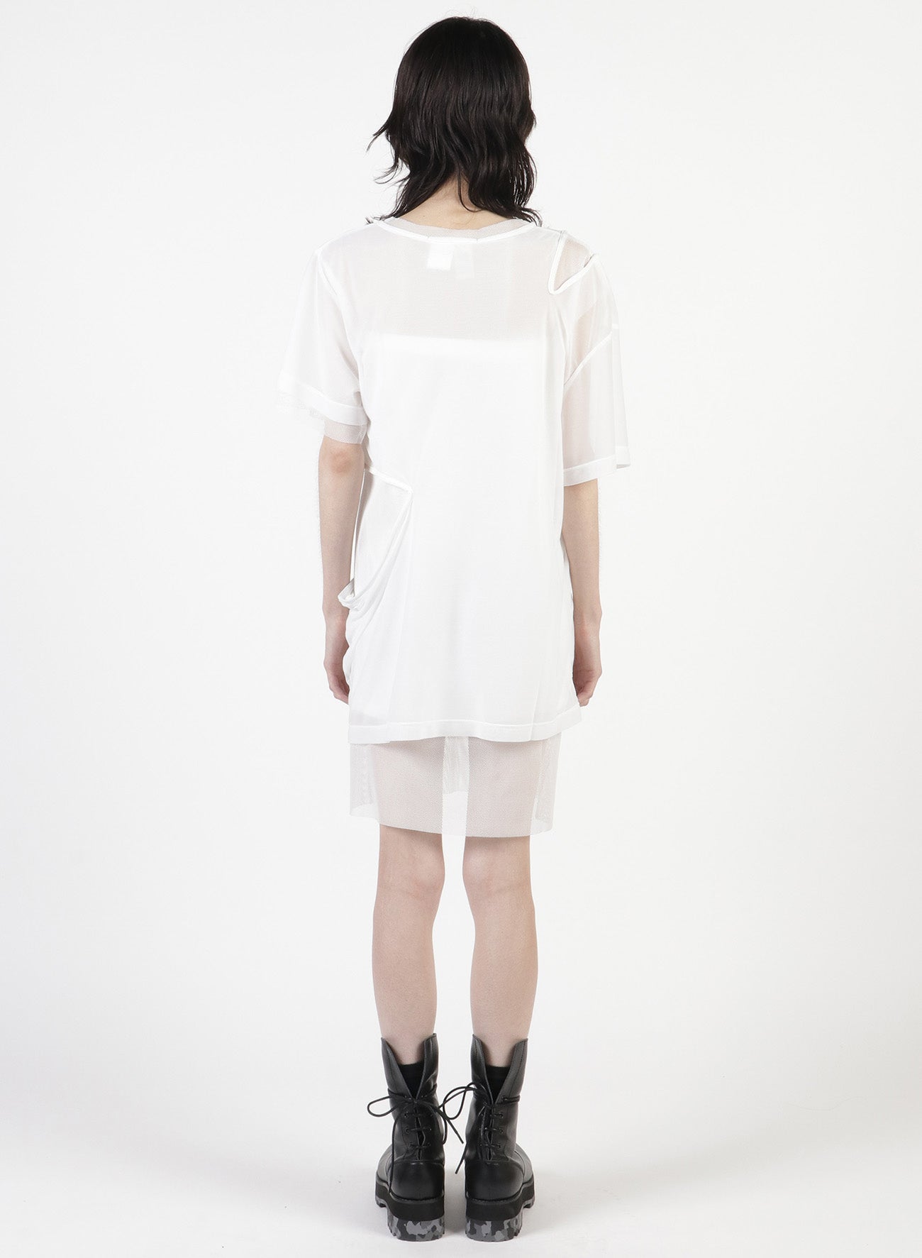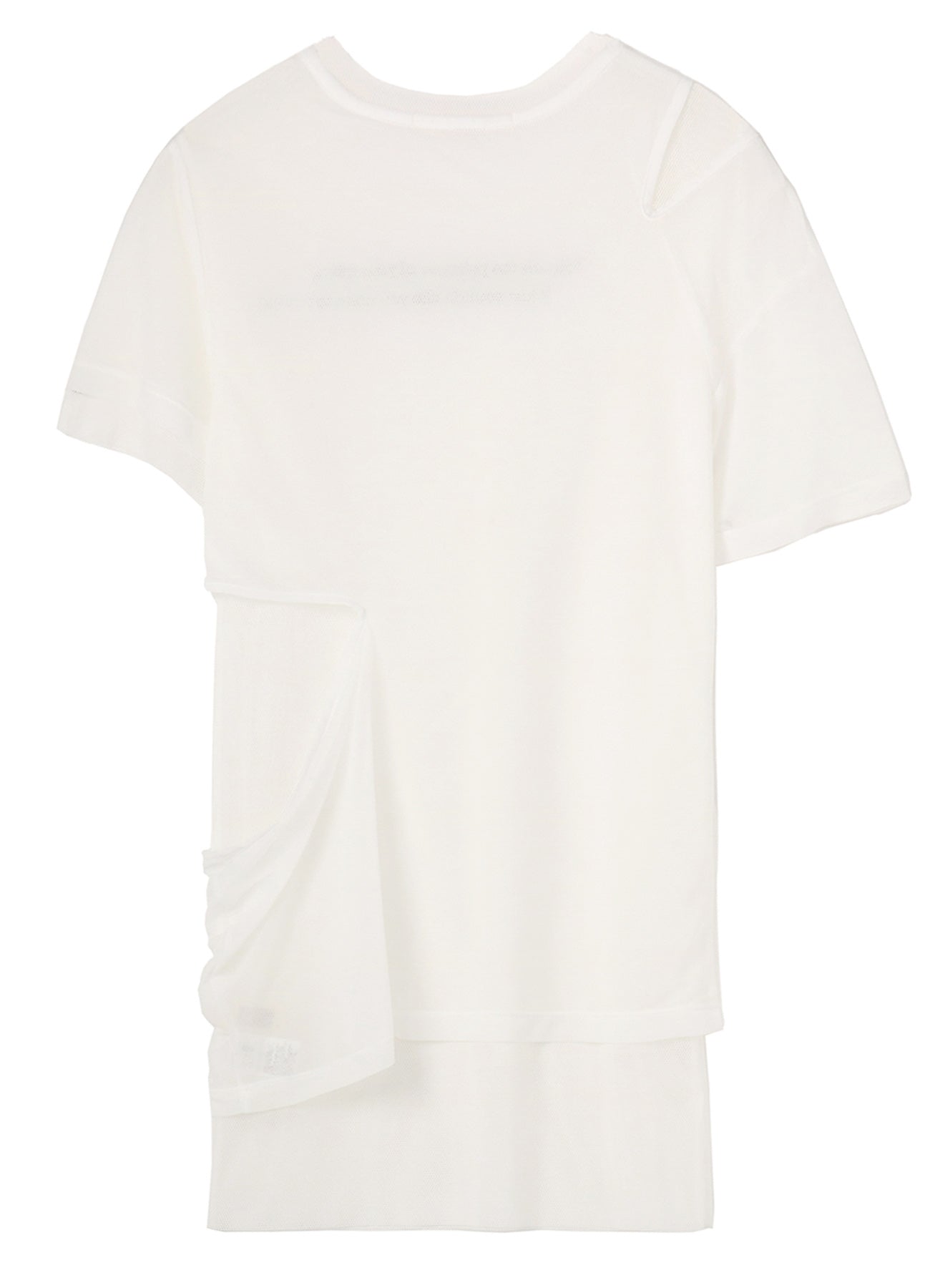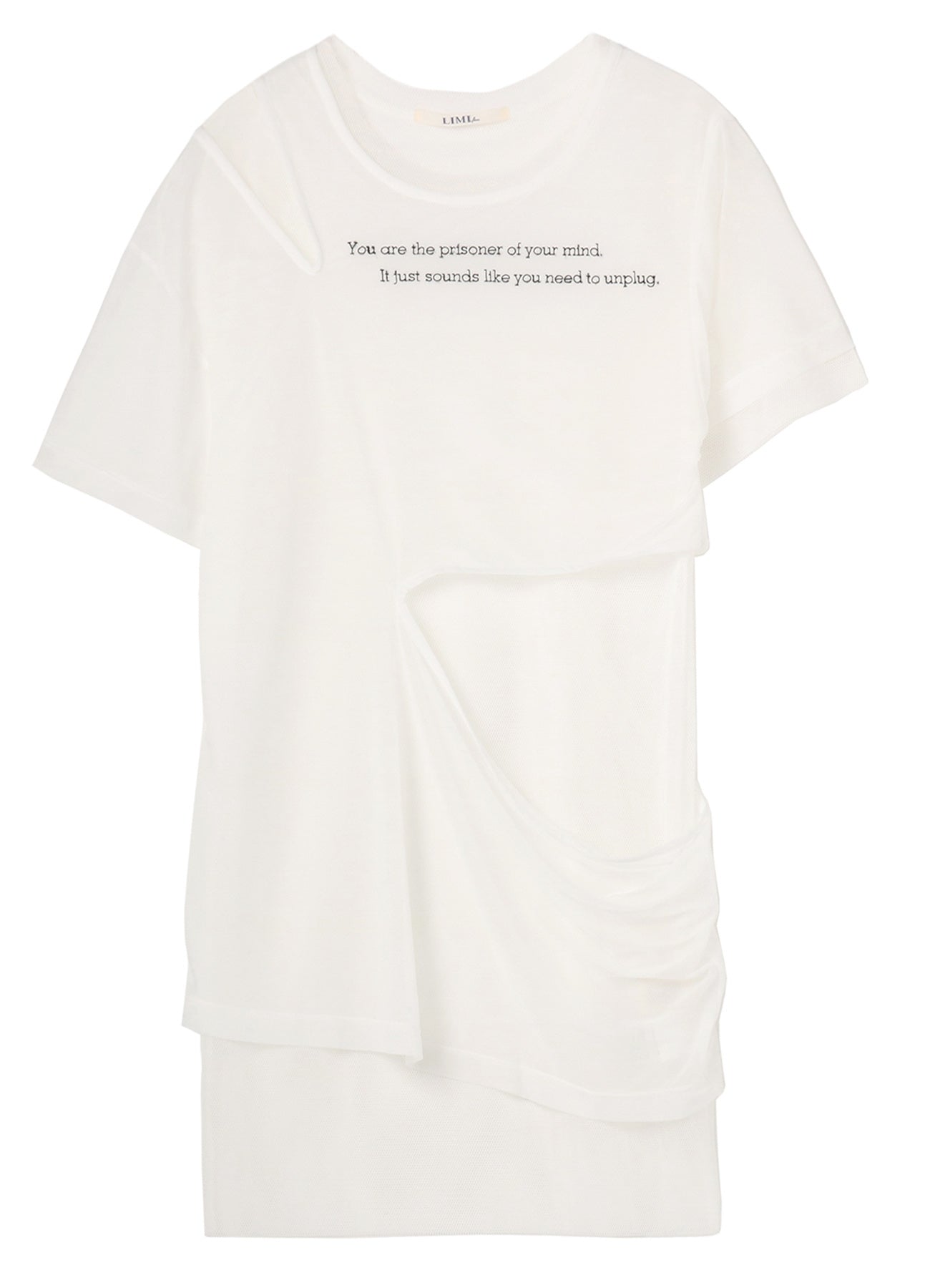 Ce haut est fabriqué à partir de tulle en fil de polyester tissé lâchement, offrant une élasticité modérée et une apparence en filet. Le matériau transparent est brodé de messages, accentuant sa finition délicate. Des fentes audacieuses sur les épaules et le corps font ressortir cette pièce, offrant un look printanier-été aéré et élégant.