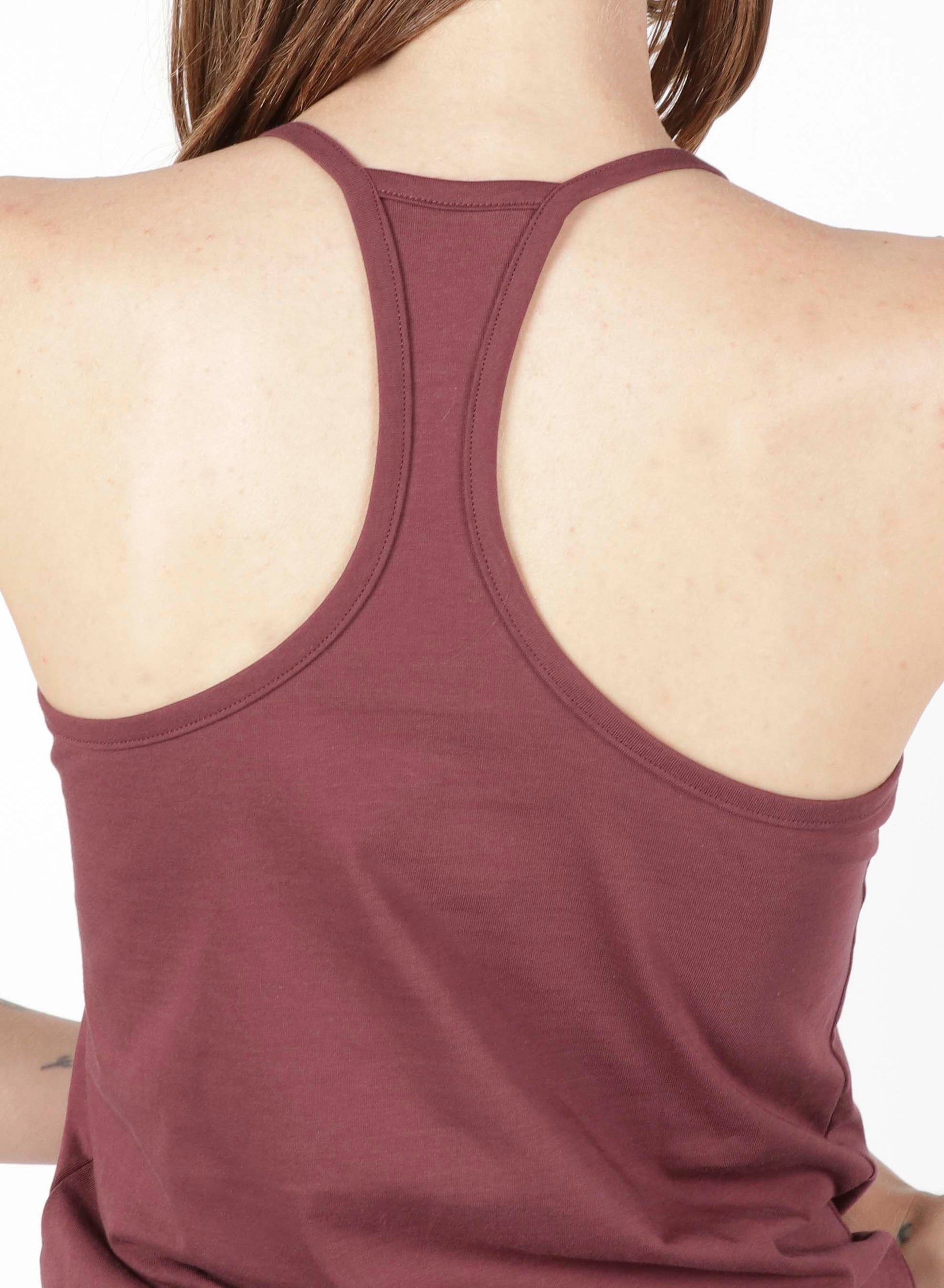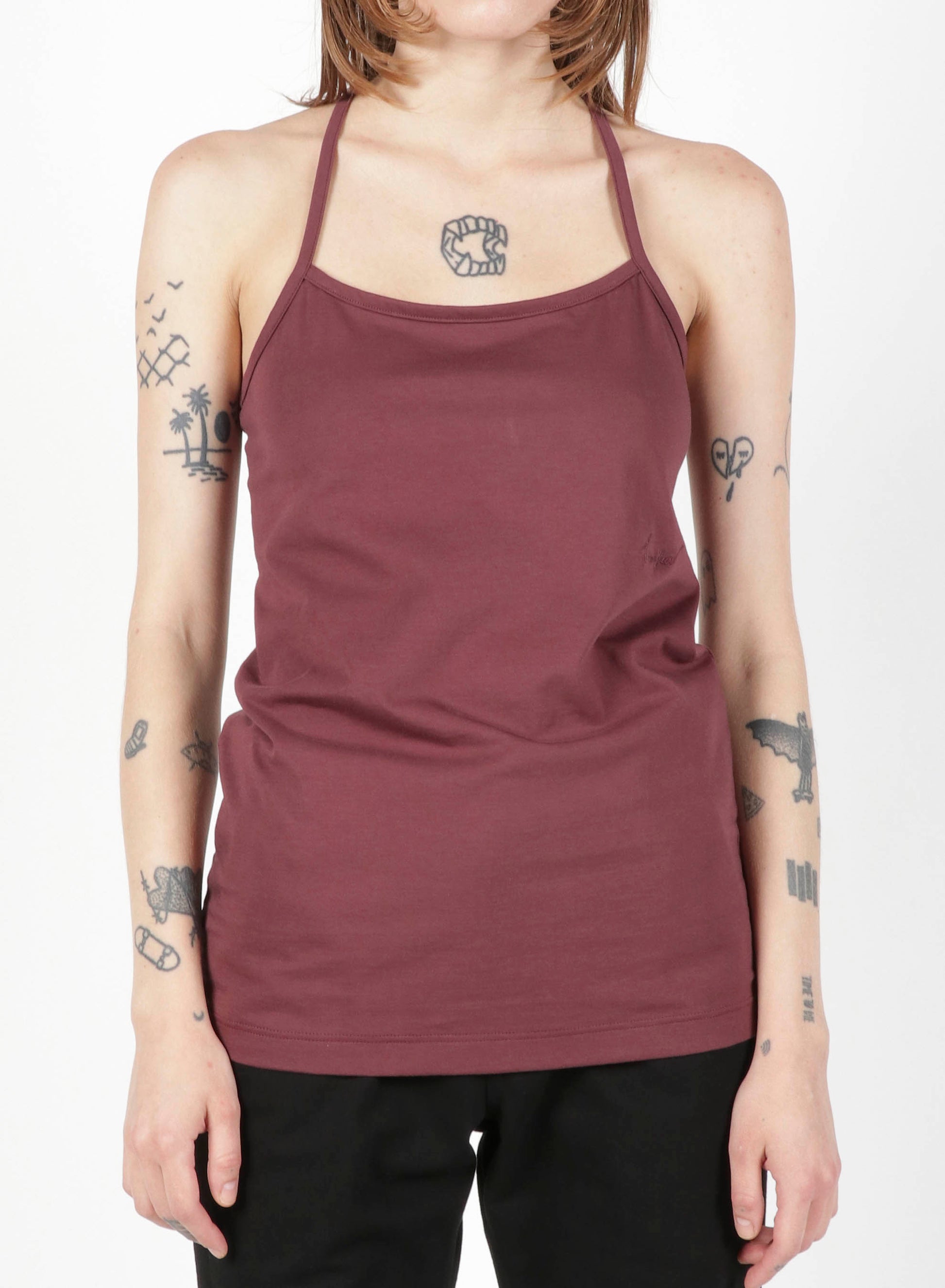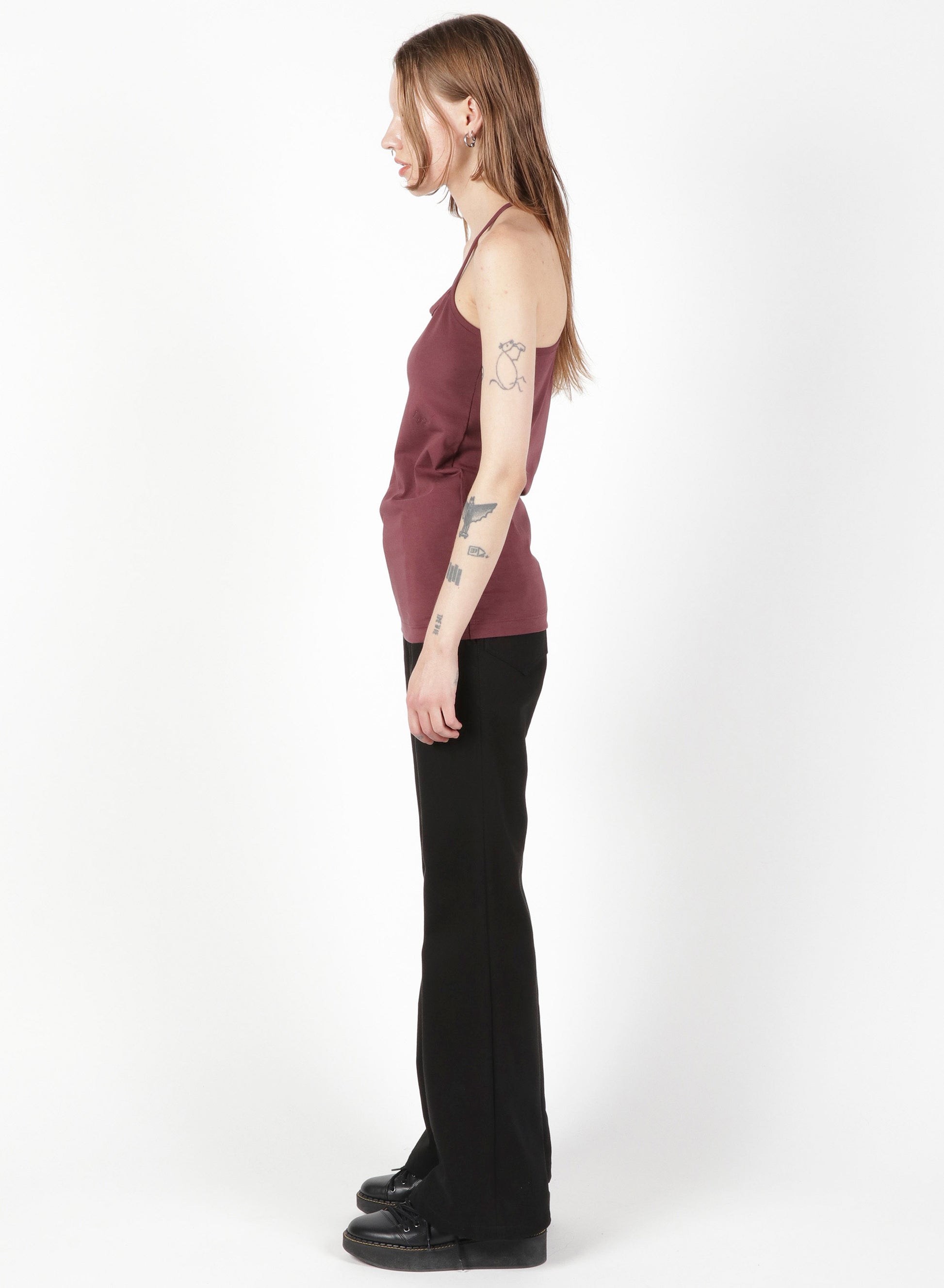 Ce débardeur est fabriqué à l'aide d'une technique de tricot à haute jauge avec un fil épais, ce qui donne un point de couture uni ferme. Le fil subit un traitement pour réduire le peluchage, créant une surface claire et une texture lisse. Le logo de la marque est subtilement brodé en cursive, ce qui le rend parfait comme sous-vêtement.