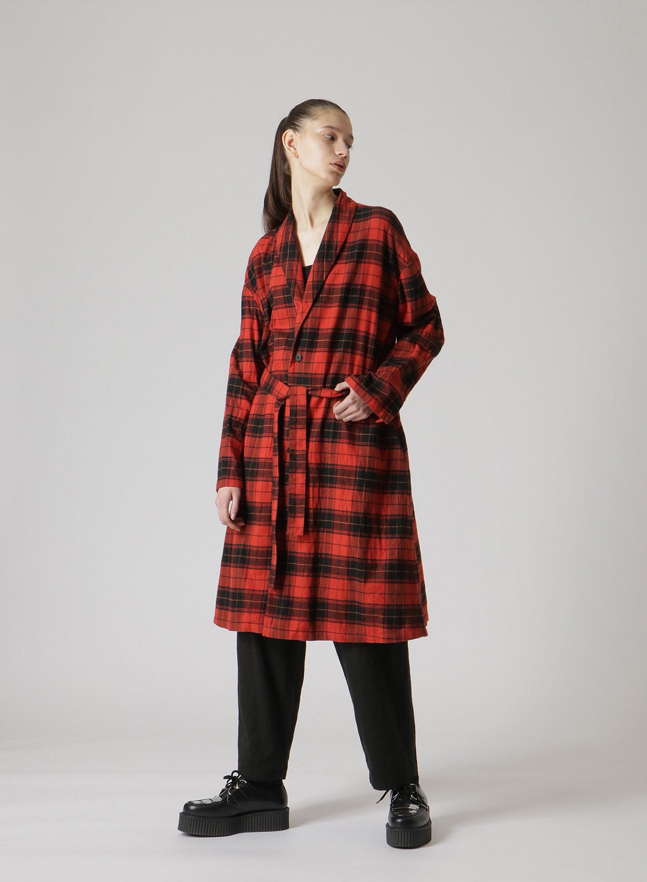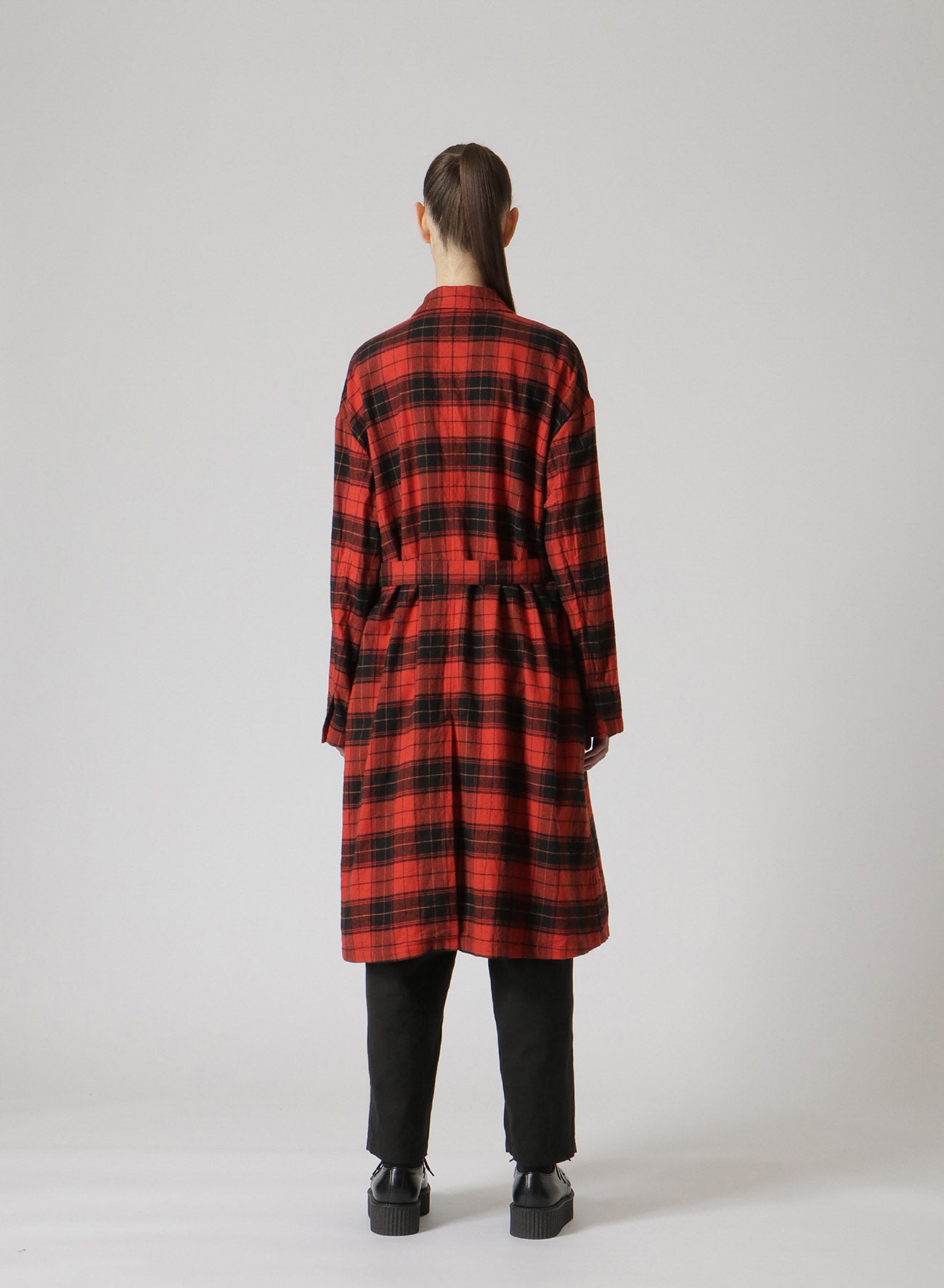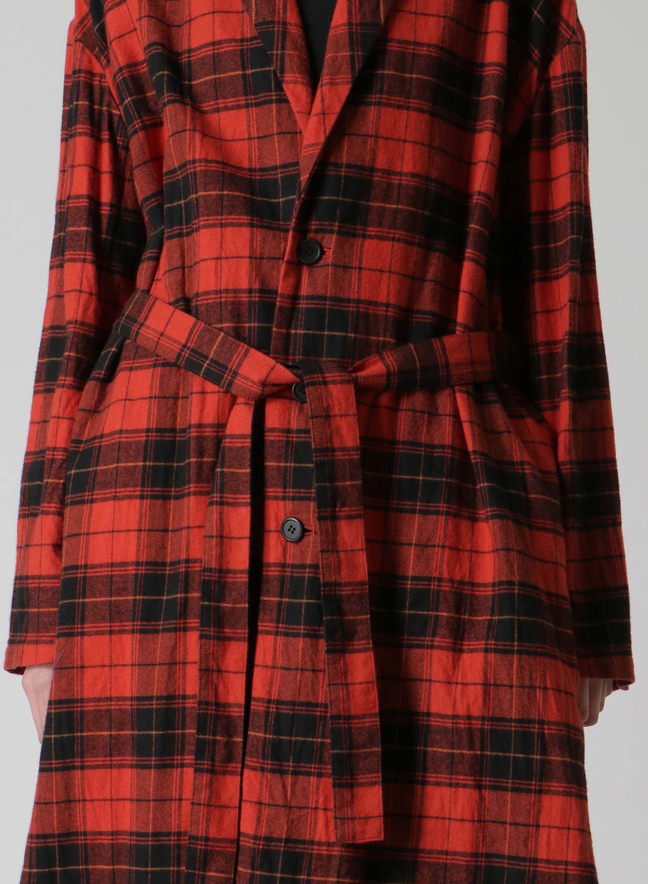 Un long manteau en coton doux et chaud avec un motif à carreaux et une texture en tissu brossé. Il dispose de passants de ceinture à la taille pour un ajustement personnalisable. Il est livré avec une ceinture à carreaux assortie, mais les utilisateurs peuvent la remplacer par leur propre ceinture pour un look personnalisé.