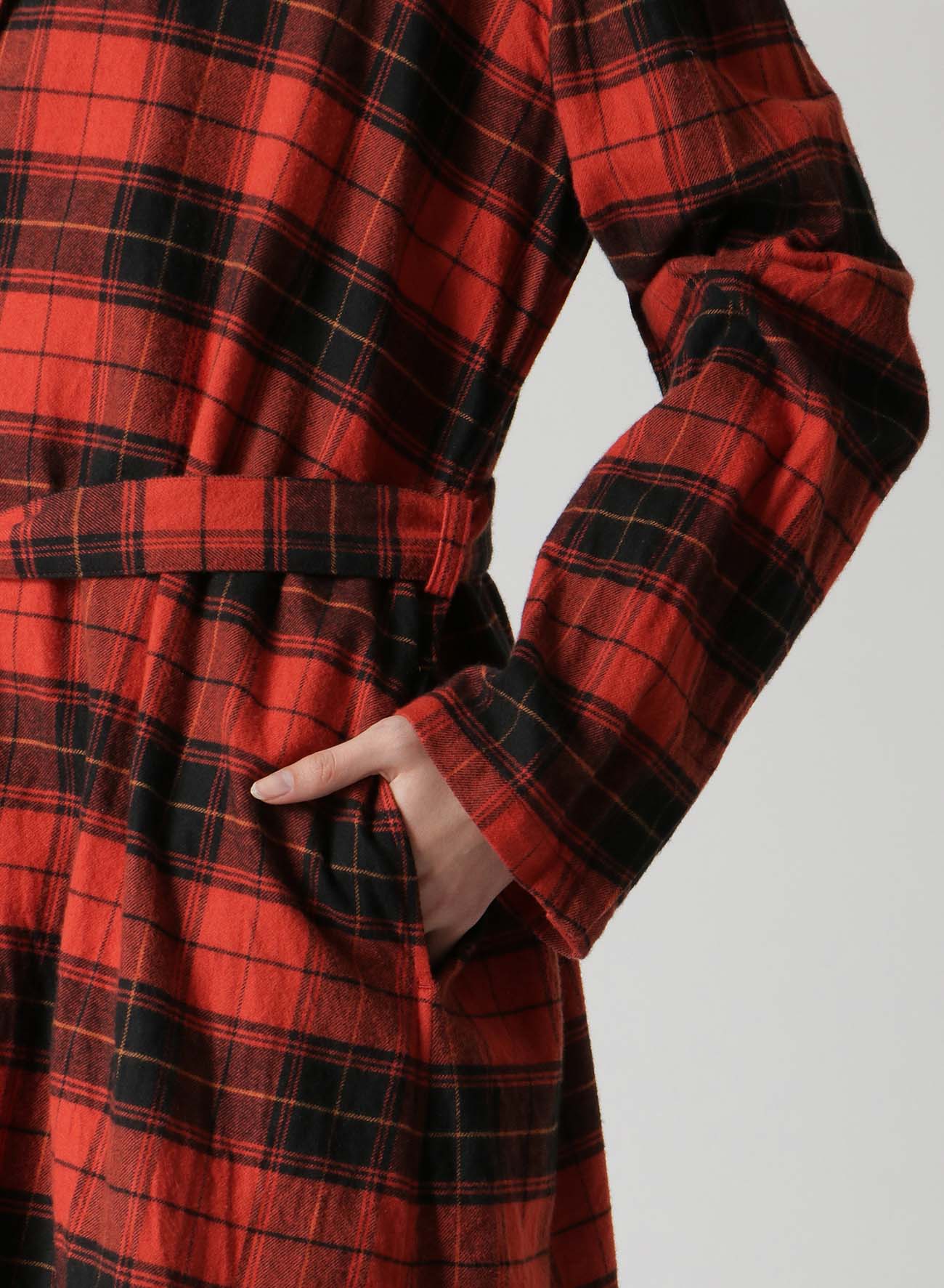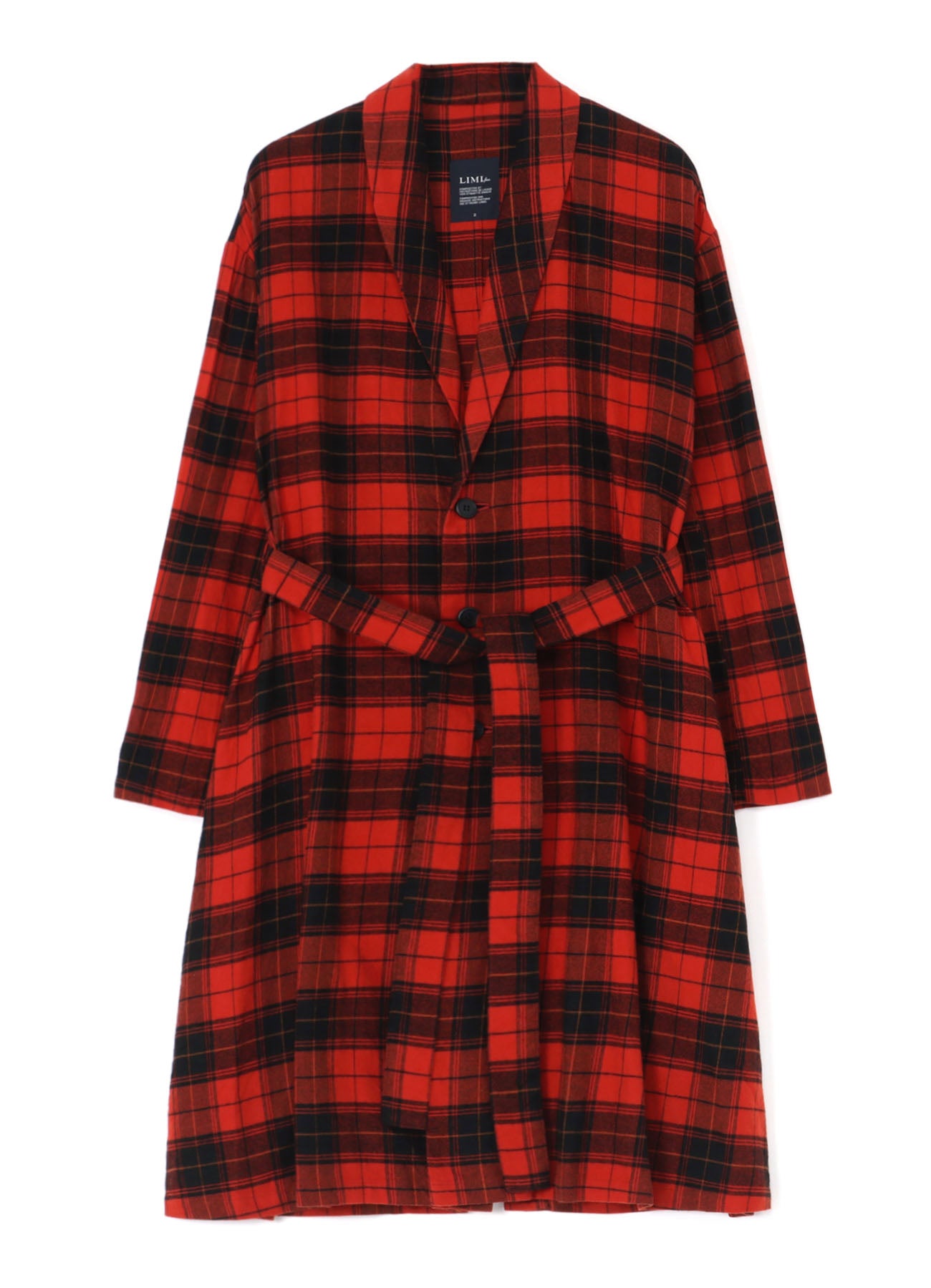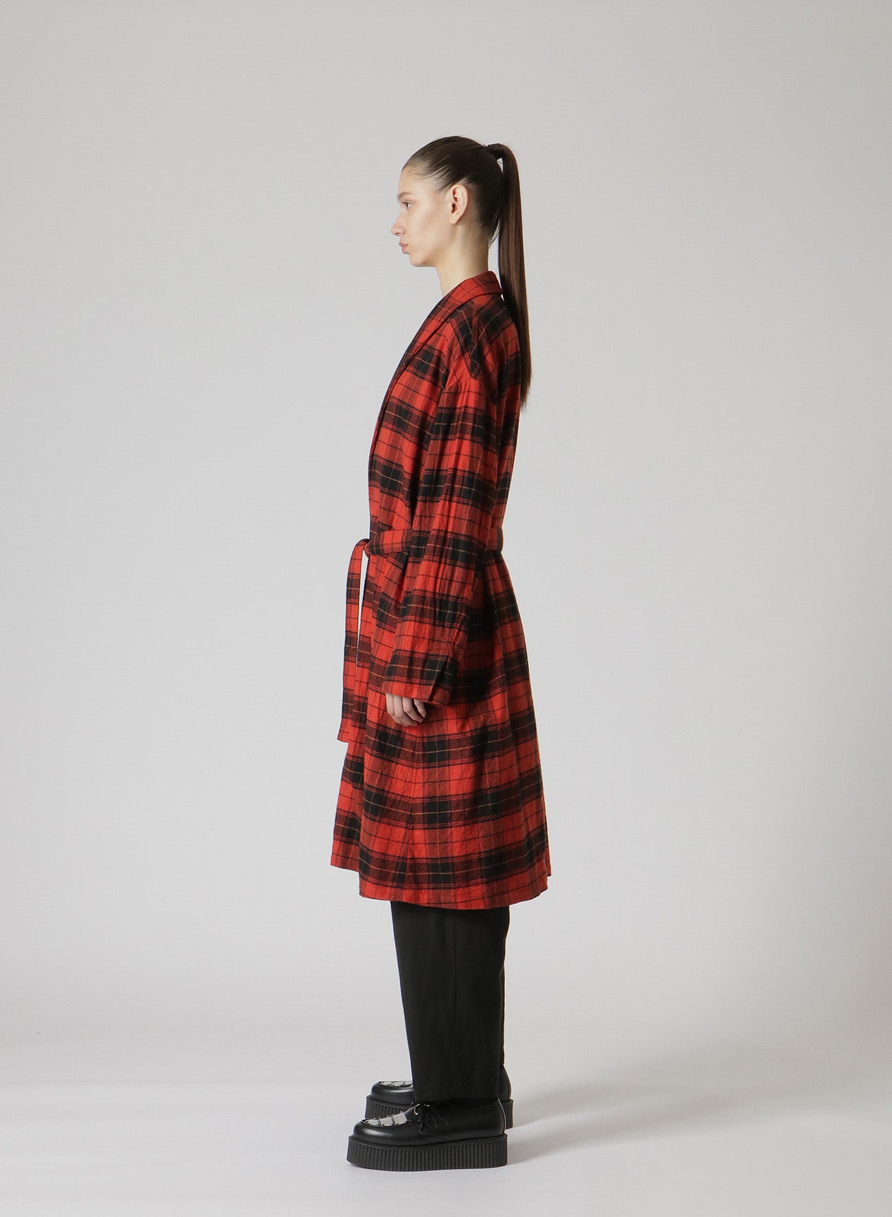 Un long manteau en coton doux et chaud avec un motif à carreaux et une texture en tissu brossé. Il dispose de passants de ceinture à la taille pour un ajustement personnalisable. Il est livré avec une ceinture à carreaux assortie, mais les utilisateurs peuvent la remplacer par leur propre ceinture pour un look personnalisé.