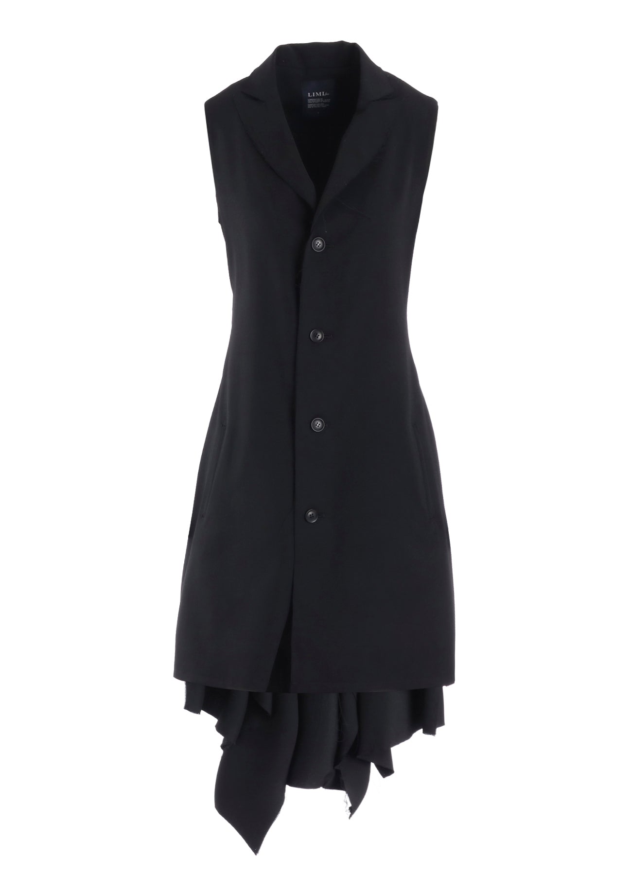 This gabardine fabric is characterized by its elegant drape and soft touch. The silhouette features voluminous shoulders, creating a striking presence. The overlapping front design and vertical lines offer a clean impression.