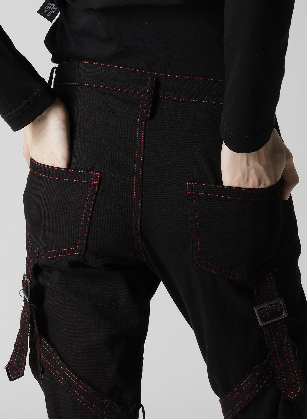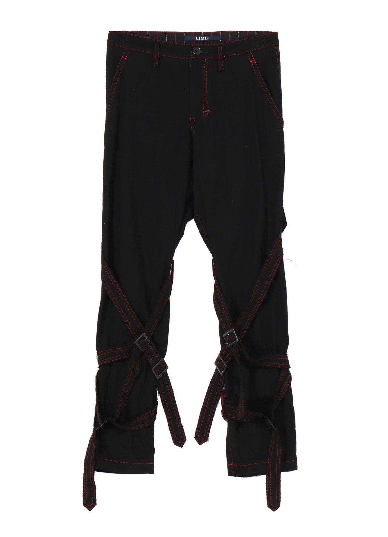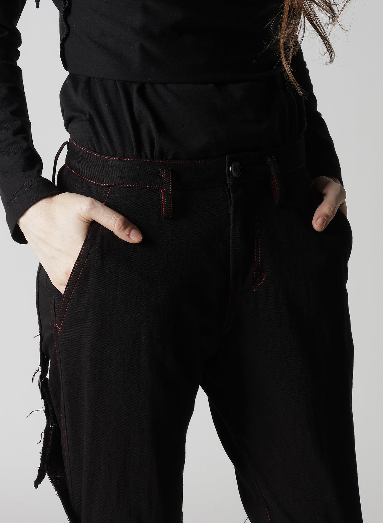 Ce pantalon en denim noir intense présente une texture unique et des plis naturels. Le design bord coupé crée des effilochages variés pour un look sophistiqué et rebelle. Doté d'une silhouette ajustée et d'une ceinture, il reflète le style punk de LIMI feu.
