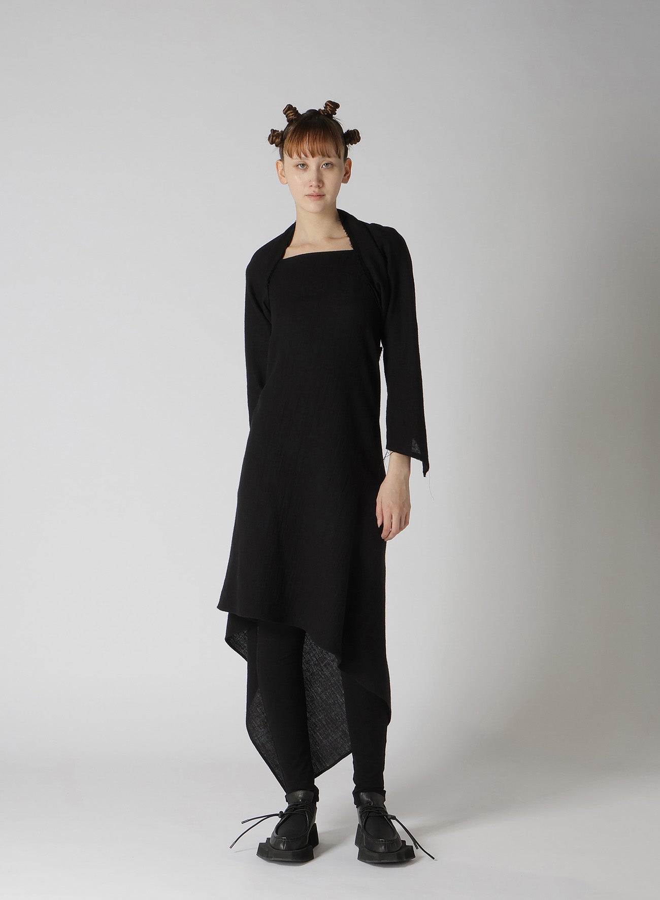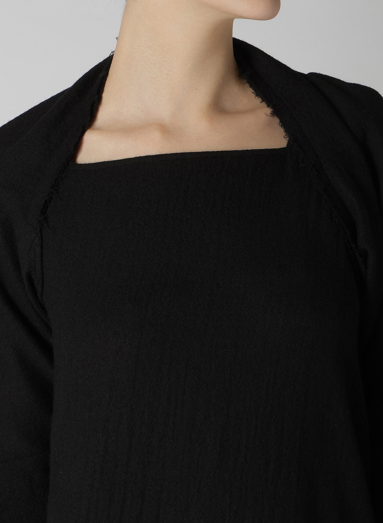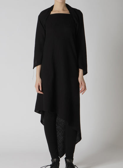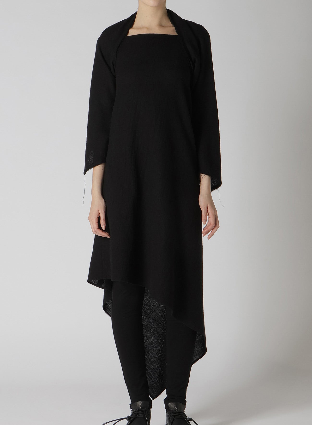 Cette robe en tissu sergé est fabriquée en laine de haute qualité, tissée avec une texture semblable à de la gaze et traitée pour créer une sensation pleine et douce. L'encolure expose les clavicules, et l'ourlet asymétrique ajoute une touche unique. Disponible en tailles S et M, la coupe ajustée autour des bras et des manches est conçue pour le confort et la facilité de port.