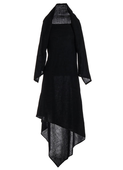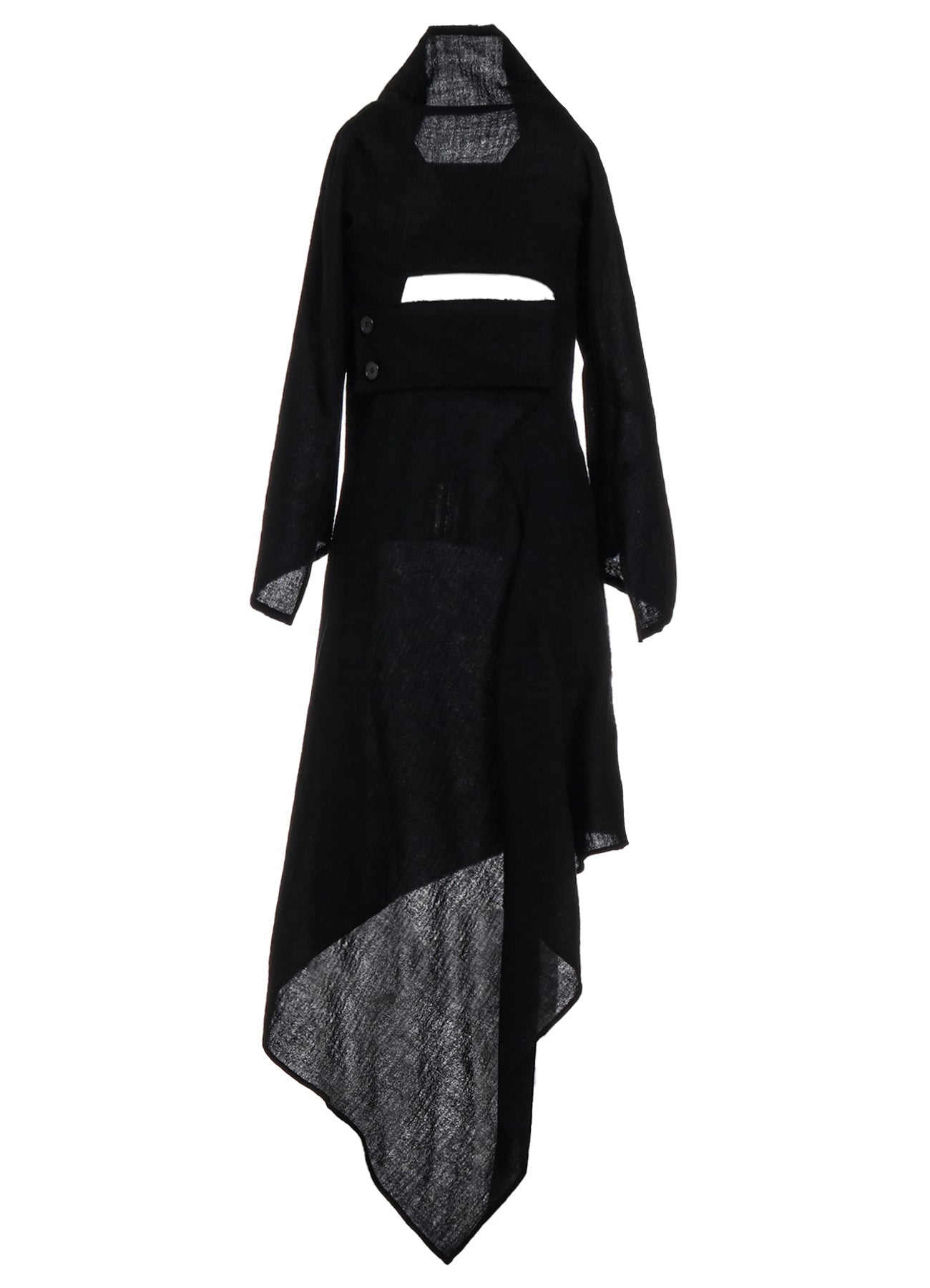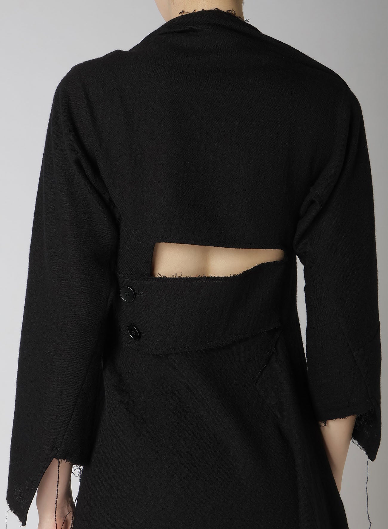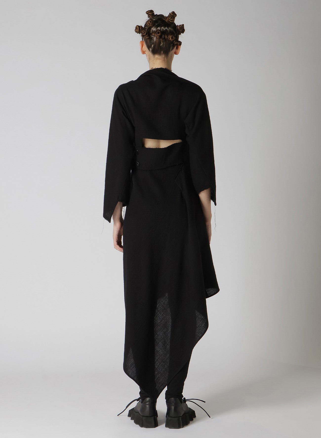 Cette robe en tissu sergé est fabriquée en laine de haute qualité, tissée avec une texture semblable à de la gaze et traitée pour créer une sensation pleine et douce. L'encolure expose les clavicules, et l'ourlet asymétrique ajoute une touche unique. Disponible en tailles S et M, la coupe ajustée autour des bras et des manches est conçue pour le confort et la facilité de port.