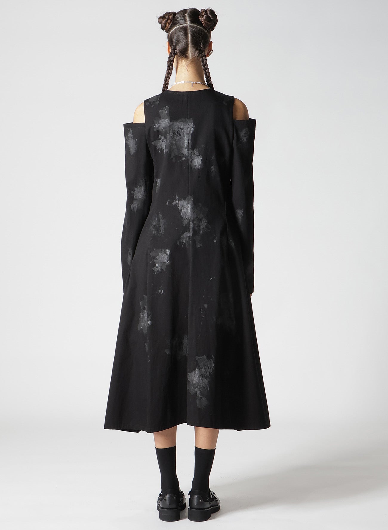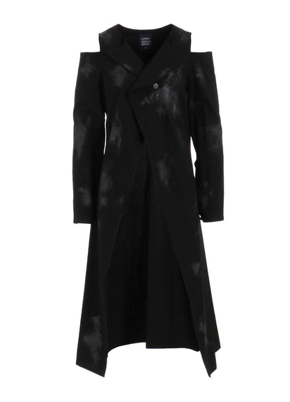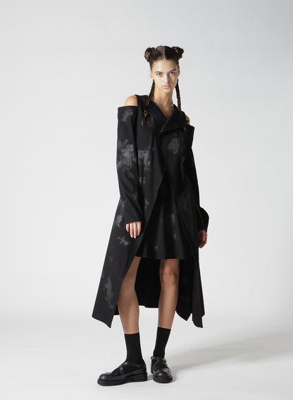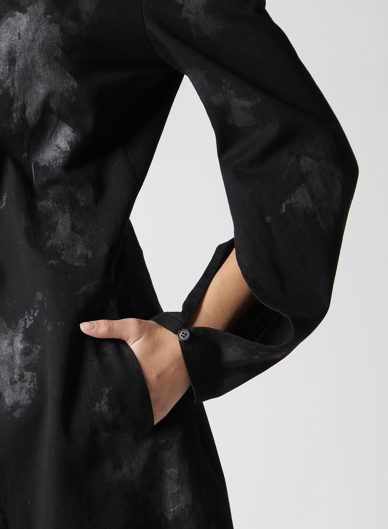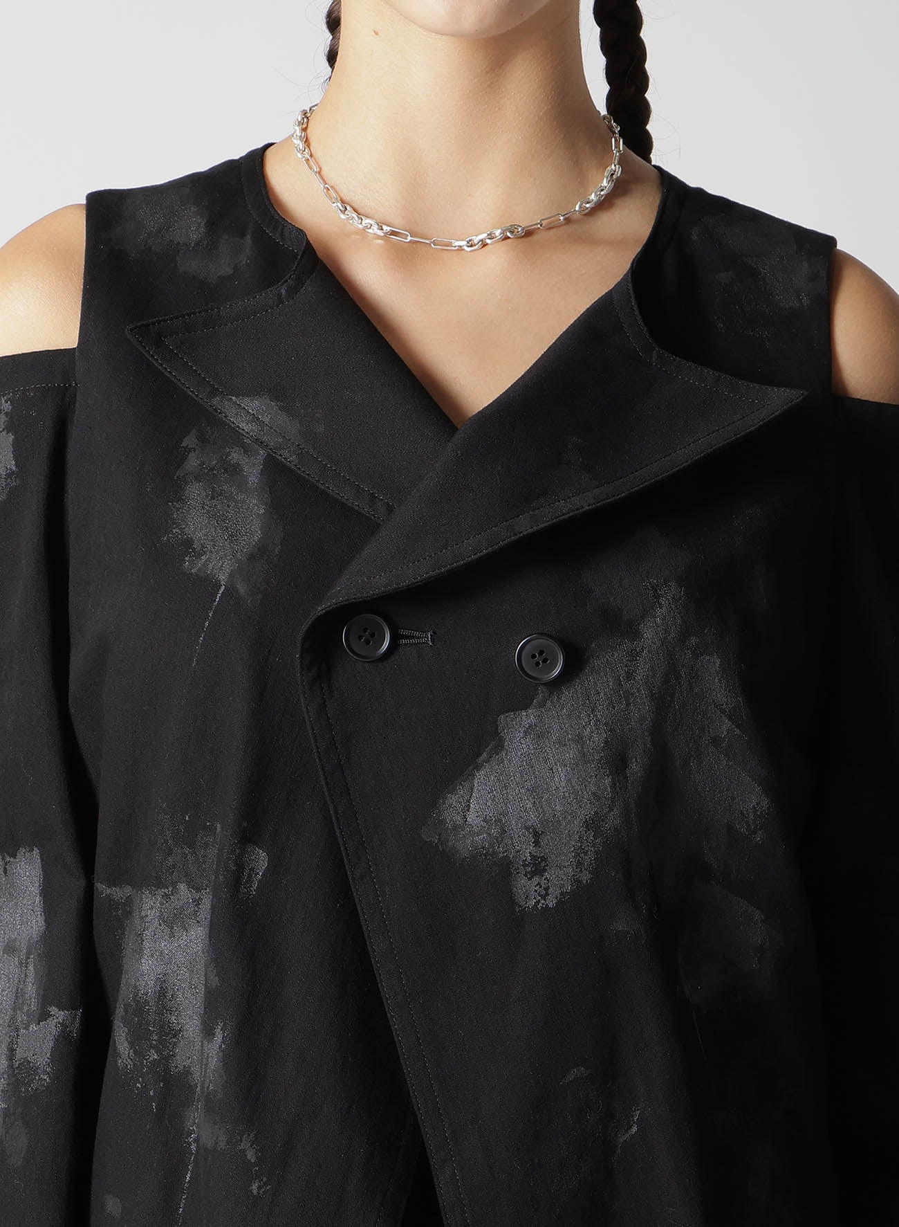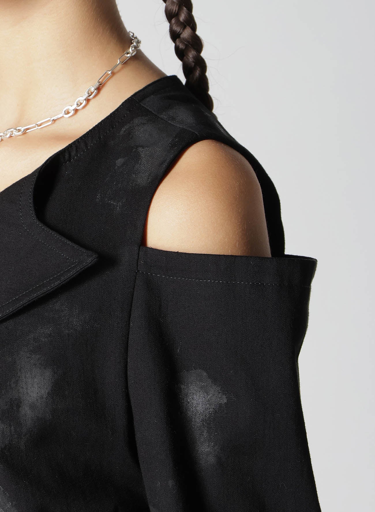 Ce denim noir a une texture unique grâce à une teinture noire profonde. Chaque pièce est individuellement peinte à la main avec des résines brillantes et mates, montrant le talent de l'artisan, ce qui ajoute de la profondeur à la texture. Les manches sont transformables pour un style polyvalent.
