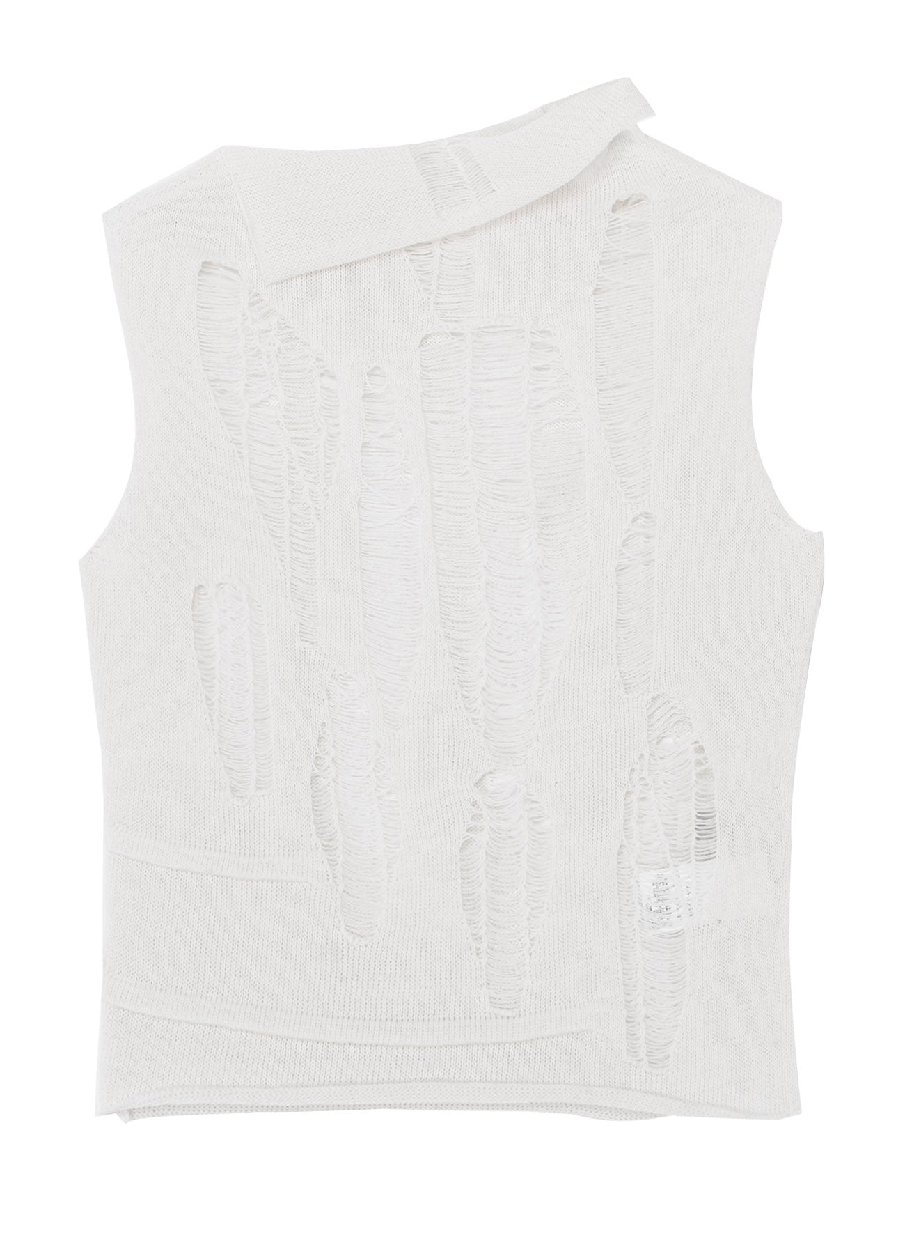 Ce haut en maille associe fil de coton et fil de lin à un fil de rayonne spécial, créant une texture légère proche du papier. Le design complexe mélange maille simple et effets d’usure. Inspiré par le style punk de LIMI feu, il conserve une finition élégante. Disponible en blanc, rouge et noir. - Design complexe alliant maille simple et effets d'usure. - Style punk de LIMI feu avec une finition élégante. - Texture légère proche du papier. - Compatible avec jupes évasées et pantalons larges pour des tenues stylées. - Disponible en trois couleurs : blanc, rouge et noir.
