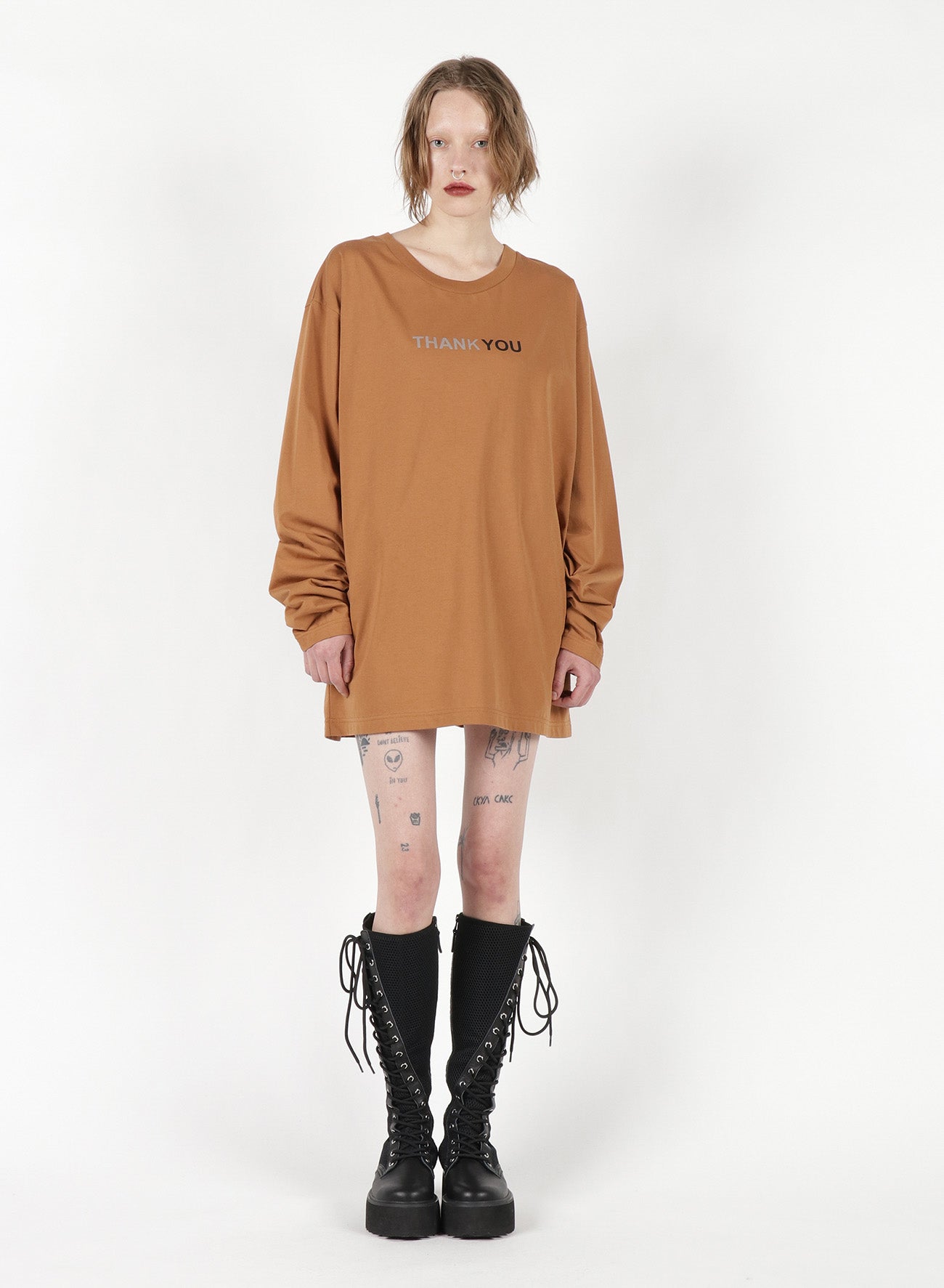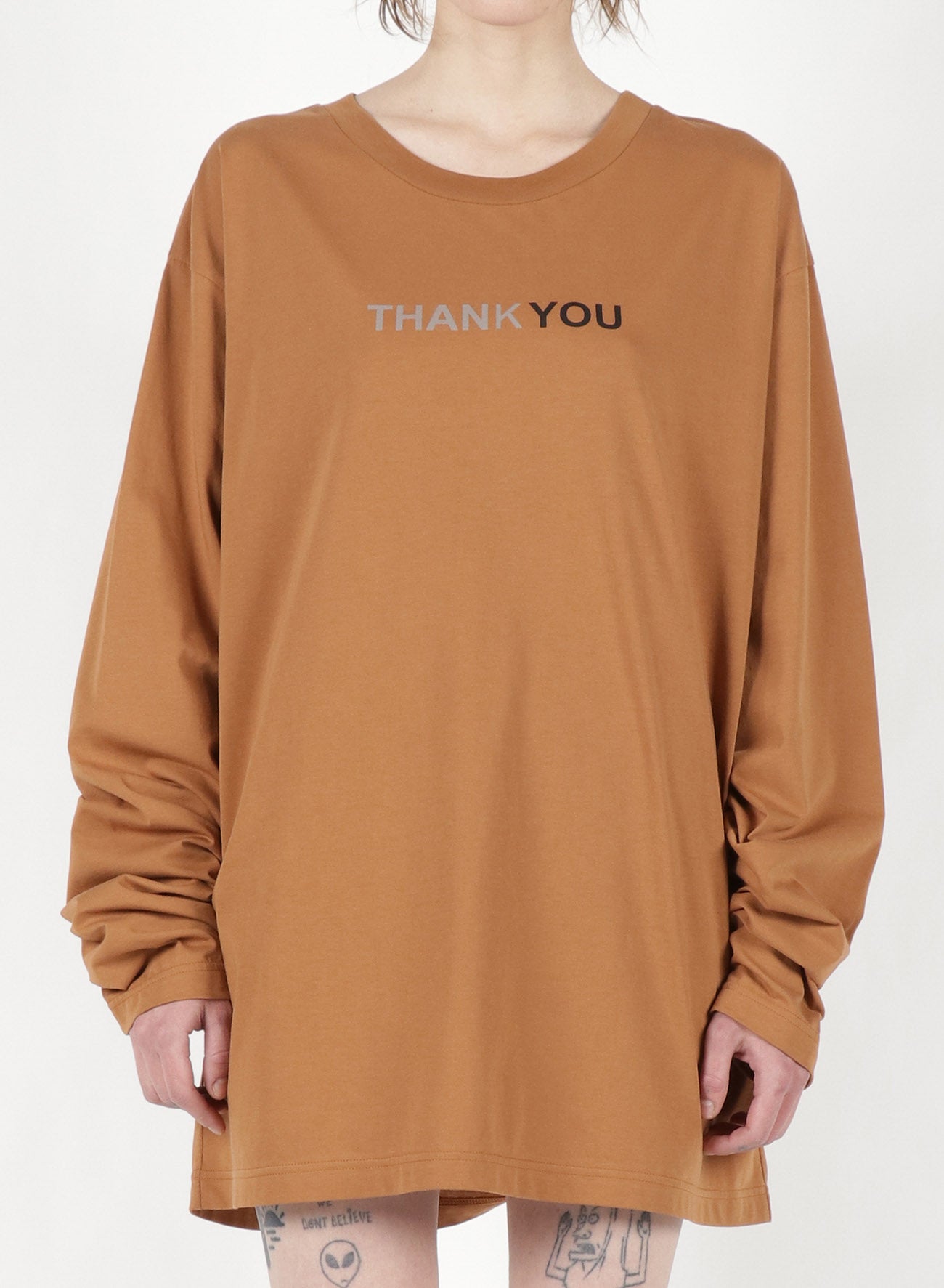Ce T-shirt surdimensionné présente une silhouette basique et un design Unisexe, adapté à tous les genres. Il intègre un matériau réfléchissant qui révèle des messages cachés lorsqu'il est exposé au flash. L'impression transmet un message de gratitude, en faisant une addition à la fois élégante et significative à votre garde-robe.