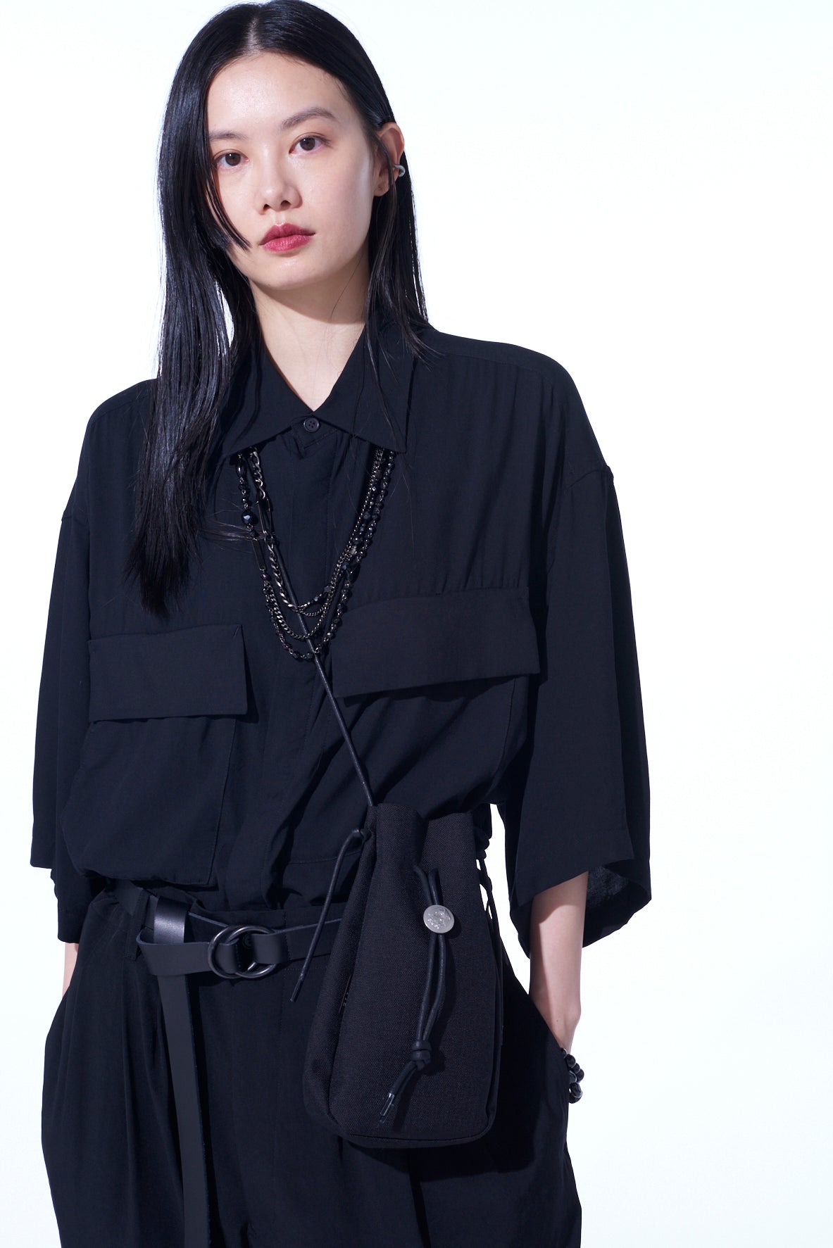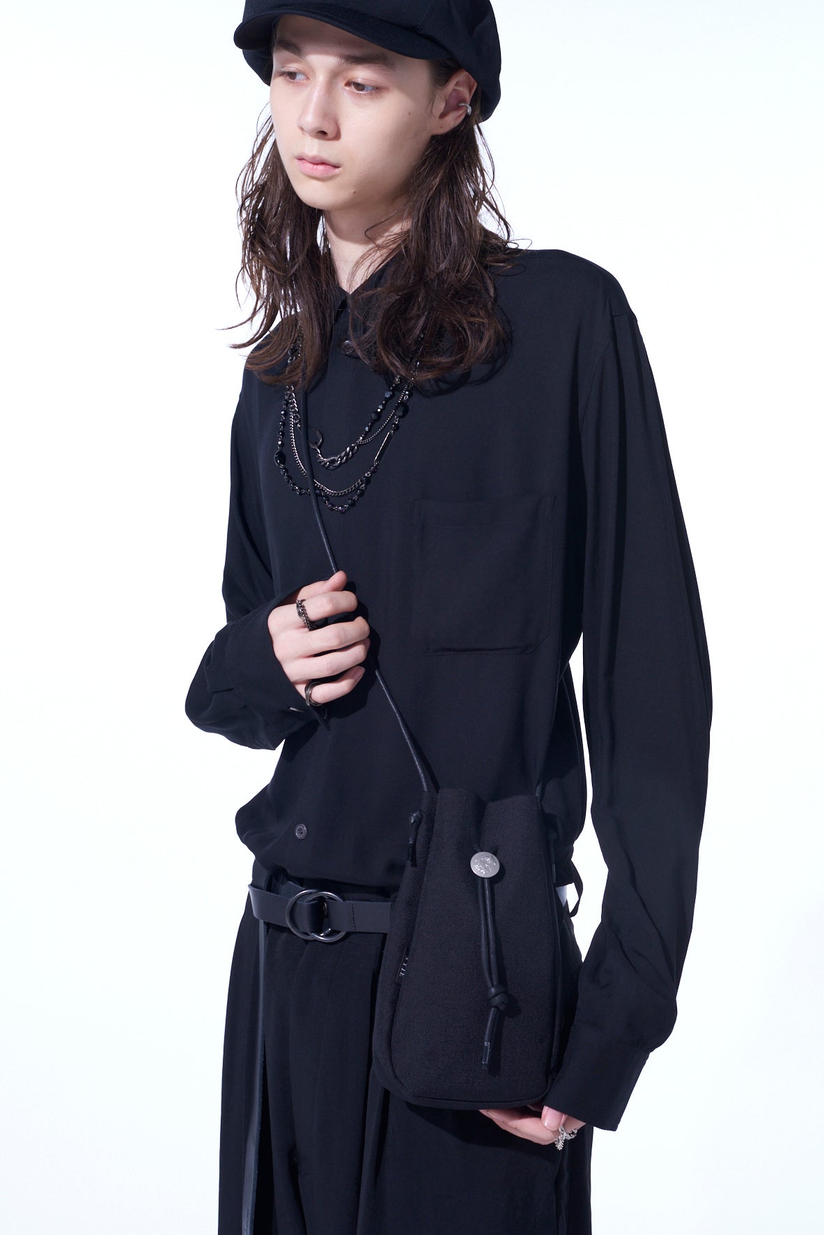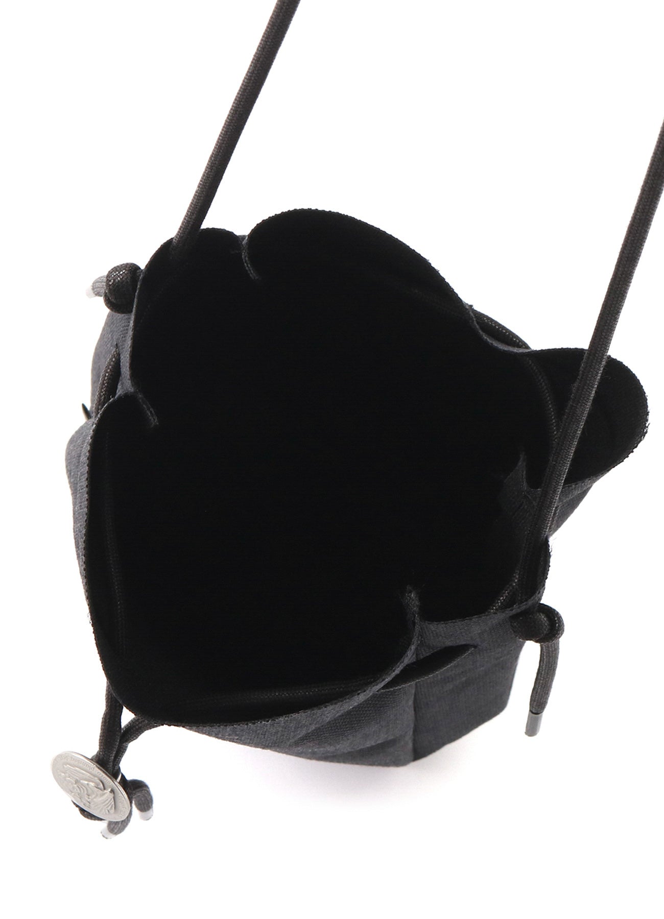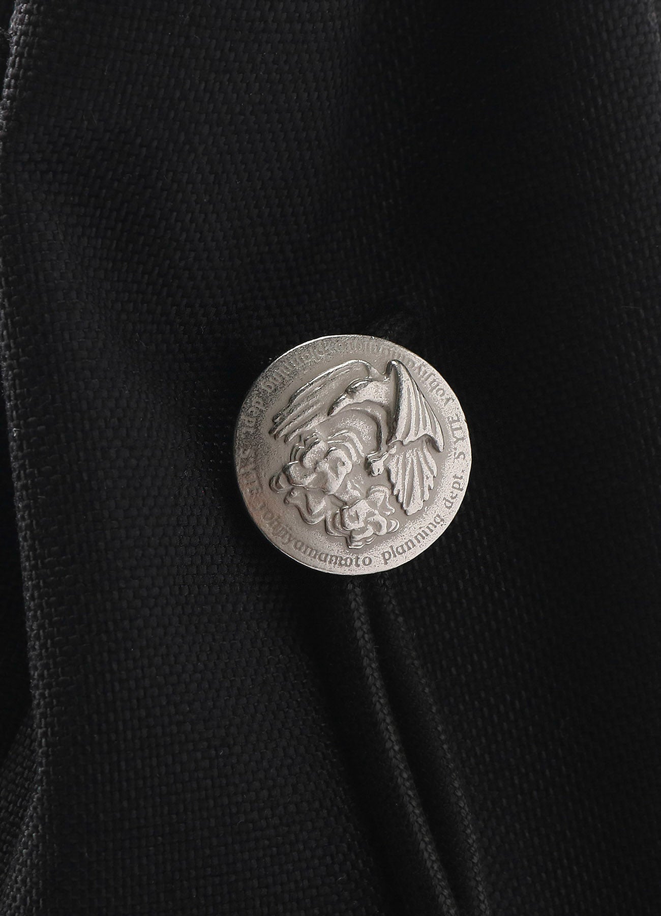 Ce sac à dos à cordon combine une durabilité exceptionnelle et une résistance à l'eau, sept fois plus fort que le nylon Cordura 1000. Il peut être porté autour du cou ou en bandoulière. Le concho central présente un design d'un corbeau et d'une pivoine, symbolisant la marque. Le placage argenté avec un revêtement transparent réduit les rayures, et une finition mate ajoute du raffinement.