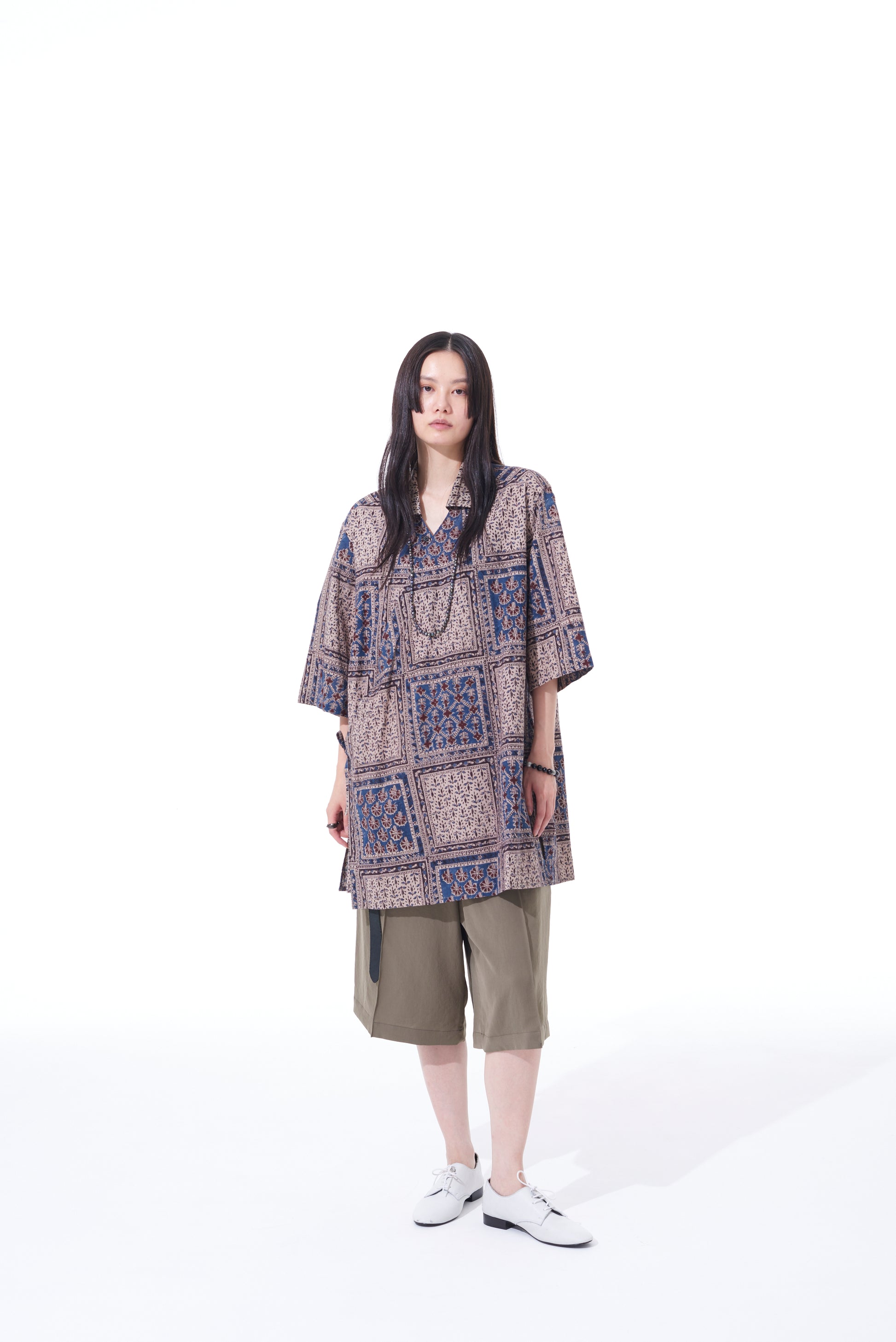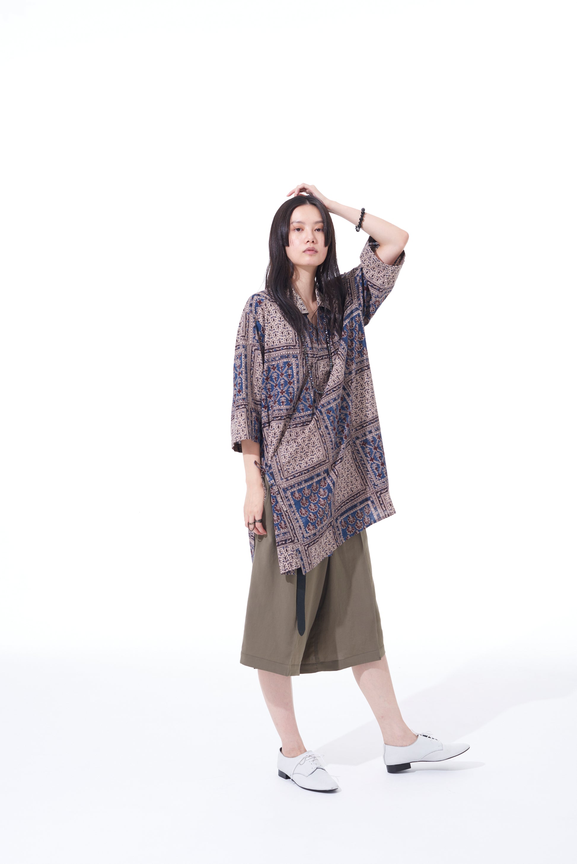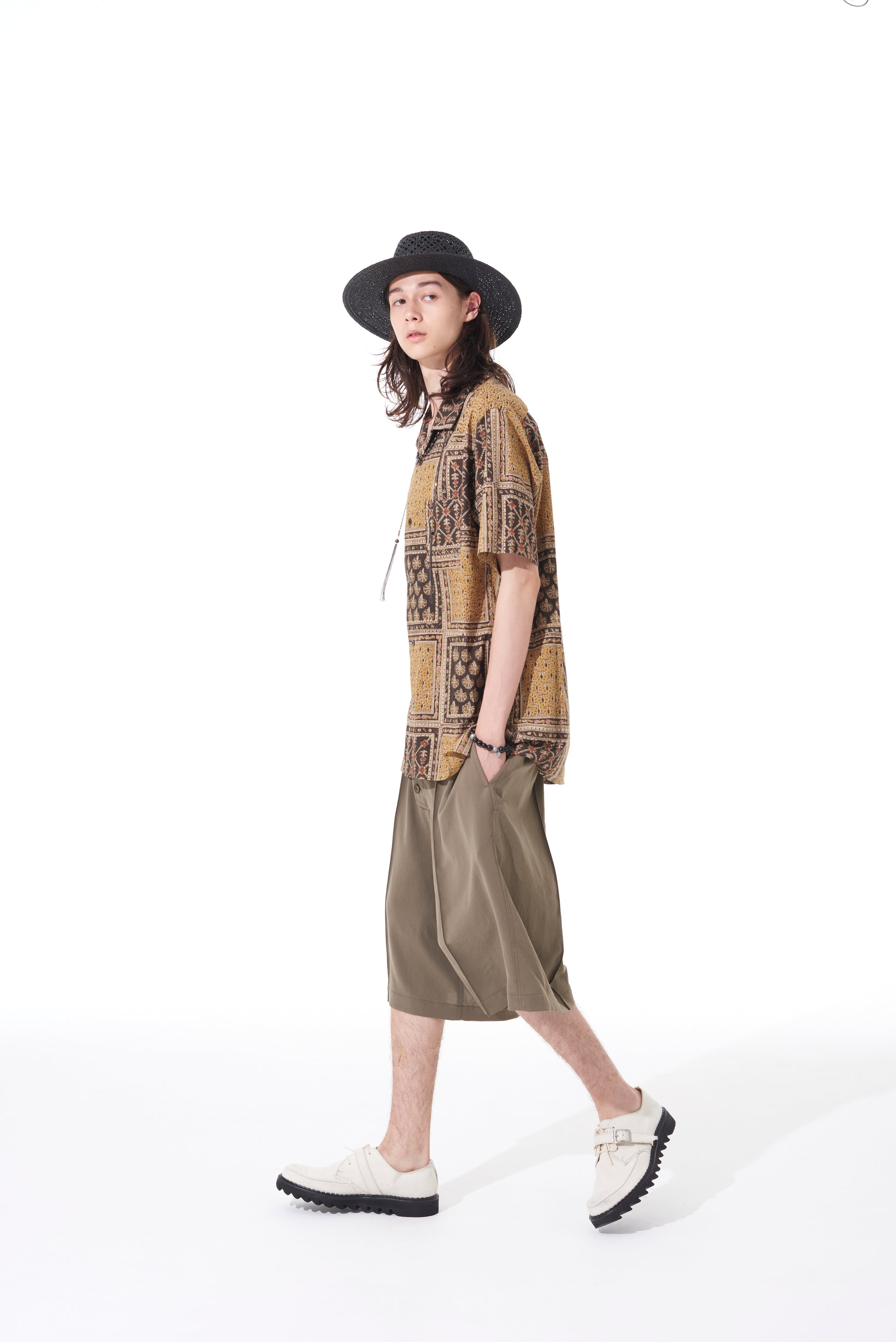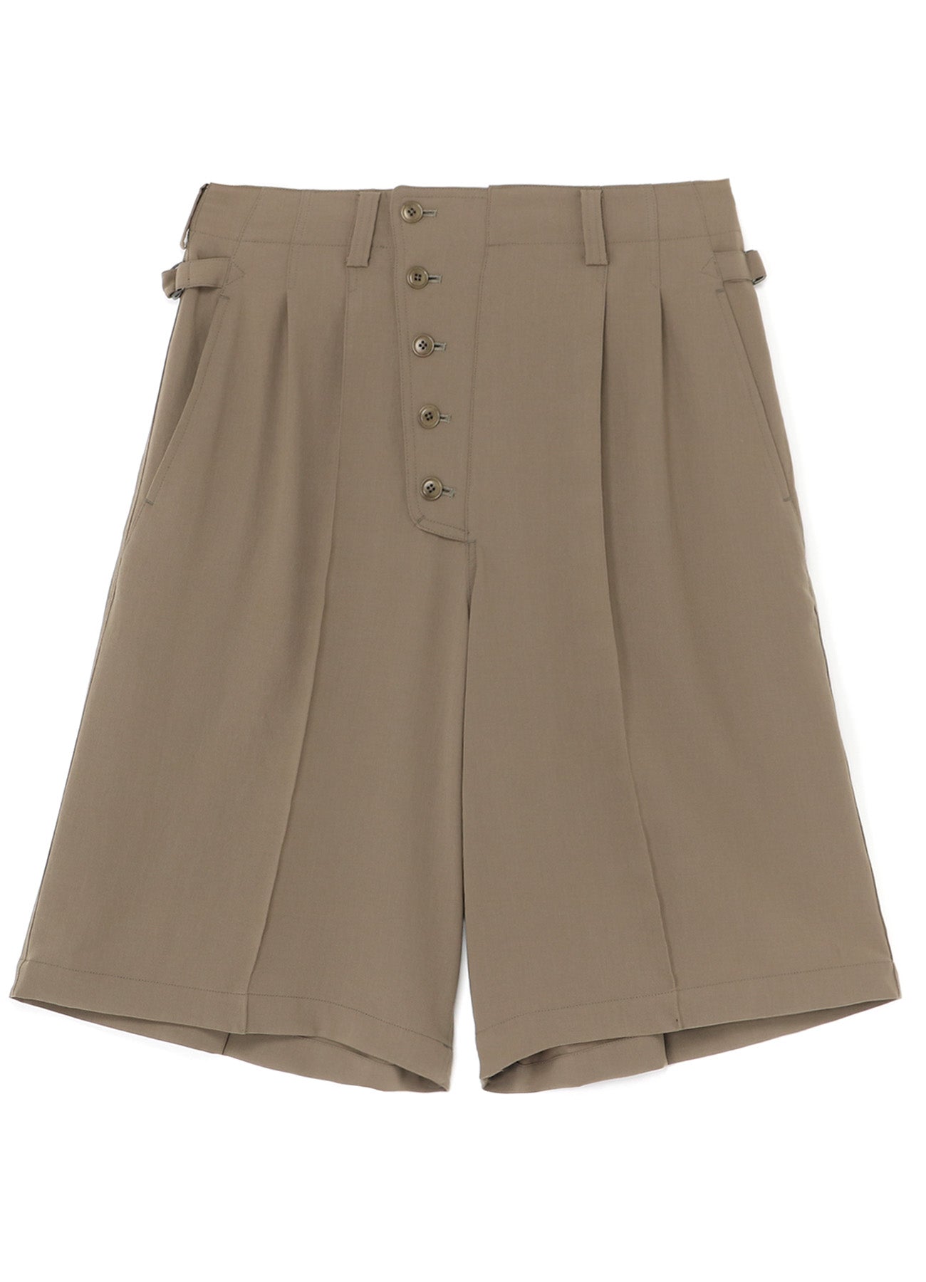 Les pantalons mi-longs larges jusqu'aux genoux présentent des plis, une taille ajustable avec des ajusteurs latéraux et une patte de boutonnage visible à l'avant, inspirés par des détails militaires vintage. Le tissu doux et sec offre une silhouette légère et drapée et est résistant aux plis, ce qui le rend adapté à un usage quotidien.