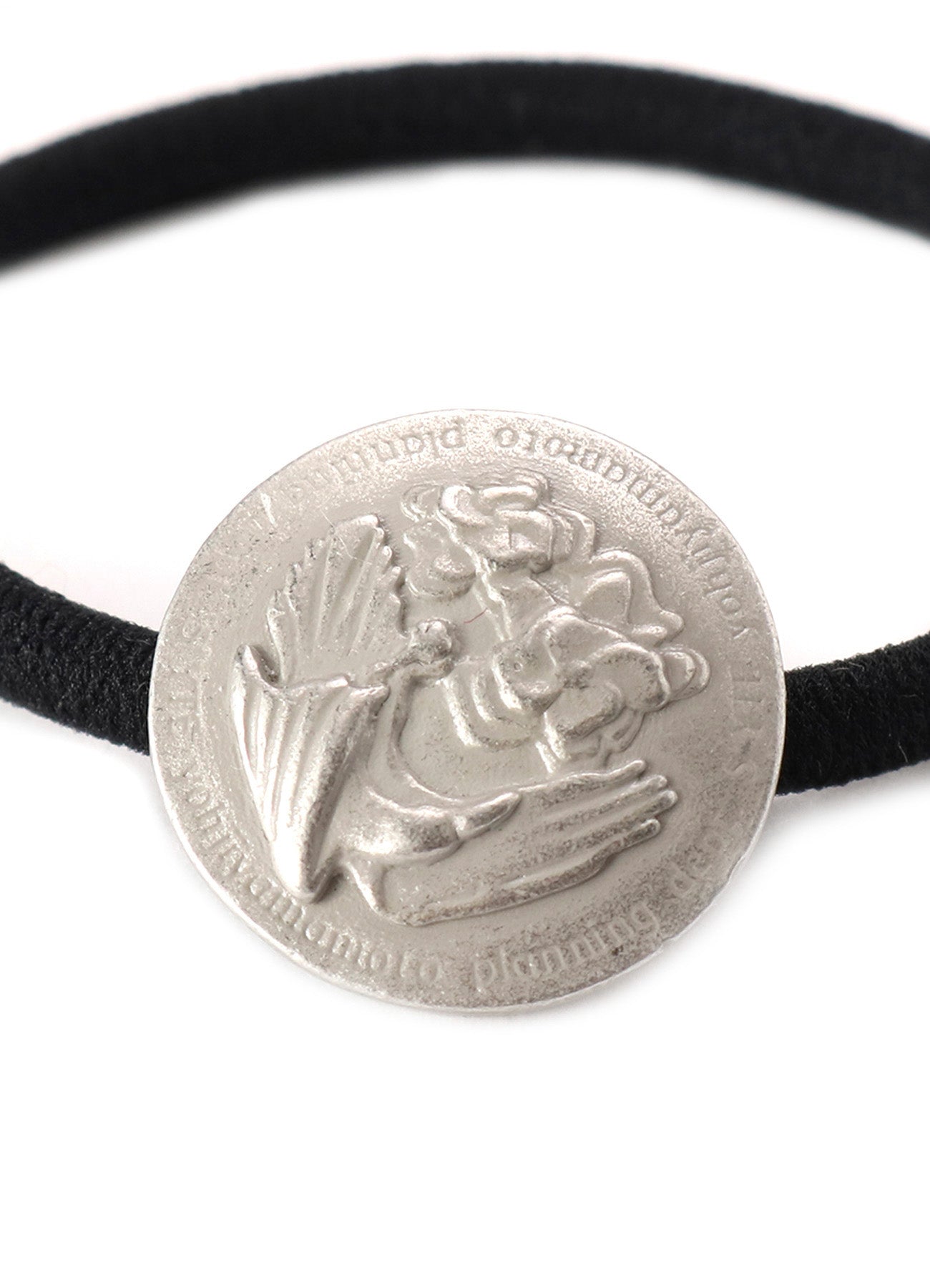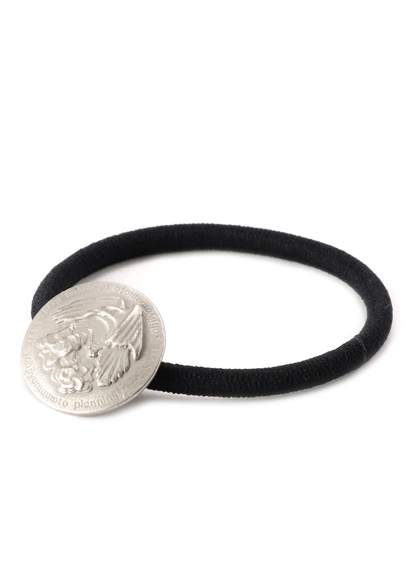 Un article complexe présentant un emblème d'un corbeau et de fleurs de pivoine entouré d'un logo de marque. Fabriqué en zinc moulé sous pression avec un plaquage argenté et un revêtement transparent pour réduire les rayures. Détail avec des bords polis pour une finition raffinée. Fonctionne comme un élastique à cheveux ou un bracelet, un accessoire polyvalent très populaire.