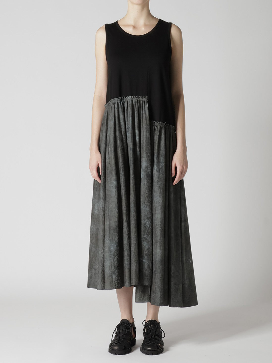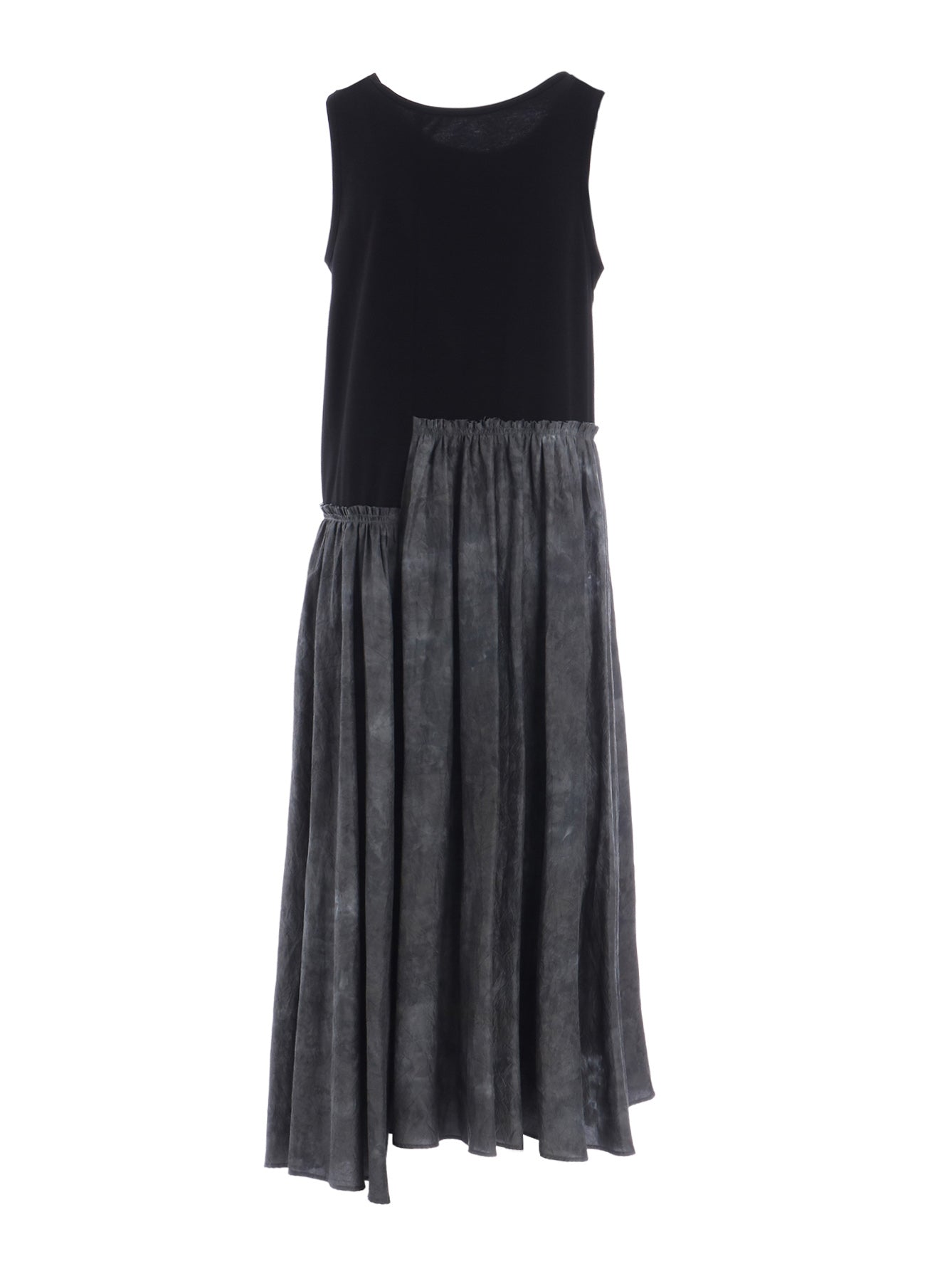 Designed to resemble a sleeveless cut-and-sew combined with a tiered skirt, the stepped front forms an asymmetrical silhouette.