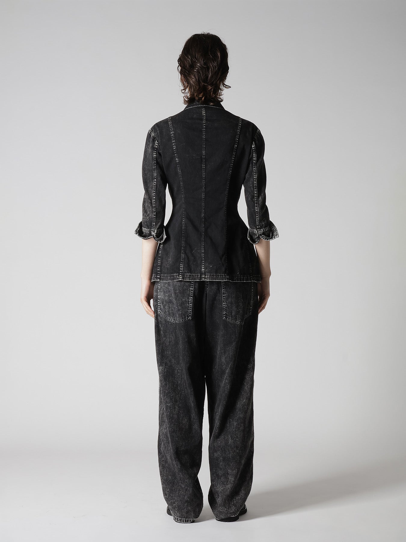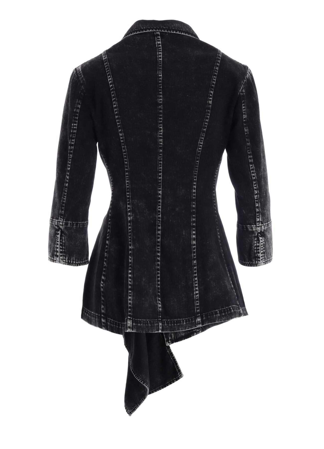 This 60-ounce denim jacket showcases a unique chemistry-induced wash effect, creating a distinctive gradation. The body is fitted at the waist, with additional fabric adding movement to the design. Its unconventional and eye-catching pattern makes this piece a standout addition to any wardrobe.