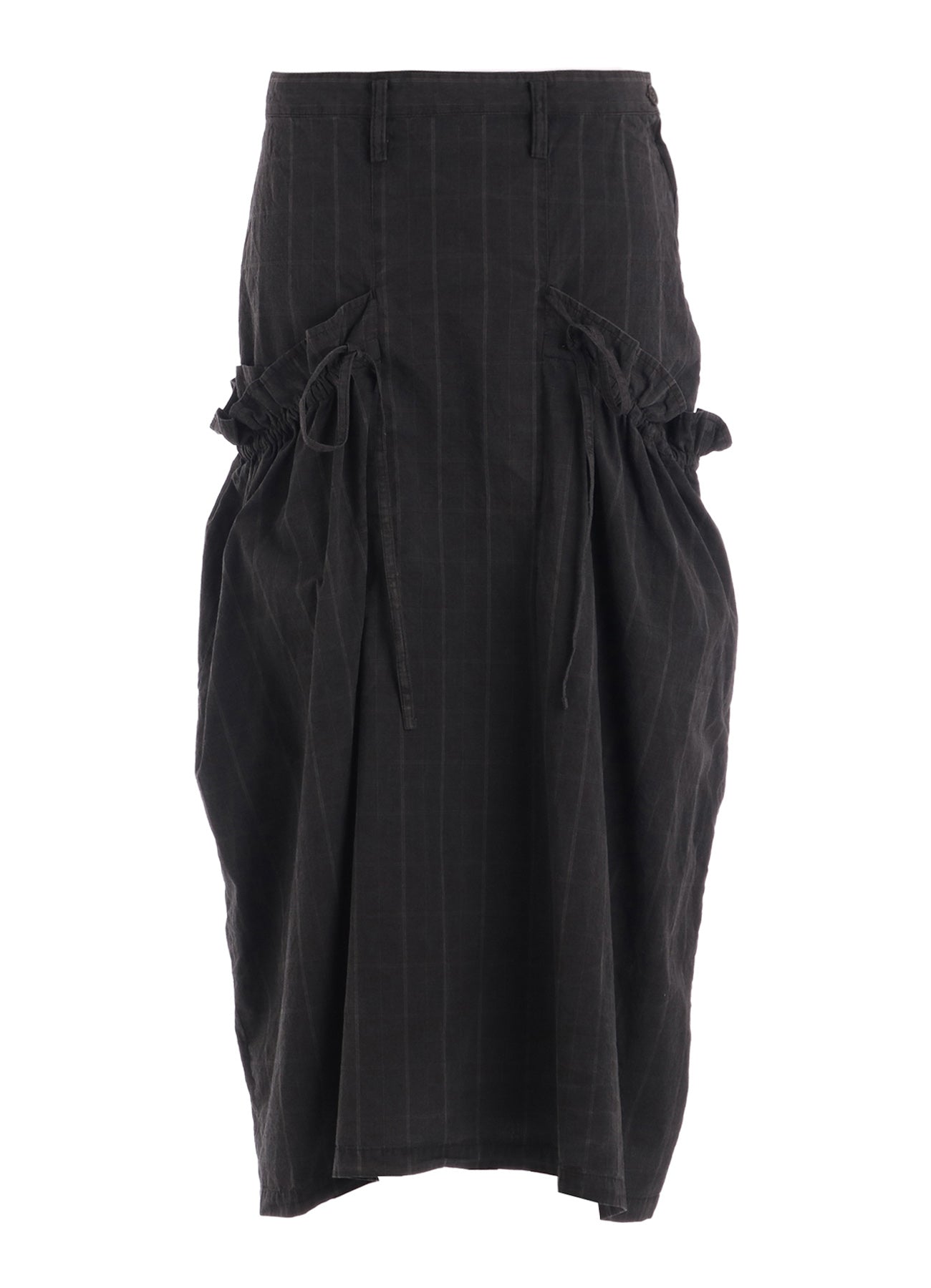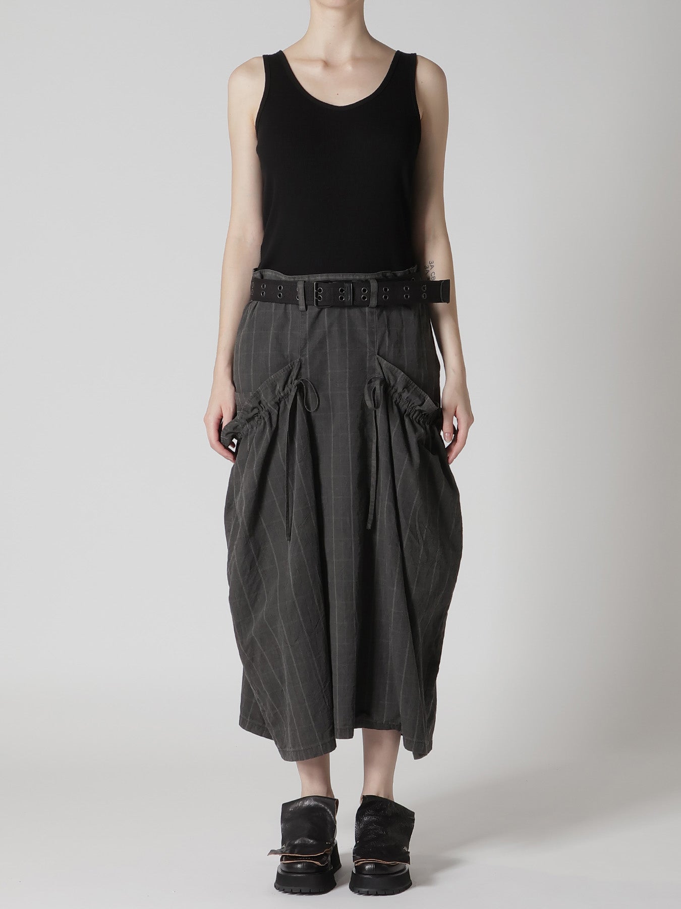 A gathered skirt with an irregular crinkle texture features a dry feel. Designed to create gathers using a drawstring, it pairs well with a belt in your ensemble.