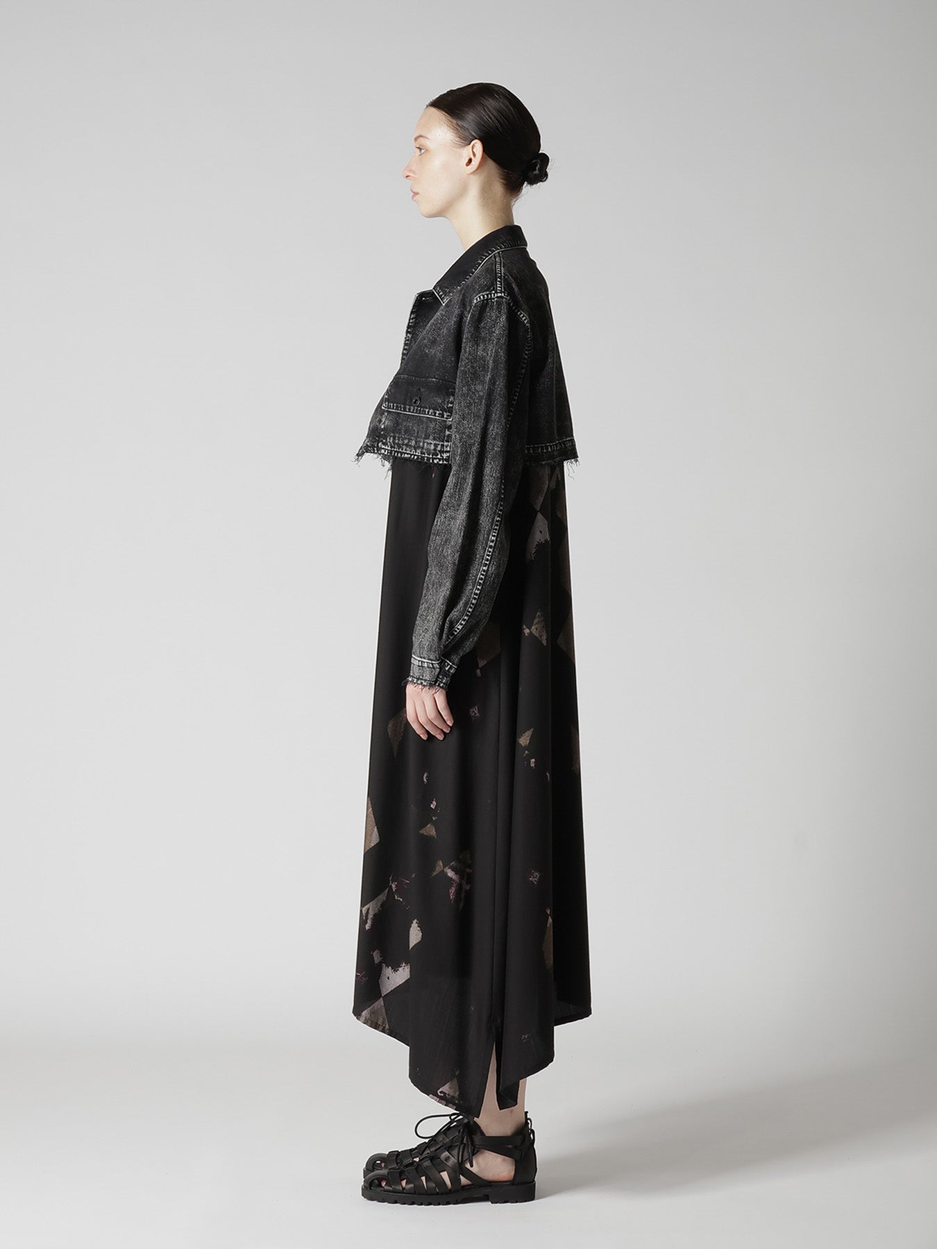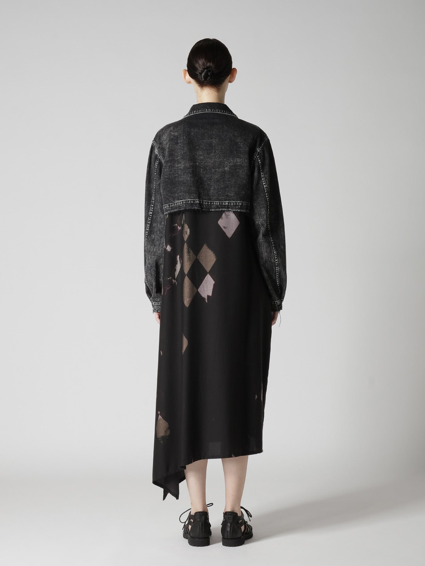 The short jacket, crafted from 80 ounces of fabric, is unique for its chemical wash, which produces a distinct fading effect. Bleach-soaked sponges are used in the dyeing process to create this pattern. It pairs elegantly with a dress for a stylish ensemble.