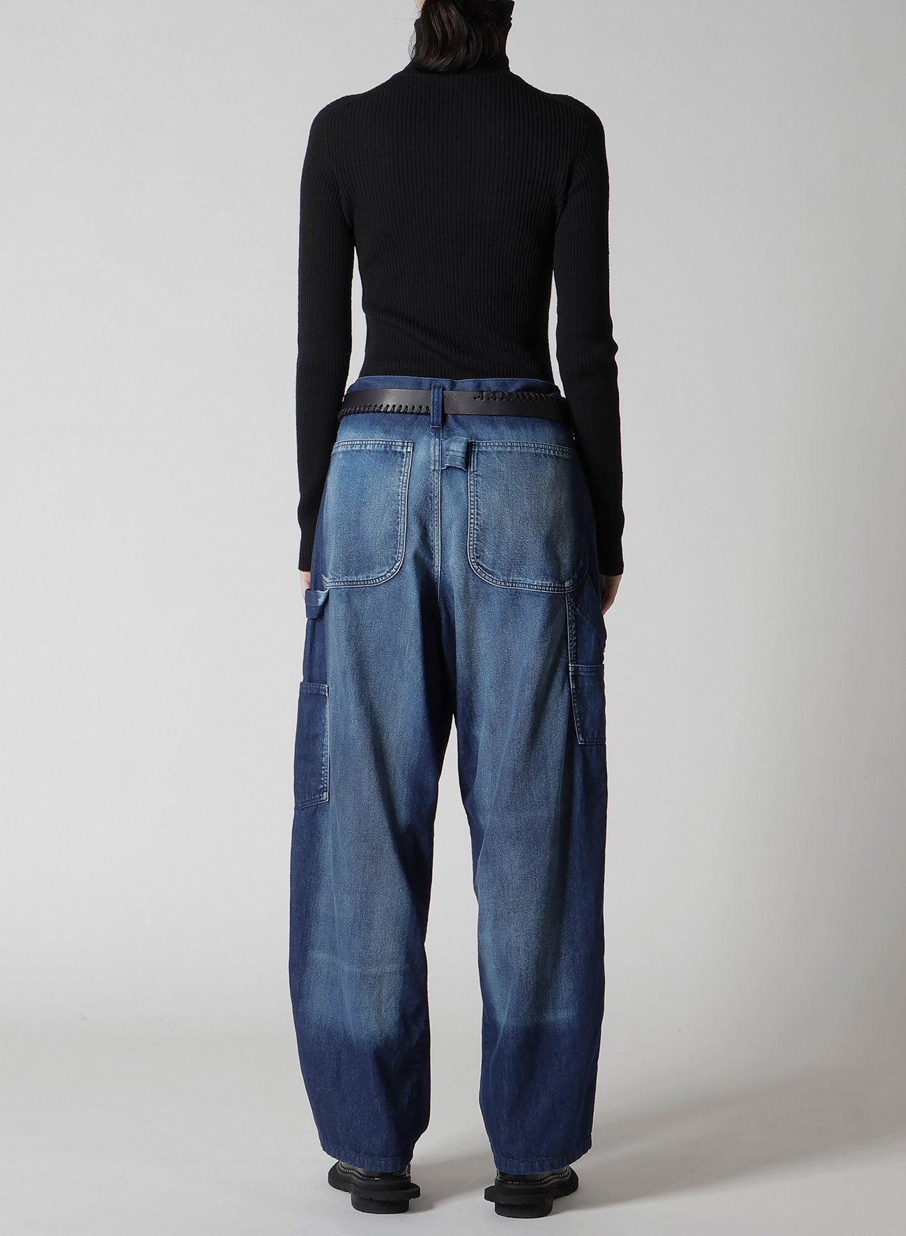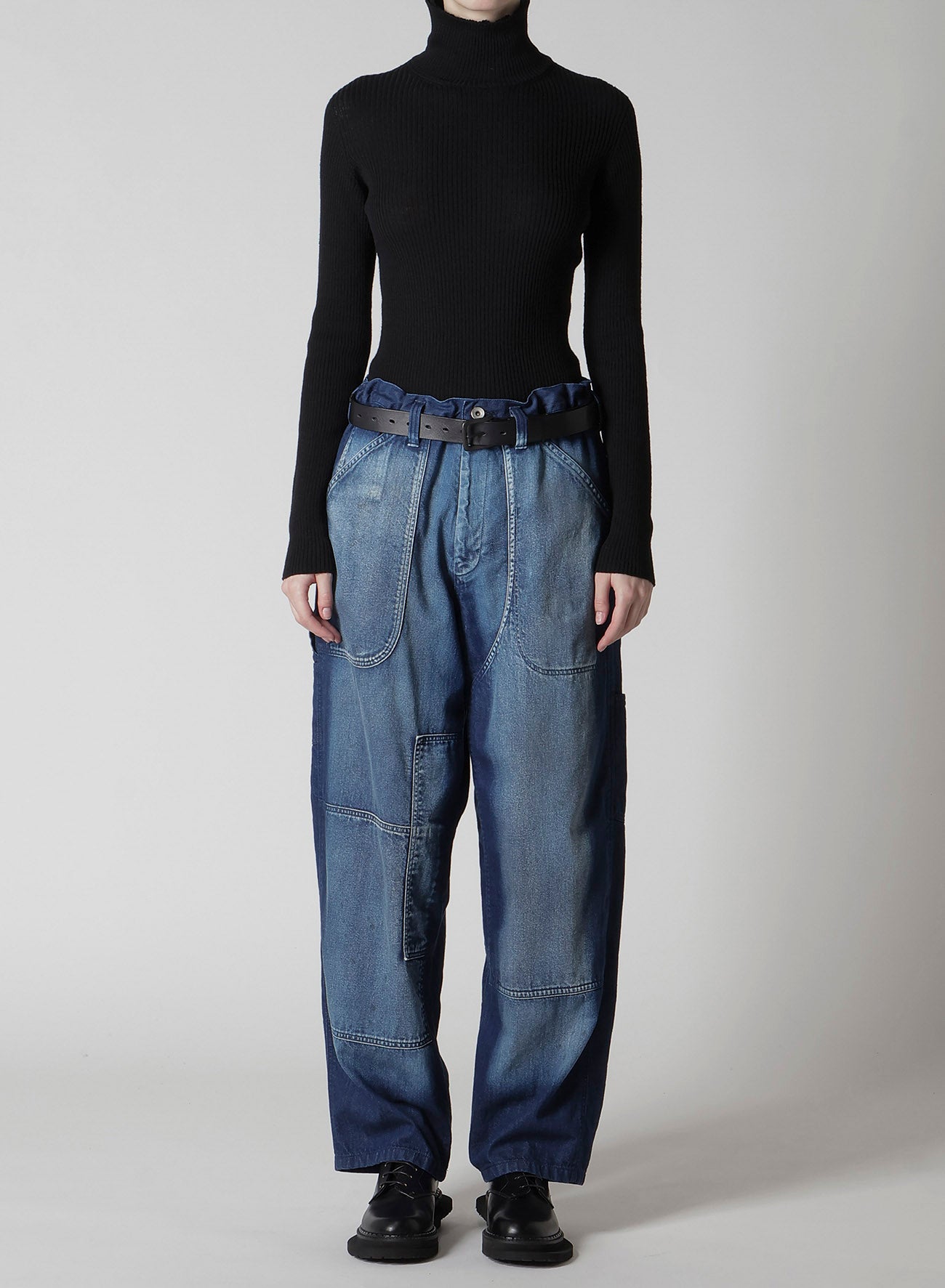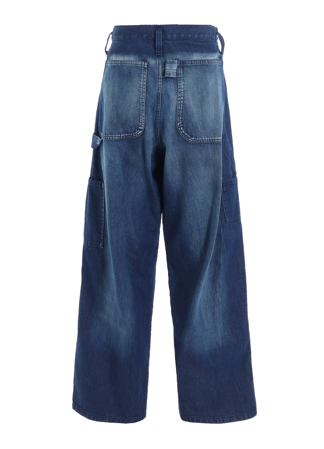 Le pantalon de travail en jean Magic Wash de Sported Horse Craft arbore des effets de dégradé et des détails en patchwork, soulignant un design décontracté. Fait à la main pour une unicité à chaque pièce, il intègre des éléments fonctionnels tels qu'un passant pour marteau. La teinture crée une apparence vintage avec des motifs de taches.