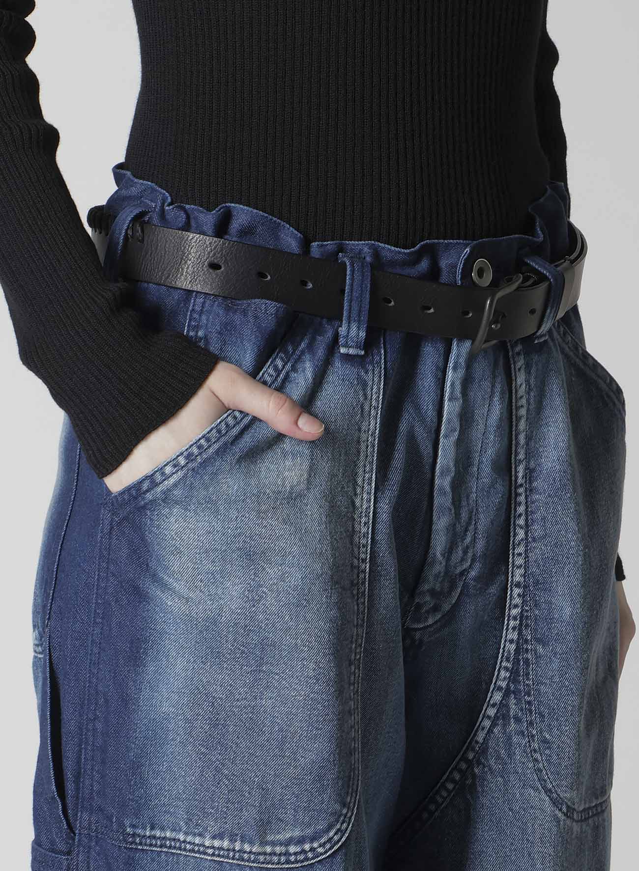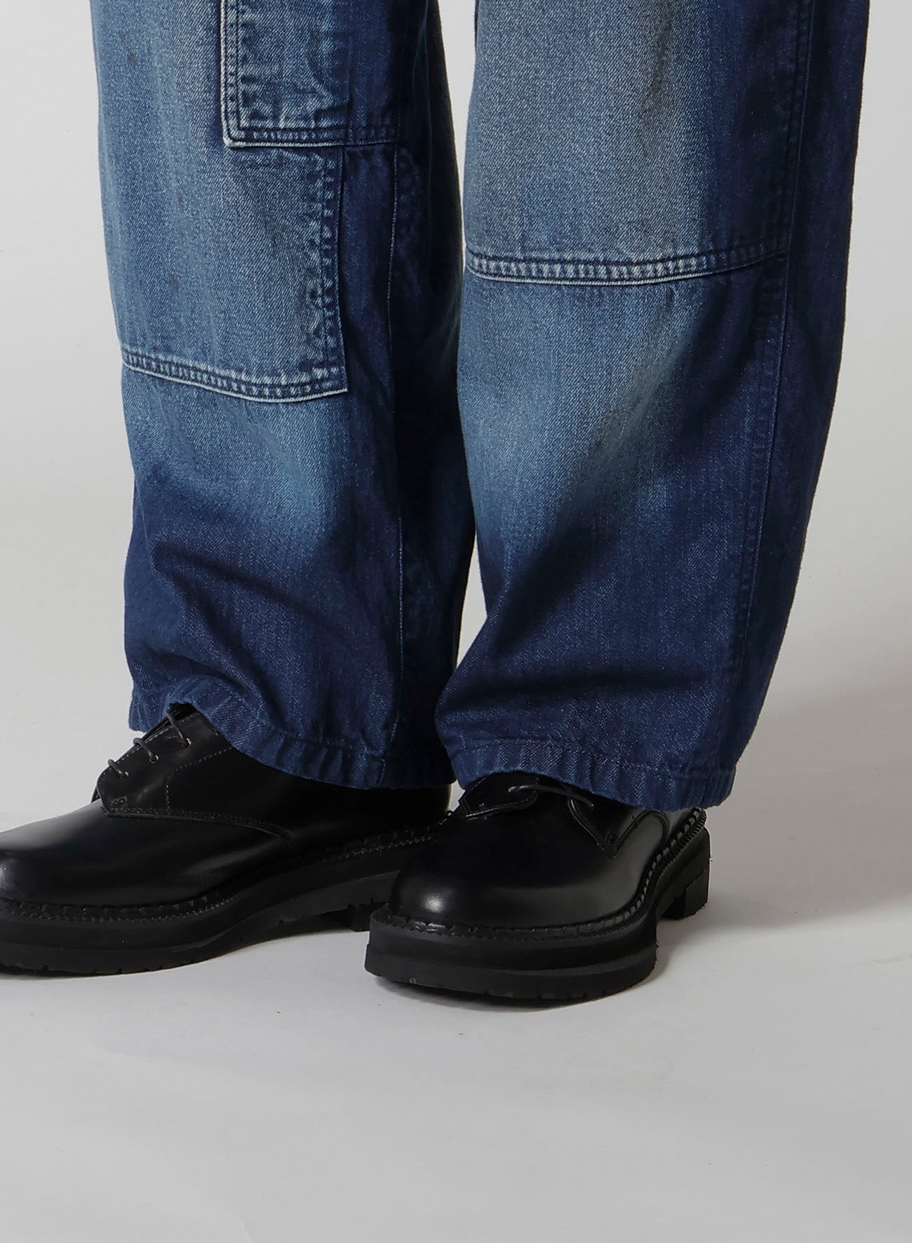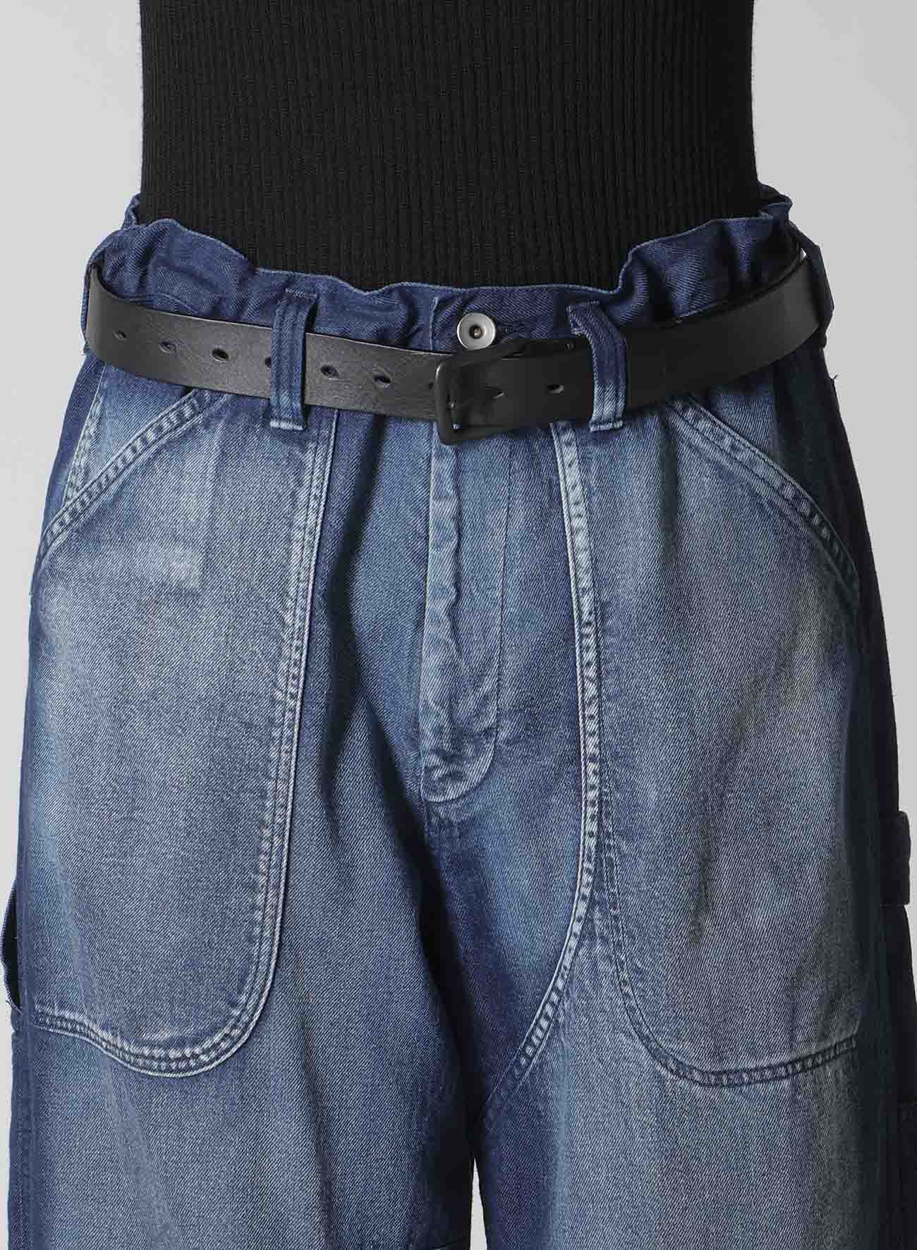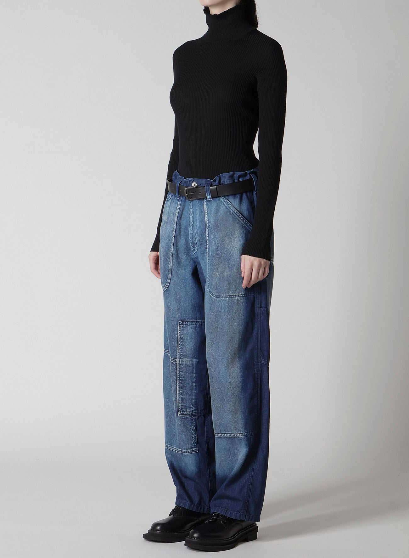 Le pantalon de travail en jean Magic Wash de Sported Horse Craft arbore des effets de dégradé et des détails en patchwork, soulignant un design décontracté. Fait à la main pour une unicité à chaque pièce, il intègre des éléments fonctionnels tels qu'un passant pour marteau. La teinture crée une apparence vintage avec des motifs de taches.