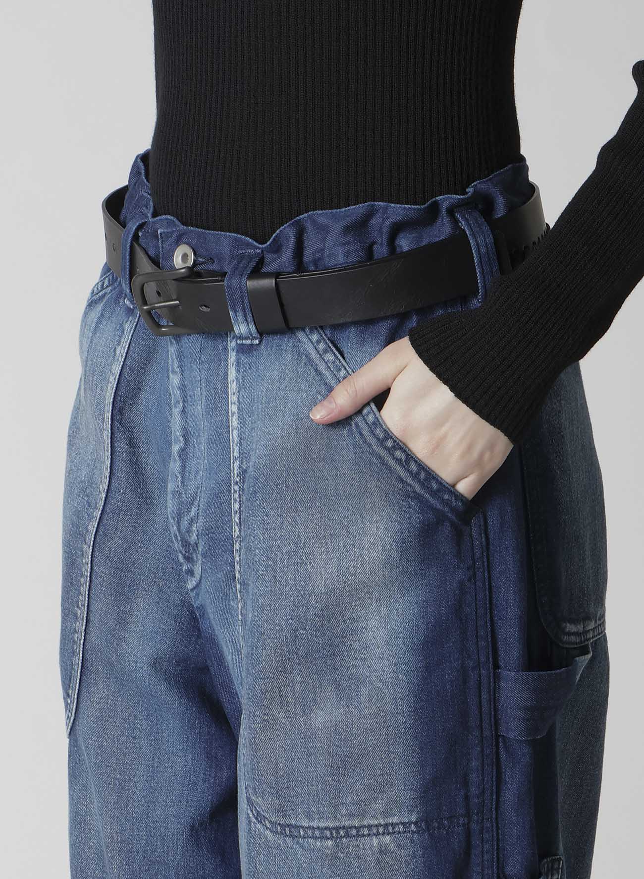 - Intègre des détails de vêtement de travail comme un passant pour marteau.
