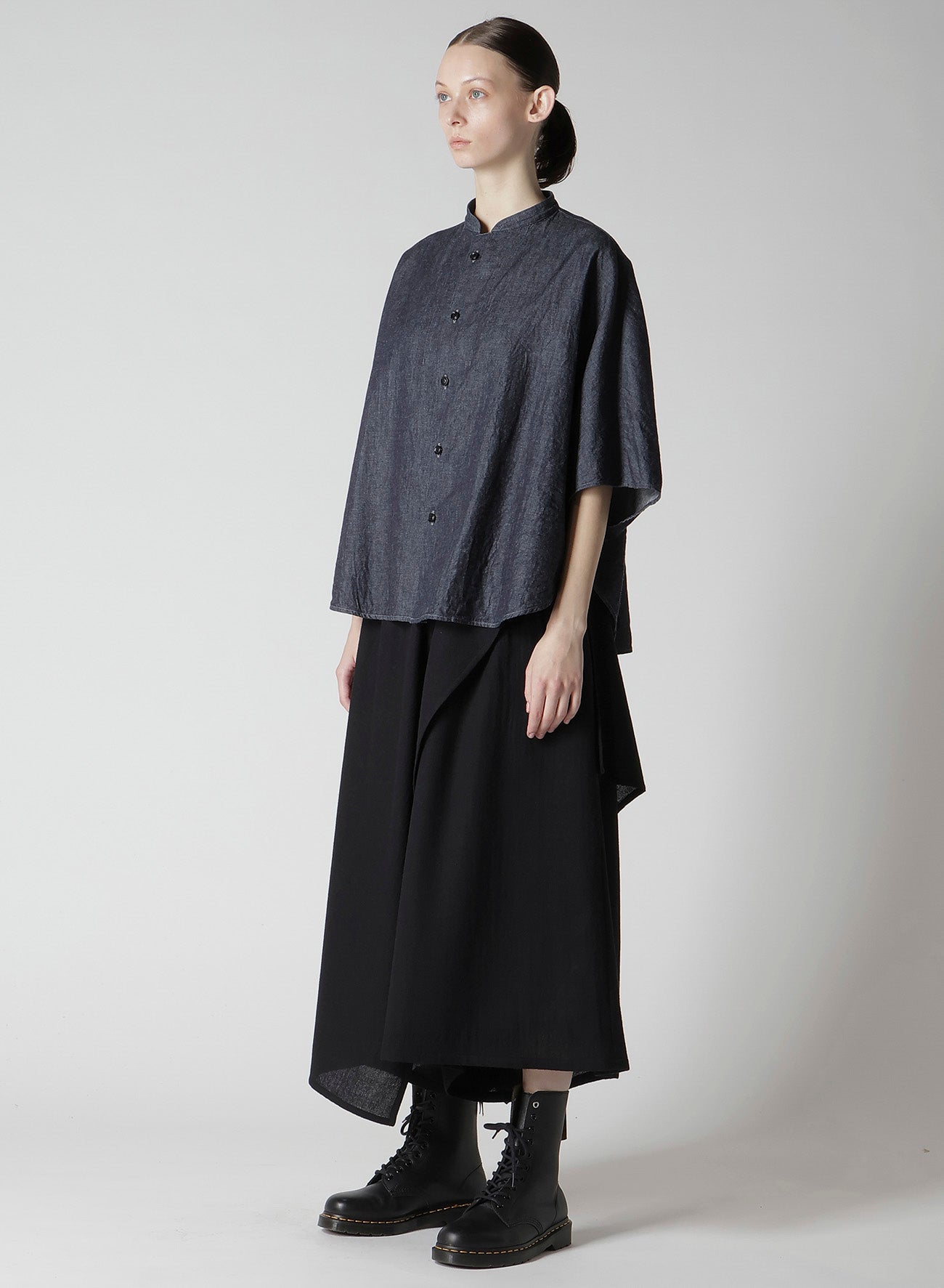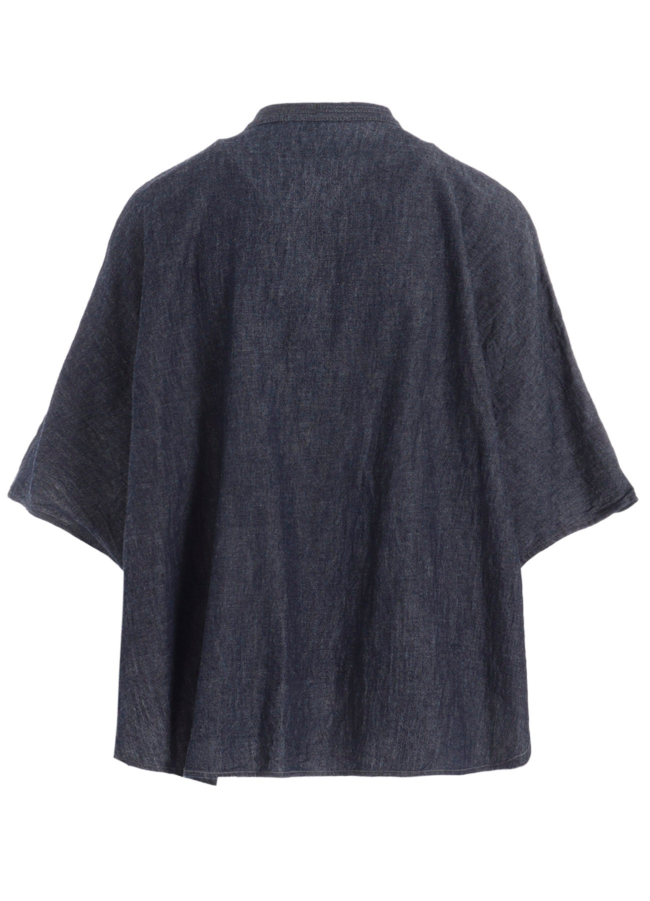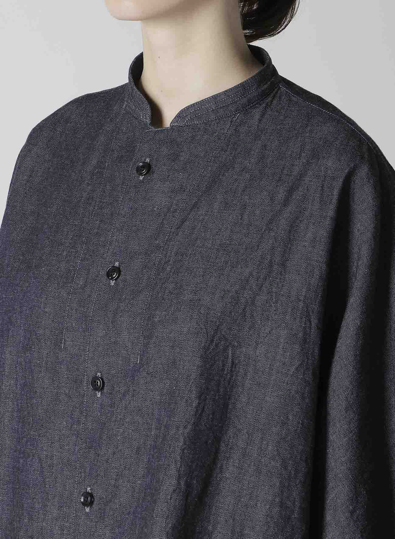 Cette blouse cape en denim à col montant présente une silhouette spacieuse grâce à un design qui intègre le corps et les manches. Faite en denim fin, son tissage lâche et son processus de teinture unique lui confèrent une texture douce. Le traitement de lavage doux améliore le confort, avec des variations individuelles attendues.