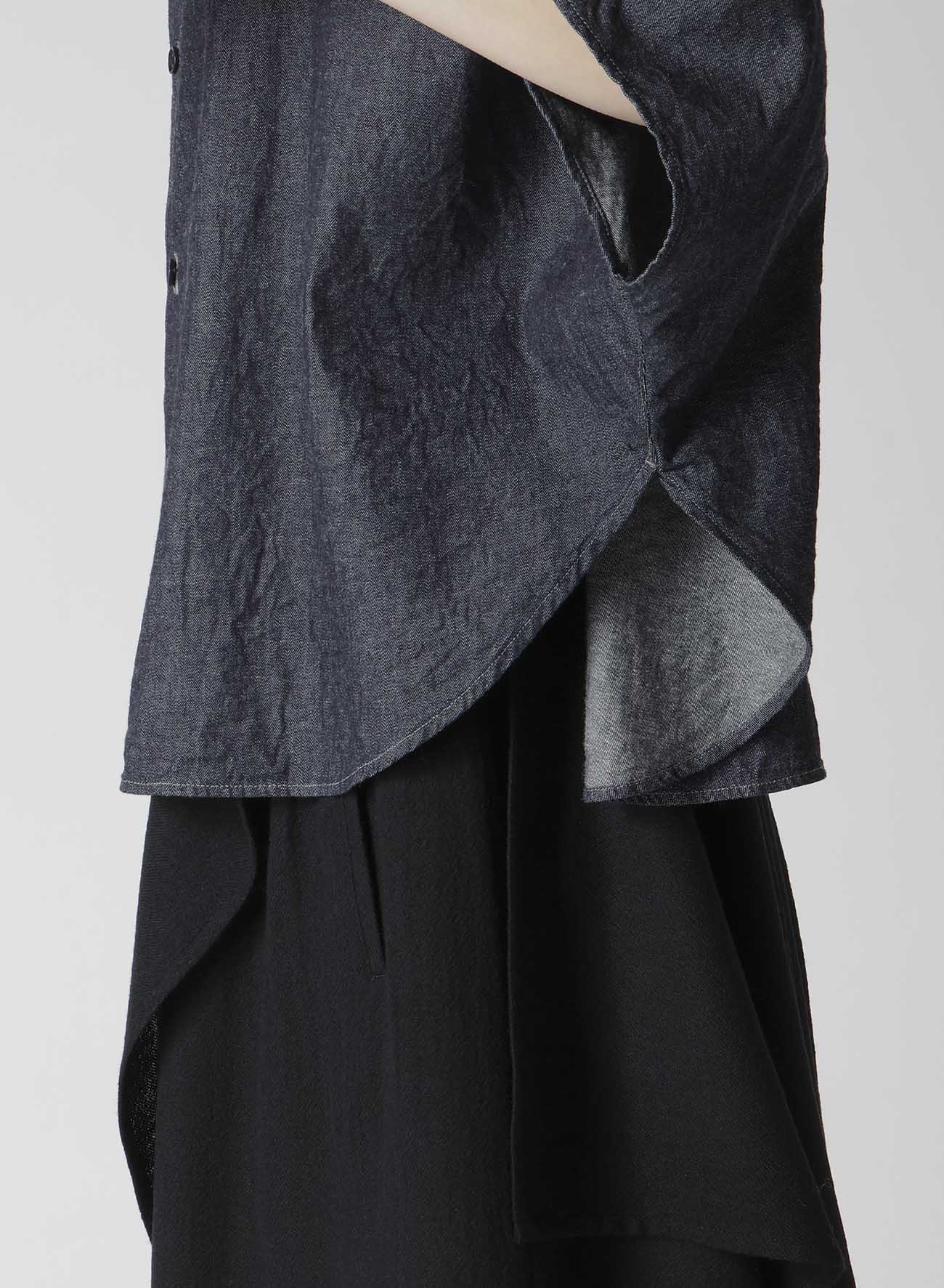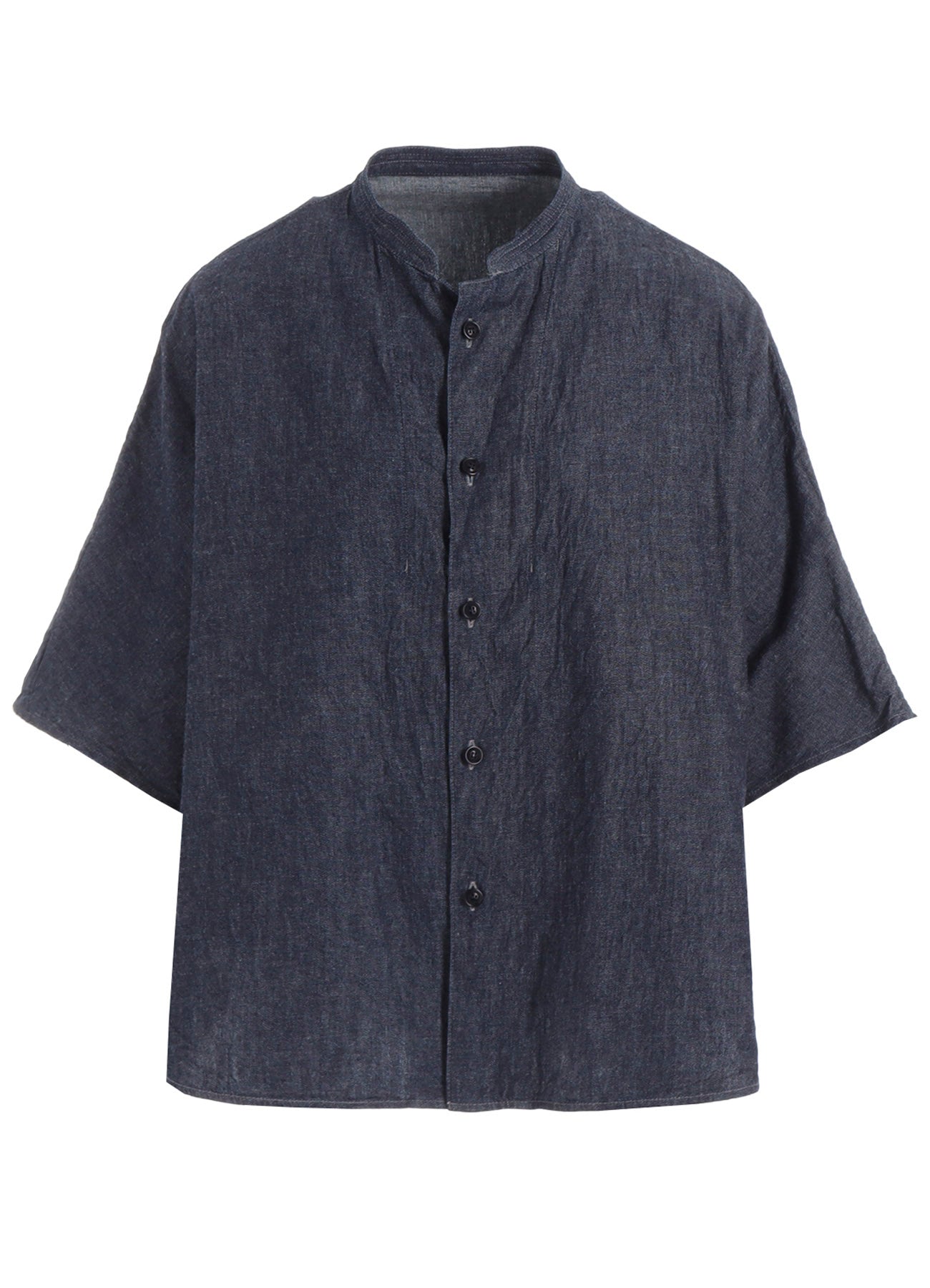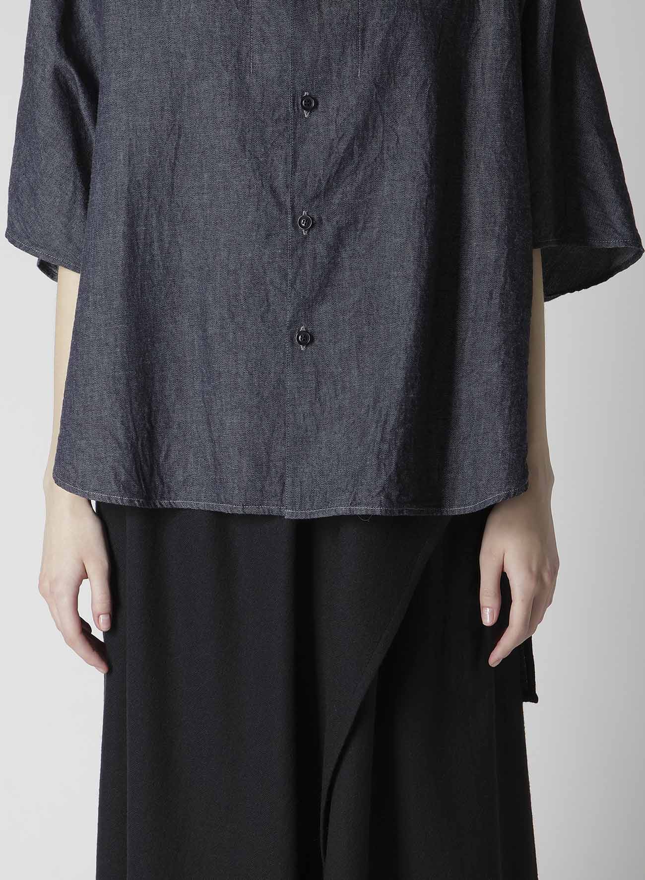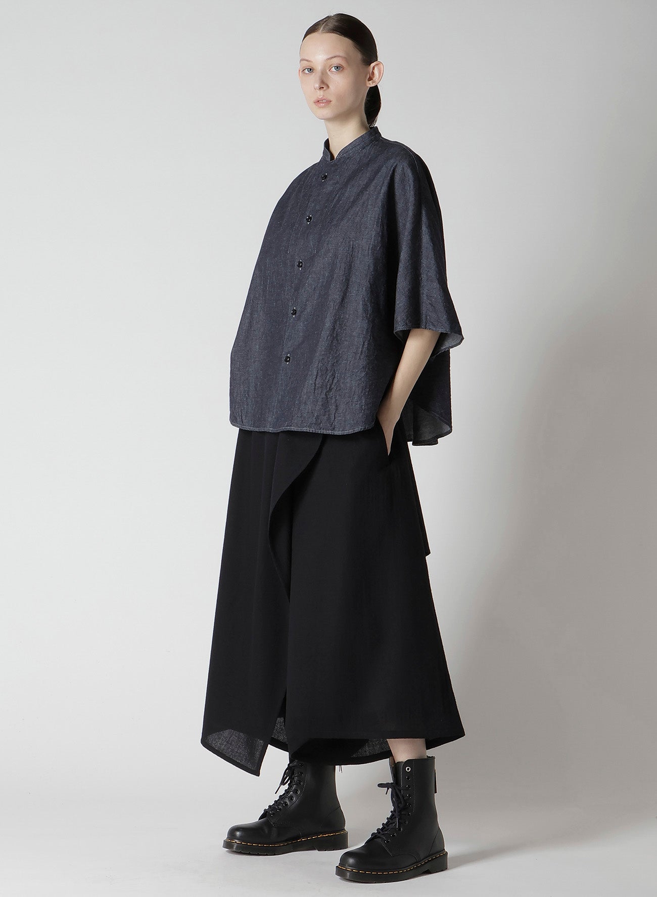 Cette blouse cape en denim à col montant présente une silhouette spacieuse grâce à un design qui intègre le corps et les manches. Faite en denim fin, son tissage lâche et son processus de teinture unique lui confèrent une texture douce. Le traitement de lavage doux améliore le confort, avec des variations individuelles attendues.