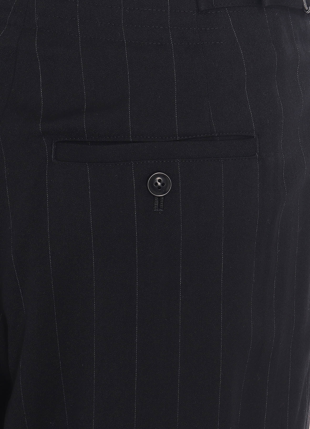 Featuring distinctive stitching at the waist, these wide pants offer a voluminous silhouette. The waist can be adjusted with side belts, made from a classic stretch chalk stripe fabric for added stretch and texture. Perfectly versatile with short or long tops.