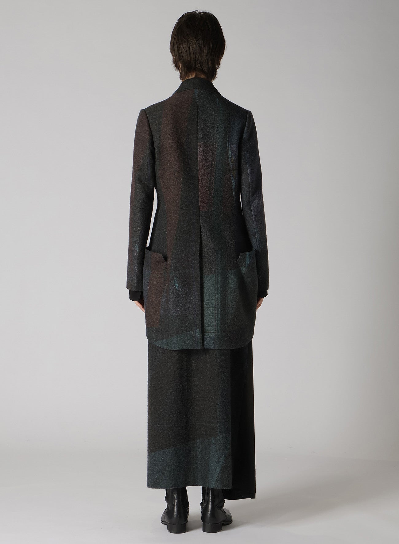 Une veste avec deux longues queues effilées à l'arrière en tissu sergé de laine-coton gratté. Le motif à carreaux complexe combine des lignes mécaniques avec des lignes organiques peintes à la main. La caractéristique remarquable est la poche découpée dans le panneau arrière. Elle peut également être portée comme un ensemble assorti avec un pantalon en matériau identique.