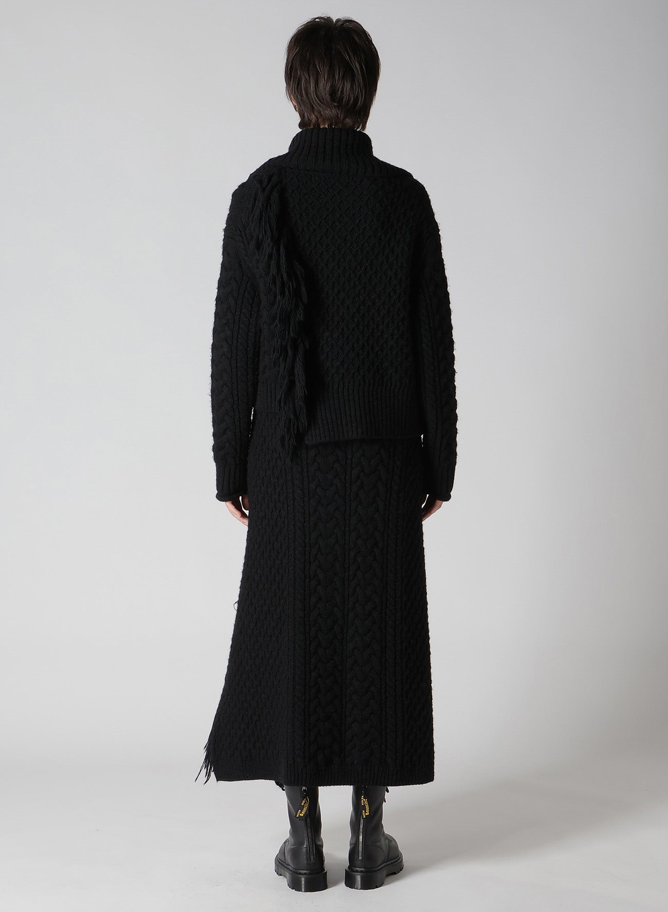 Ce cardigan en maille associe diverses textures de tricot, mettant en valeur le motif Aran original de Y's et un design combiné rehaussé de franges qui ajoutent une touche d'élégance. Le large col retourné et l'ourlet asymétrique sont des accents clés.