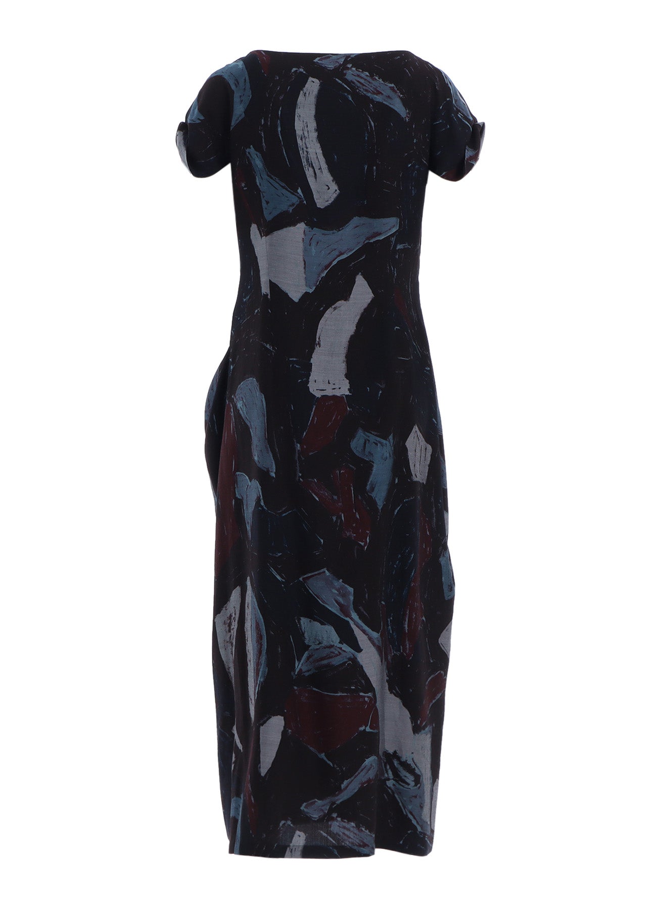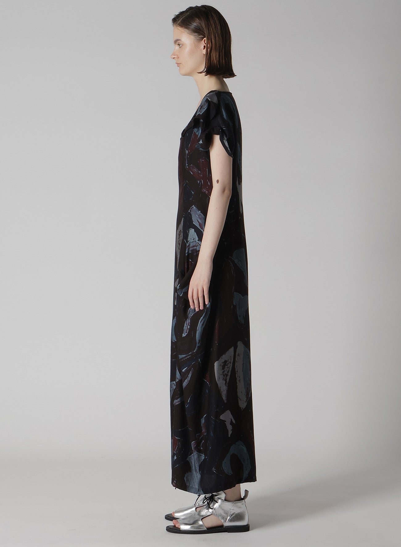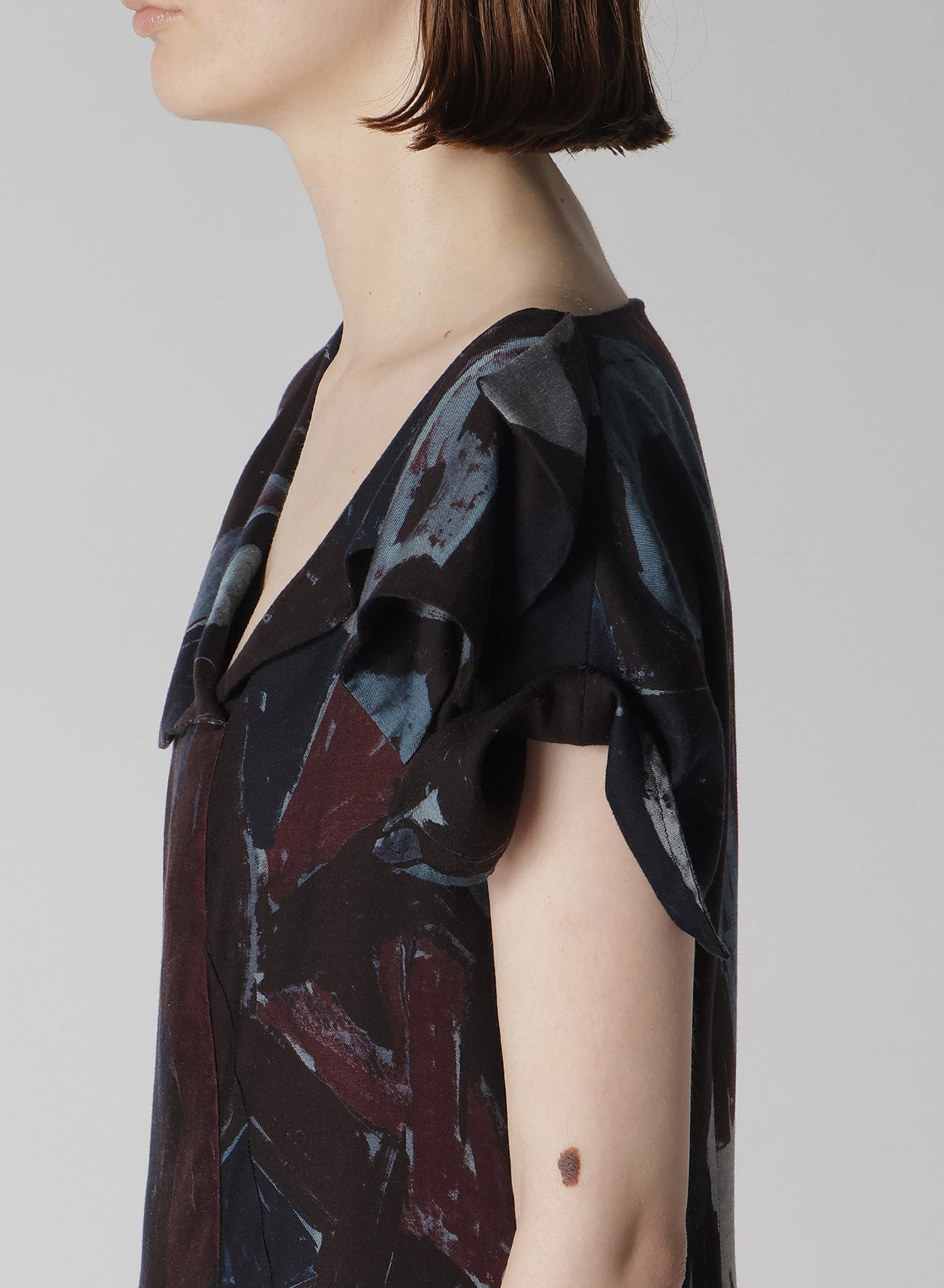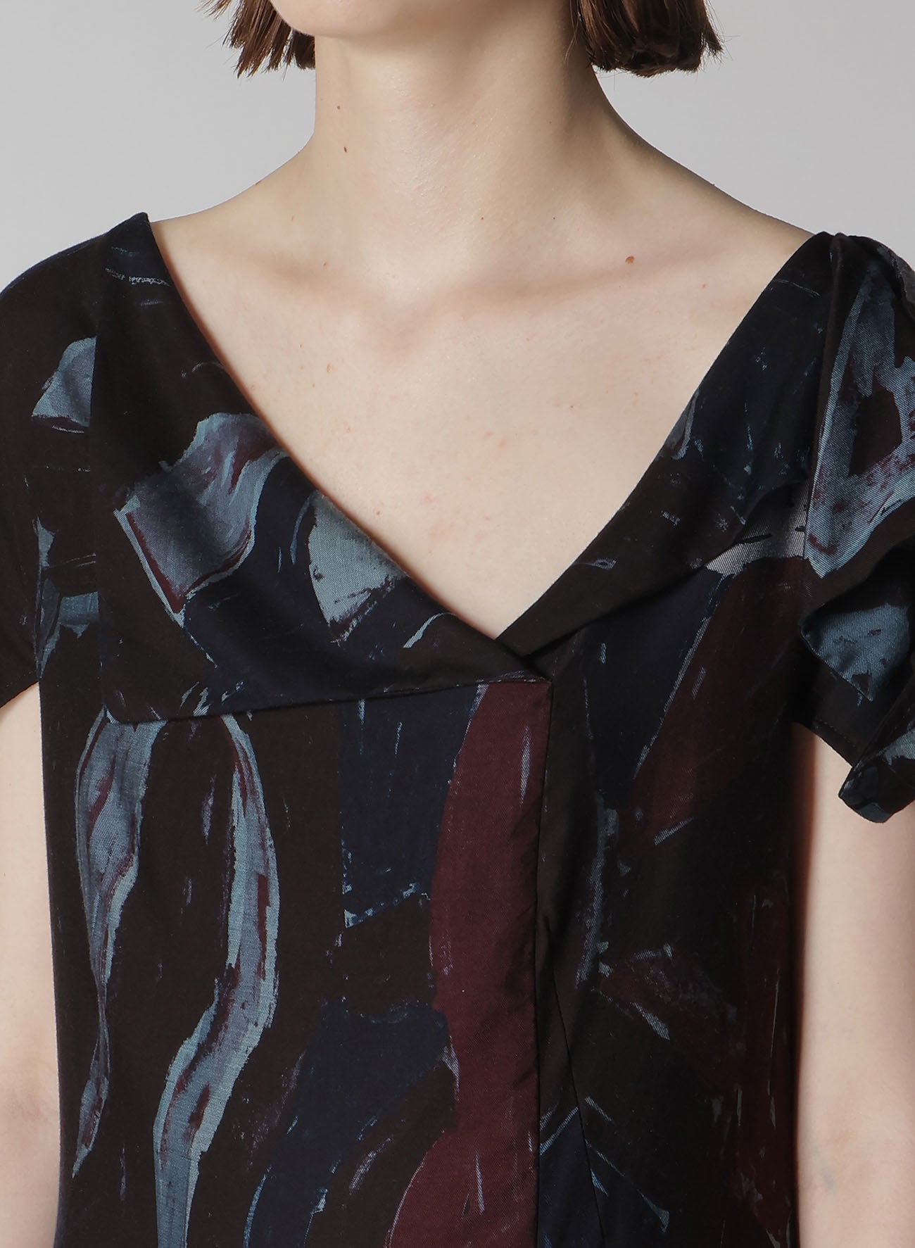 Une robe en cupro avec un col carré et un motif abstrait évoquant des paysages urbains peints. Un accent en tissu carré au niveau du cou ajoute de l'intérêt. La conception des manches réduit l'exposition, ce qui la rend idéale à porter seule.