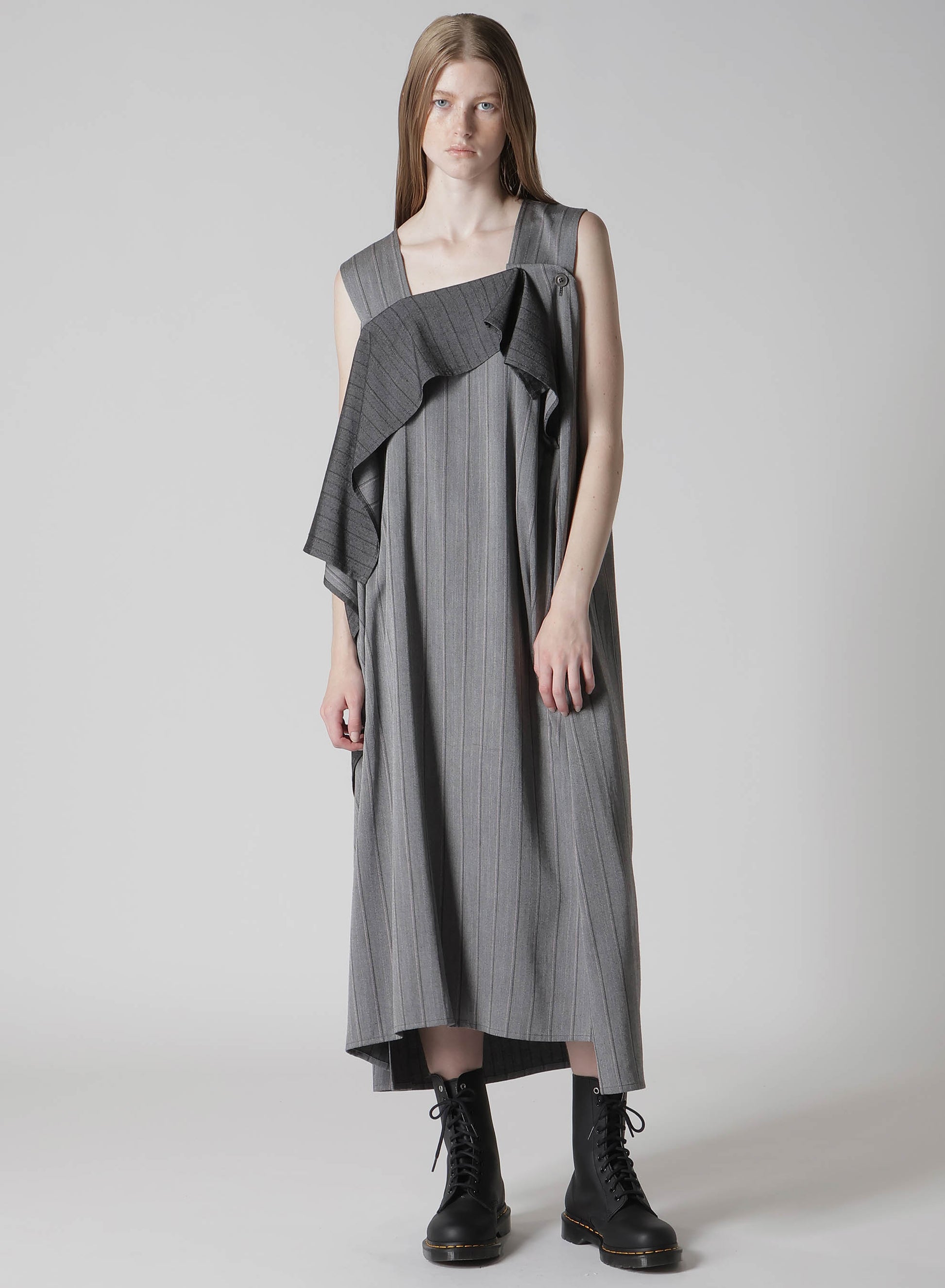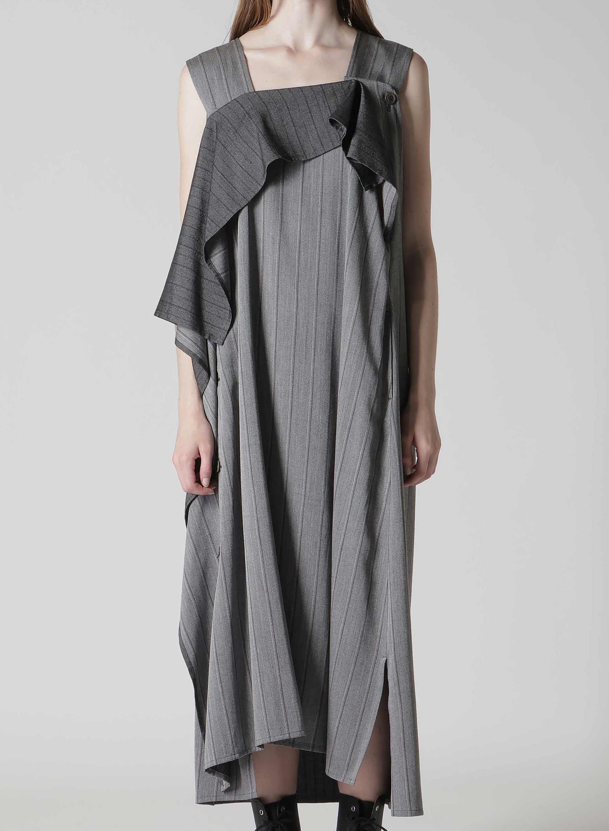 This dress is crafted from rayon, featuring a classic striped pattern typically seen in menswear, interpreted on rayon fabric. A key feature of the design is the elegant drapery extending from the collar to the hem.