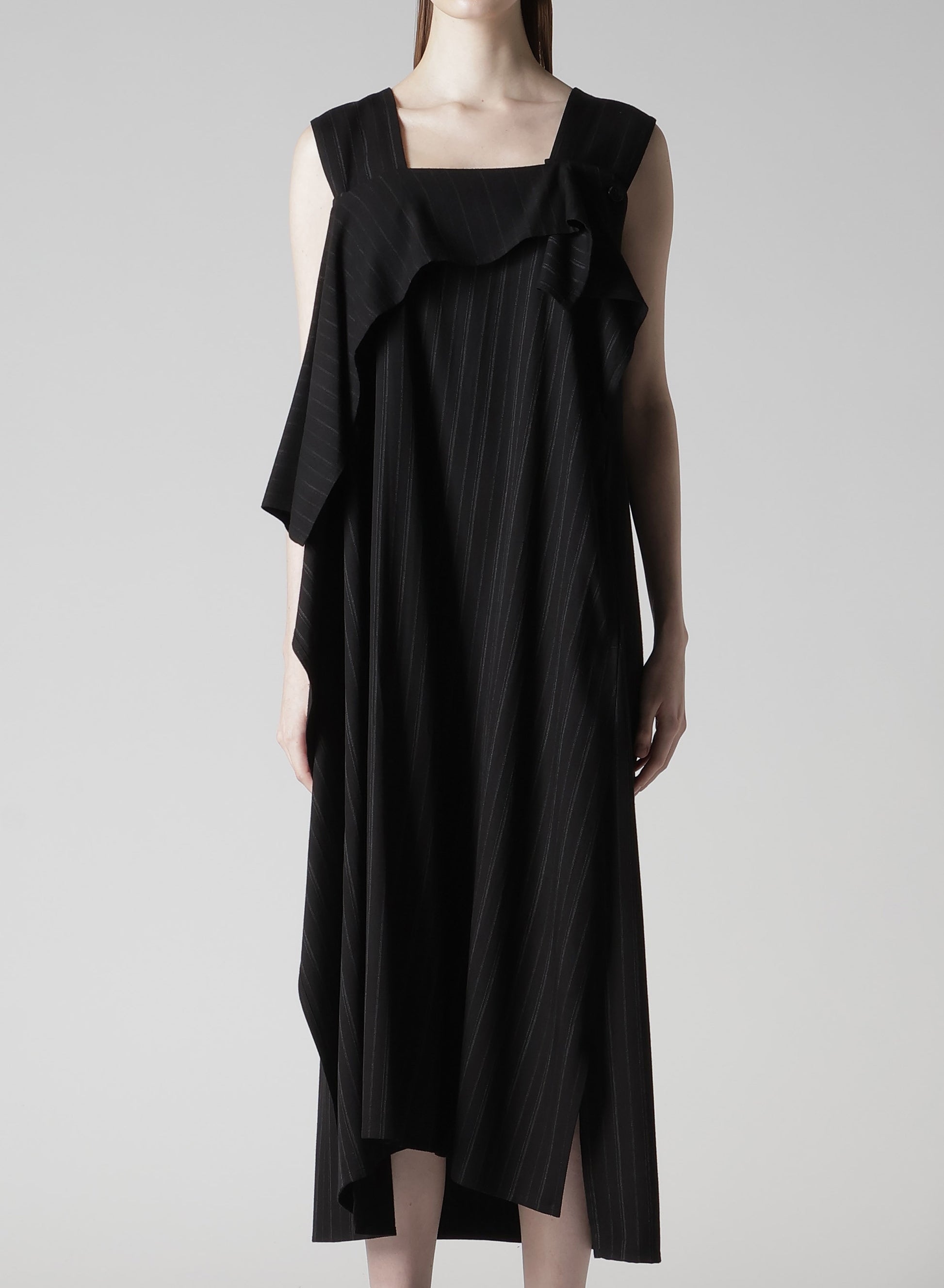 This dress is crafted from rayon, featuring a classic striped pattern typically seen in menswear, interpreted on rayon fabric. A key feature of the design is the elegant drapery extending from the collar to the hem.