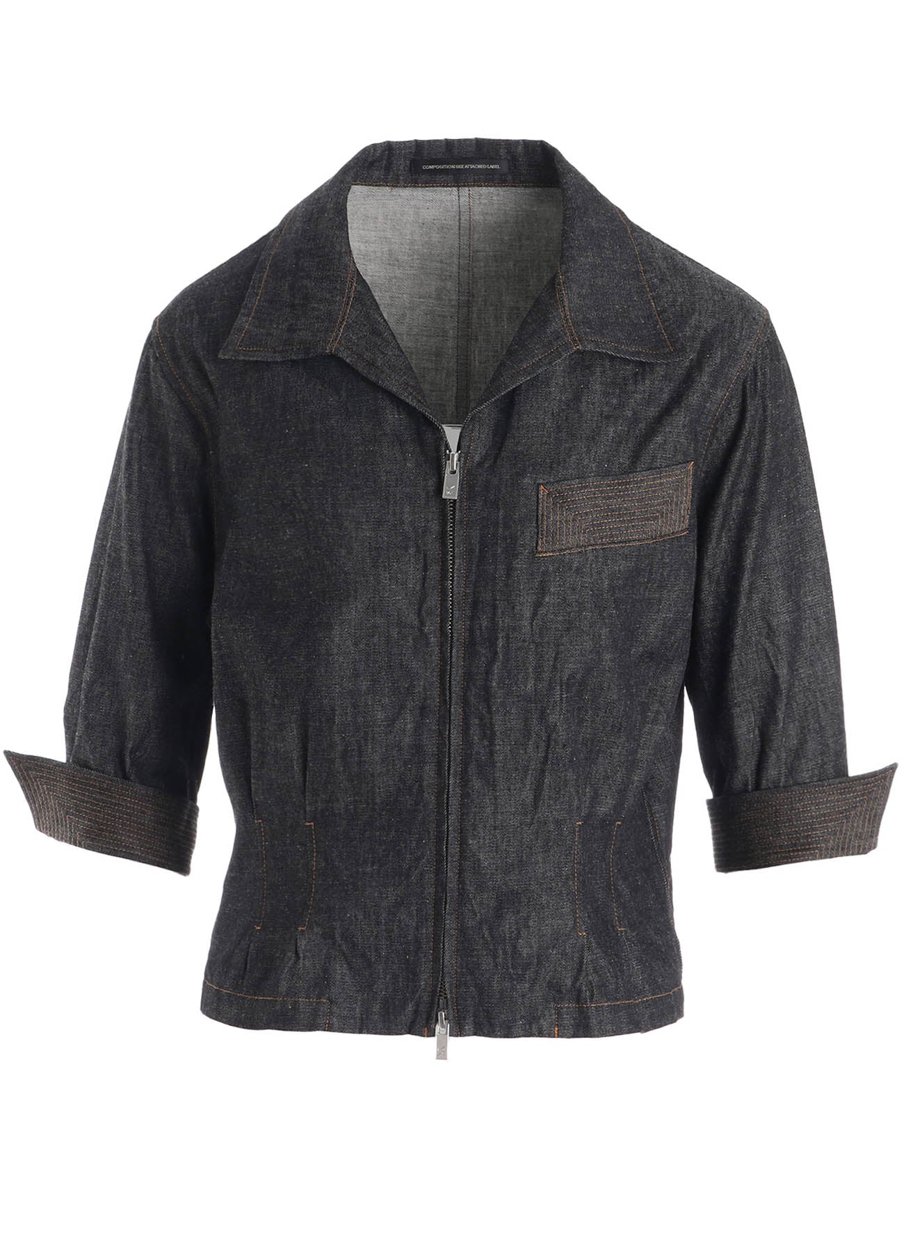 This lightweight 6oz jacket with three-quarter sleeves features a strong twill texture highlighting its denim character. The jacket has been garment-washed for a natural feel and includes topstitching detail on the cuffs and pockets. Note that denim fabric might fade over time.