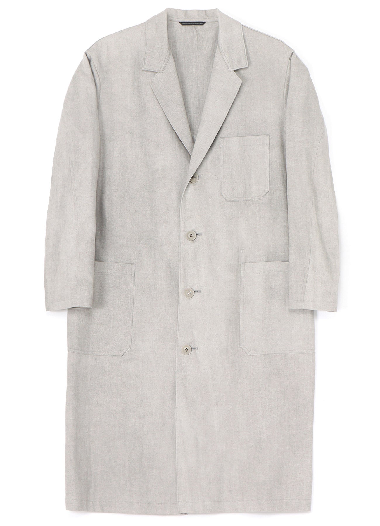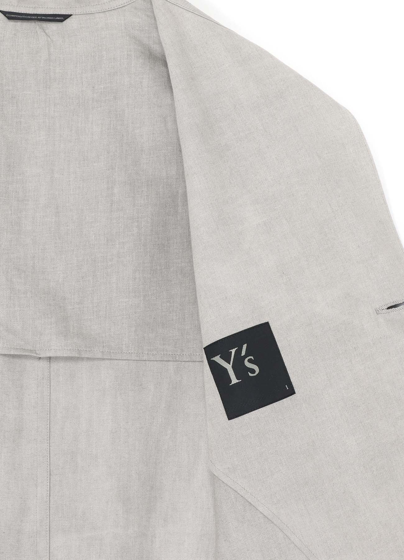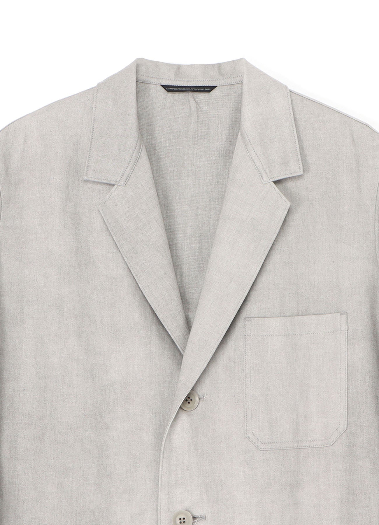 This work jacket combines linen and cotton blended yarns, providing a refreshing feel. Its unique features include a rough texture and uneven color achieved through sumi dyeing. Inspired by vintage designs, it has bold chest pockets and pairs well with matching pants. Note the distinct fiber texture, typical of linen.