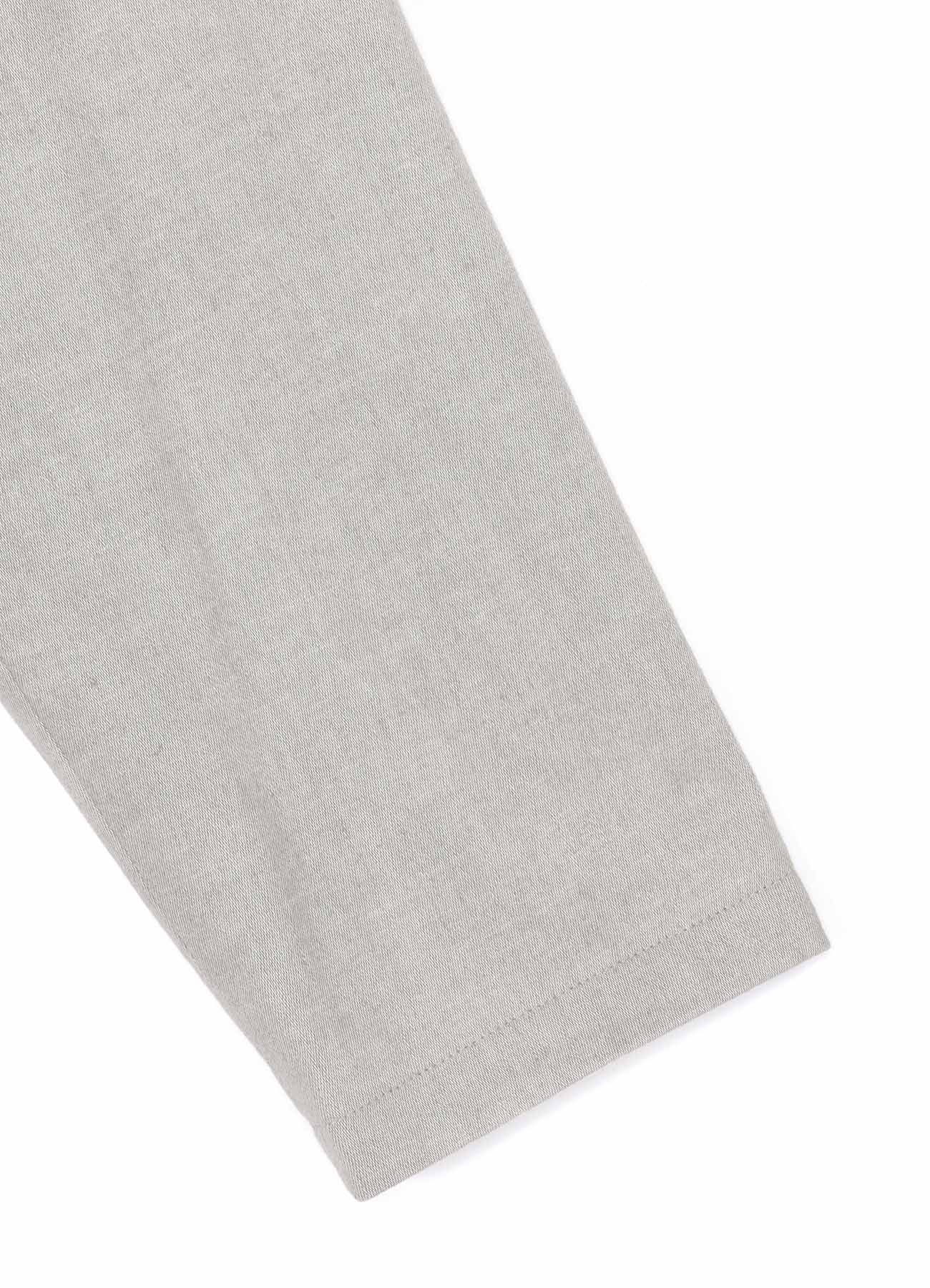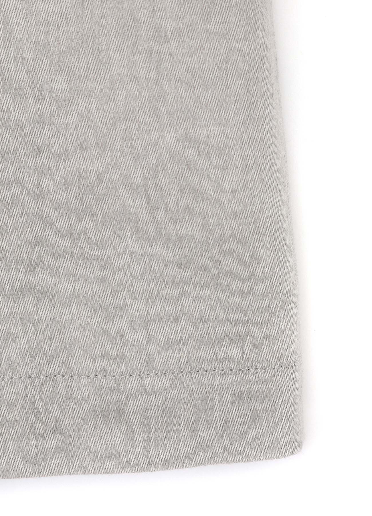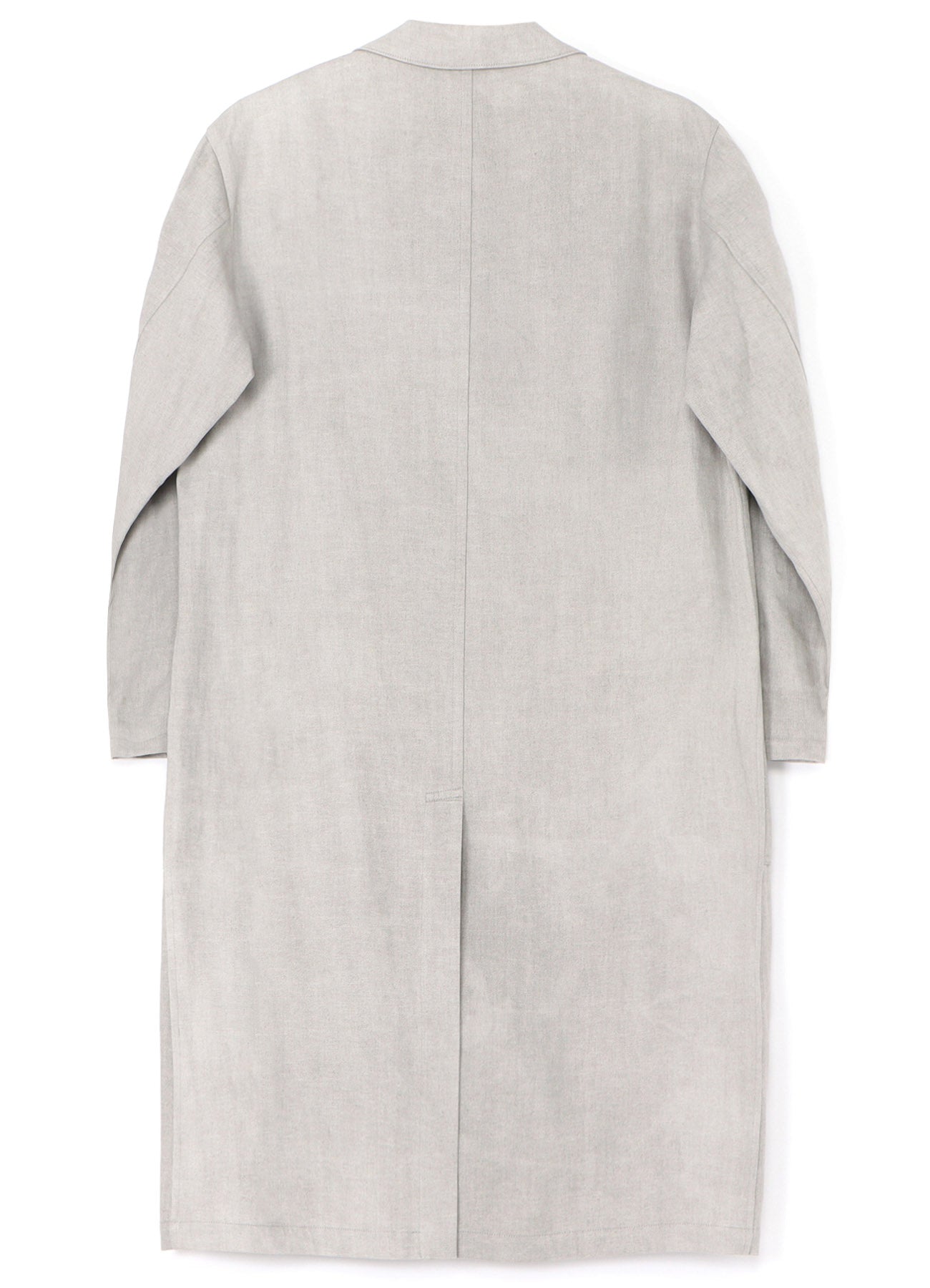 This work jacket combines linen and cotton blended yarns, providing a refreshing feel. Its unique features include a rough texture and uneven color achieved through sumi dyeing. Inspired by vintage designs, it has bold chest pockets and pairs well with matching pants. Note the distinct fiber texture, typical of linen.