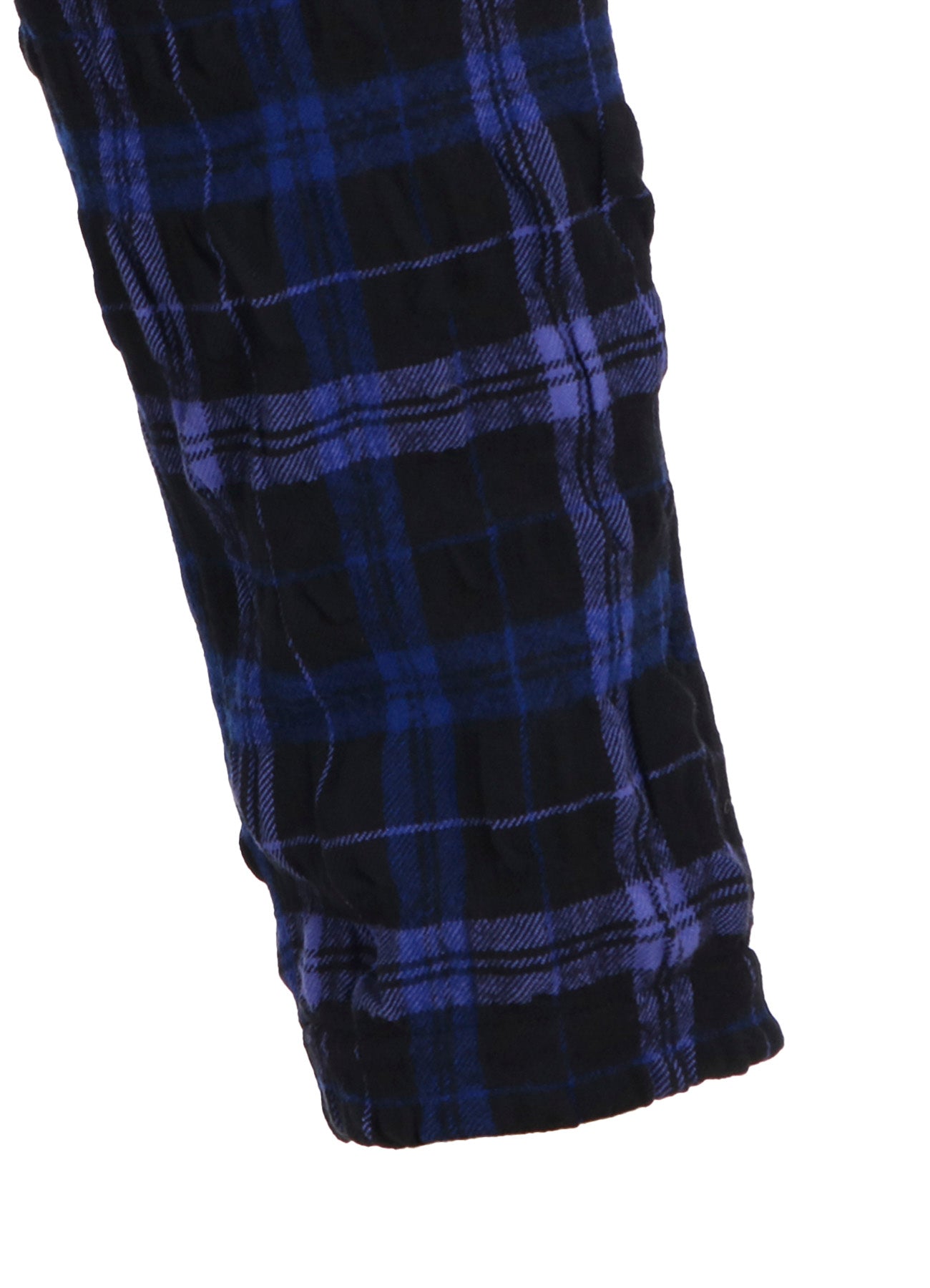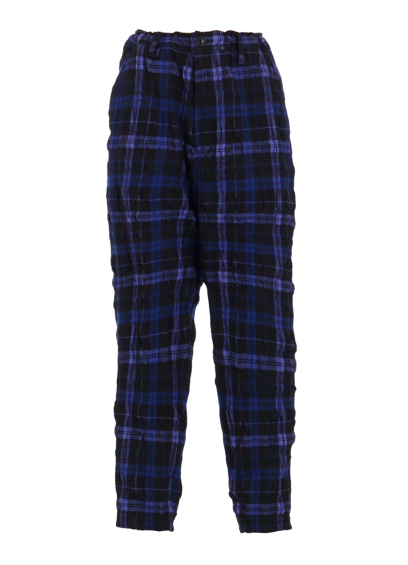 Woolen pants with a plaid pattern. Crafted using a blend of wool and cotton, the fabric undergoes a tumbler fulling process. This results in a textured, three-dimensional material due to the varying shrinkage properties of the fibers, offering a unique tactile experience.