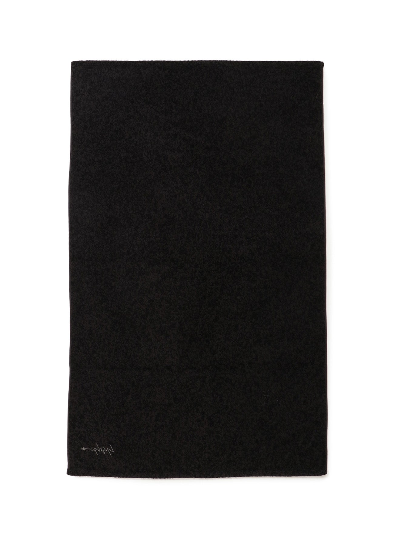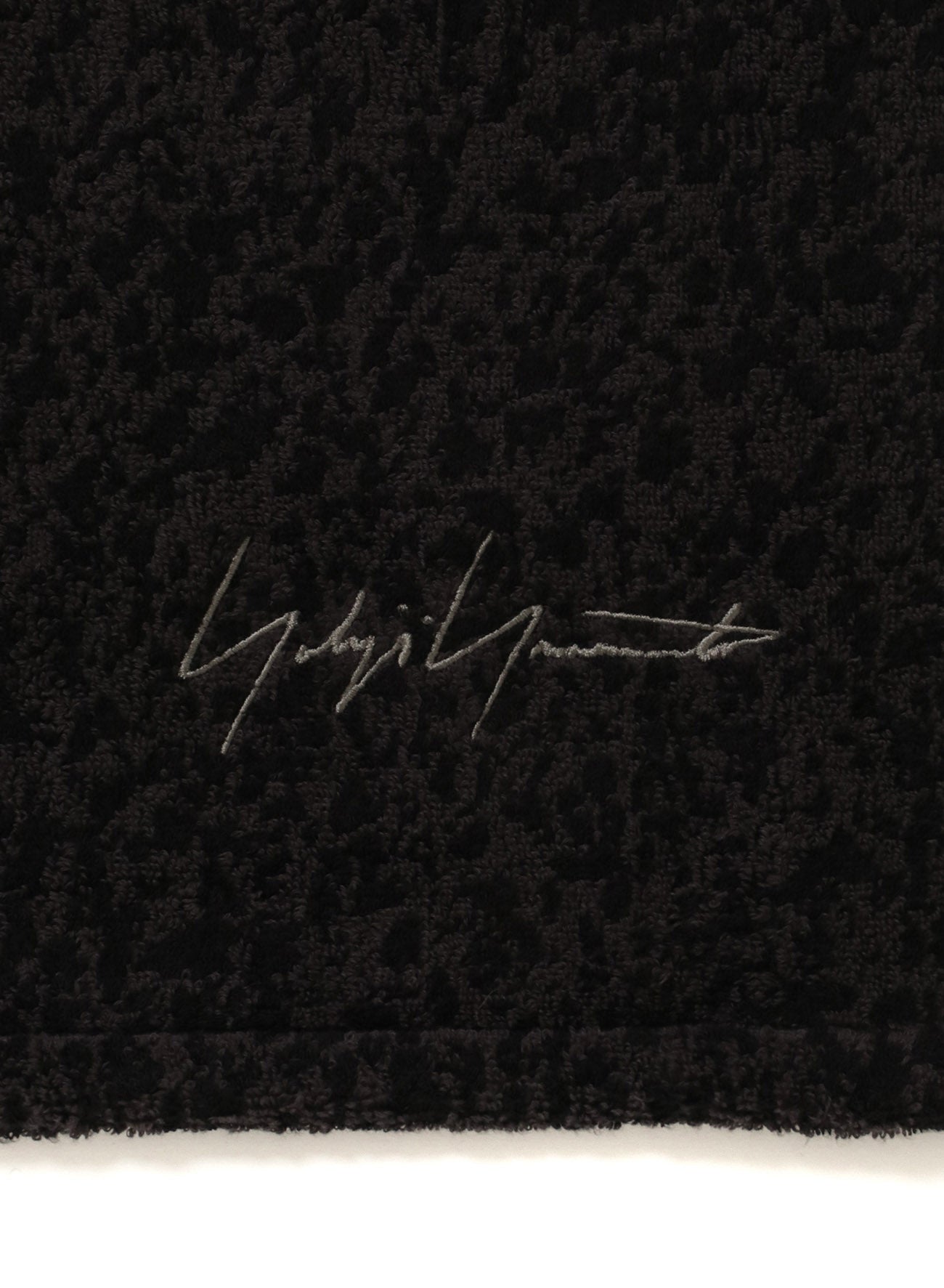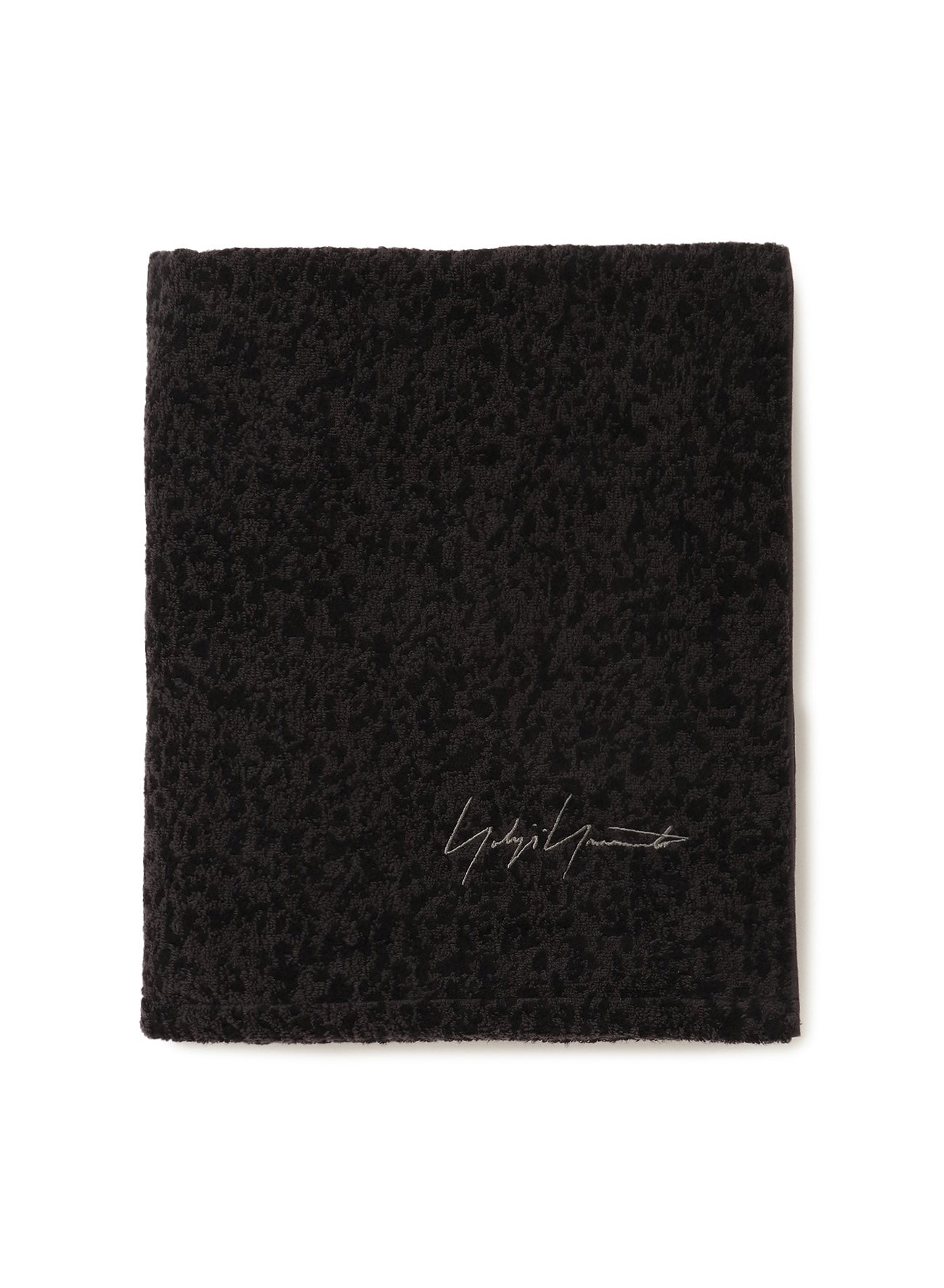Un asciugamano di alta qualità realizzato in cotone organico e rayon di bambù, curato da "IKEUCHI ORGANIC" e "Yohji Yamamoto." L'asciugamano presenta una costruzione innovativa del pelo per una minima degradazione nel tempo. Il design include un motivo maculato distintivo dovuto alla diversa assorbimento dei coloranti.
