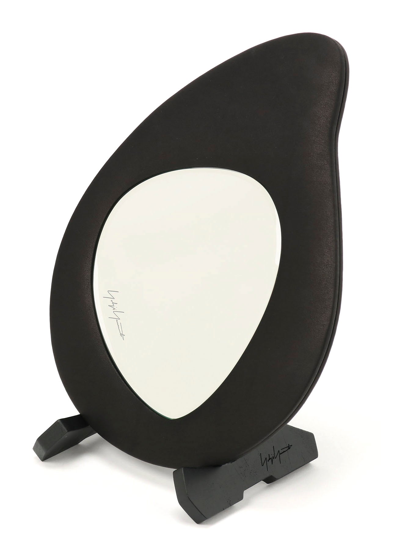 Questo specchio da tavolo presenta una base in legno e una finitura in pelle, aggiungendo un elemento di sofisticazione a qualsiasi spazio.