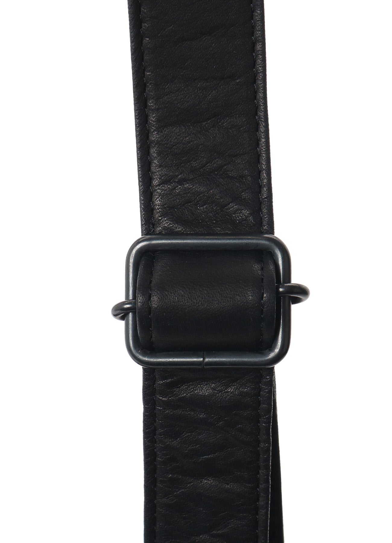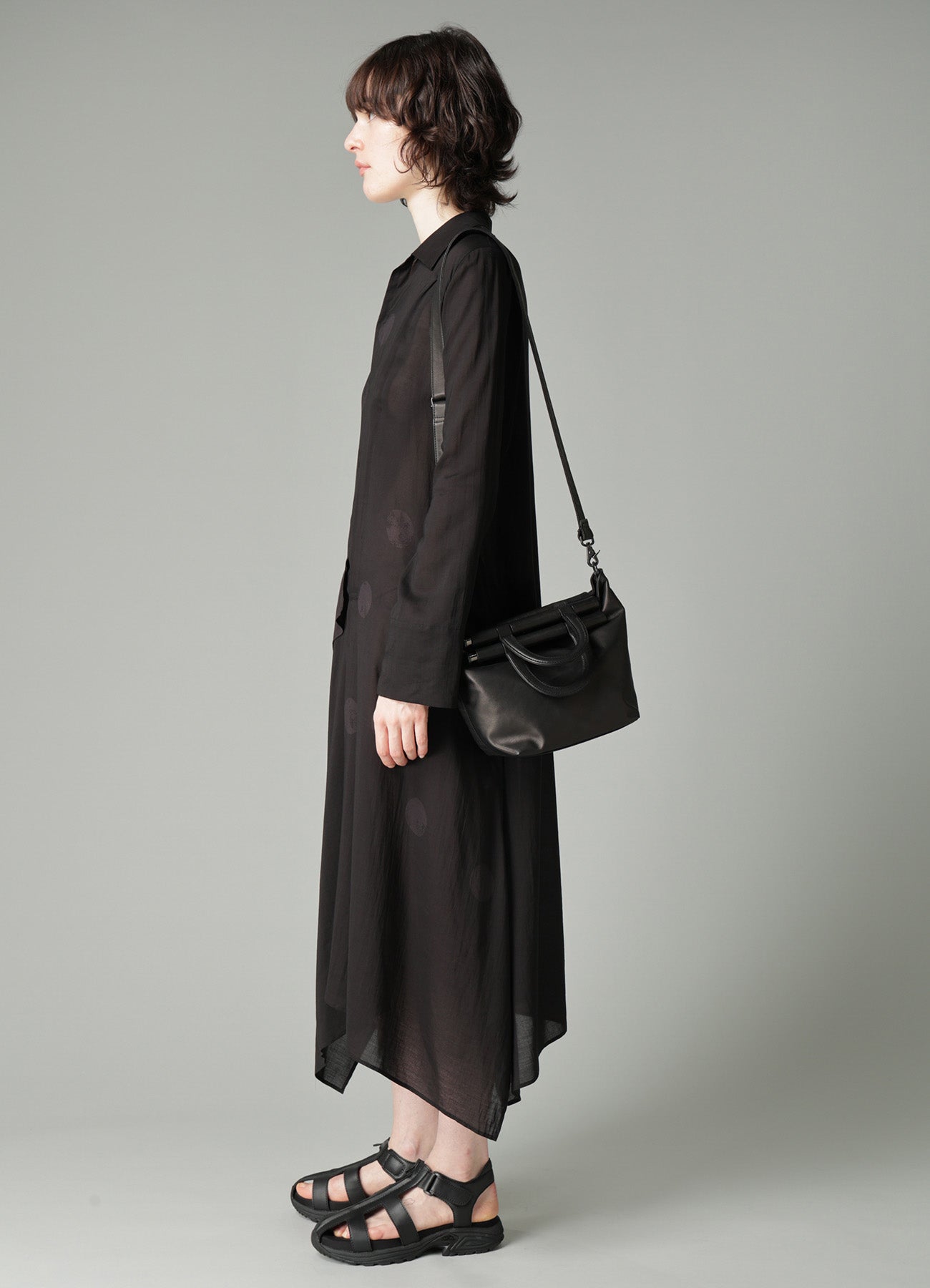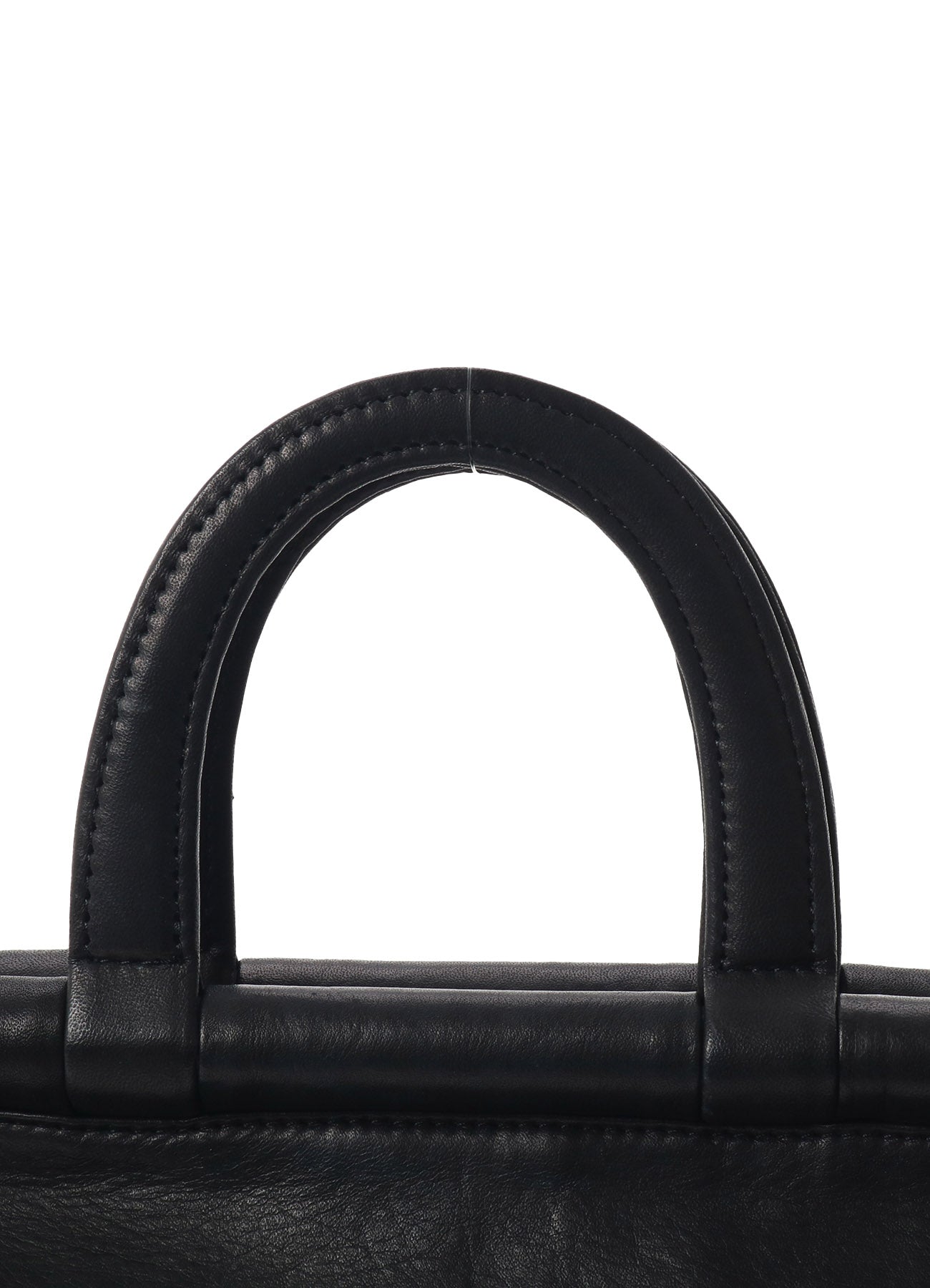 This 2-way tote bag is crafted from slightly firm smooth leather and features a compact design. It is characterized by its unique handle attachment, allowing the handle to be folded and stored inside when using the shoulder strap.