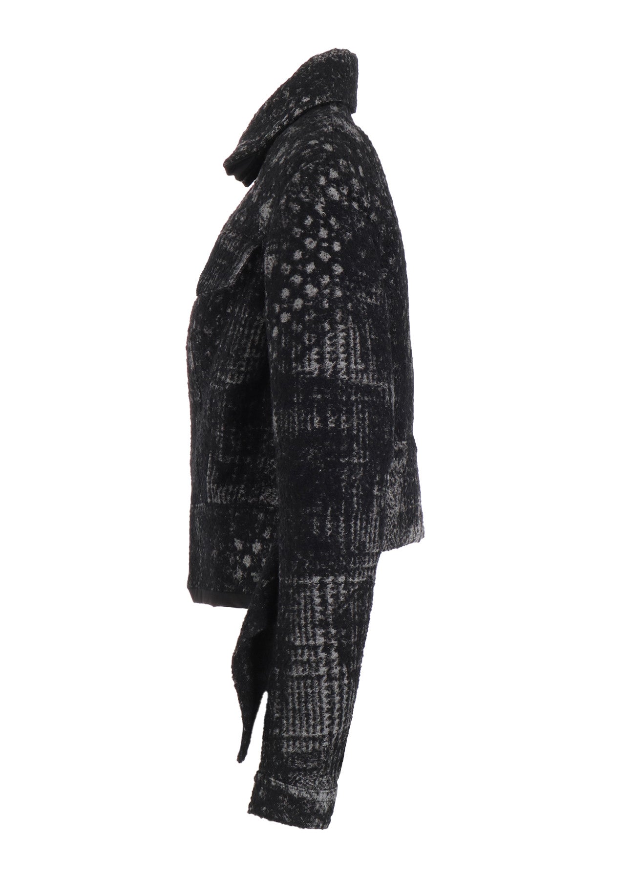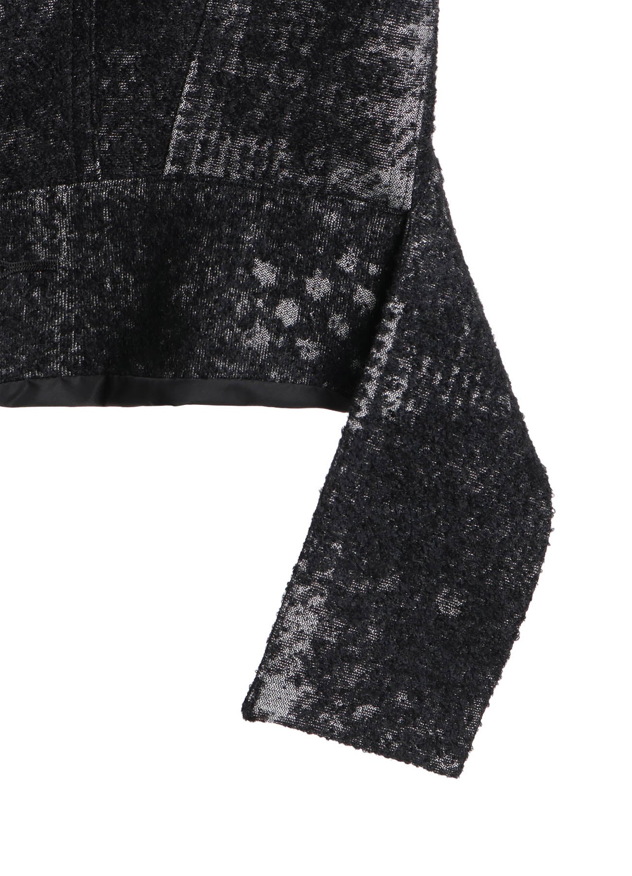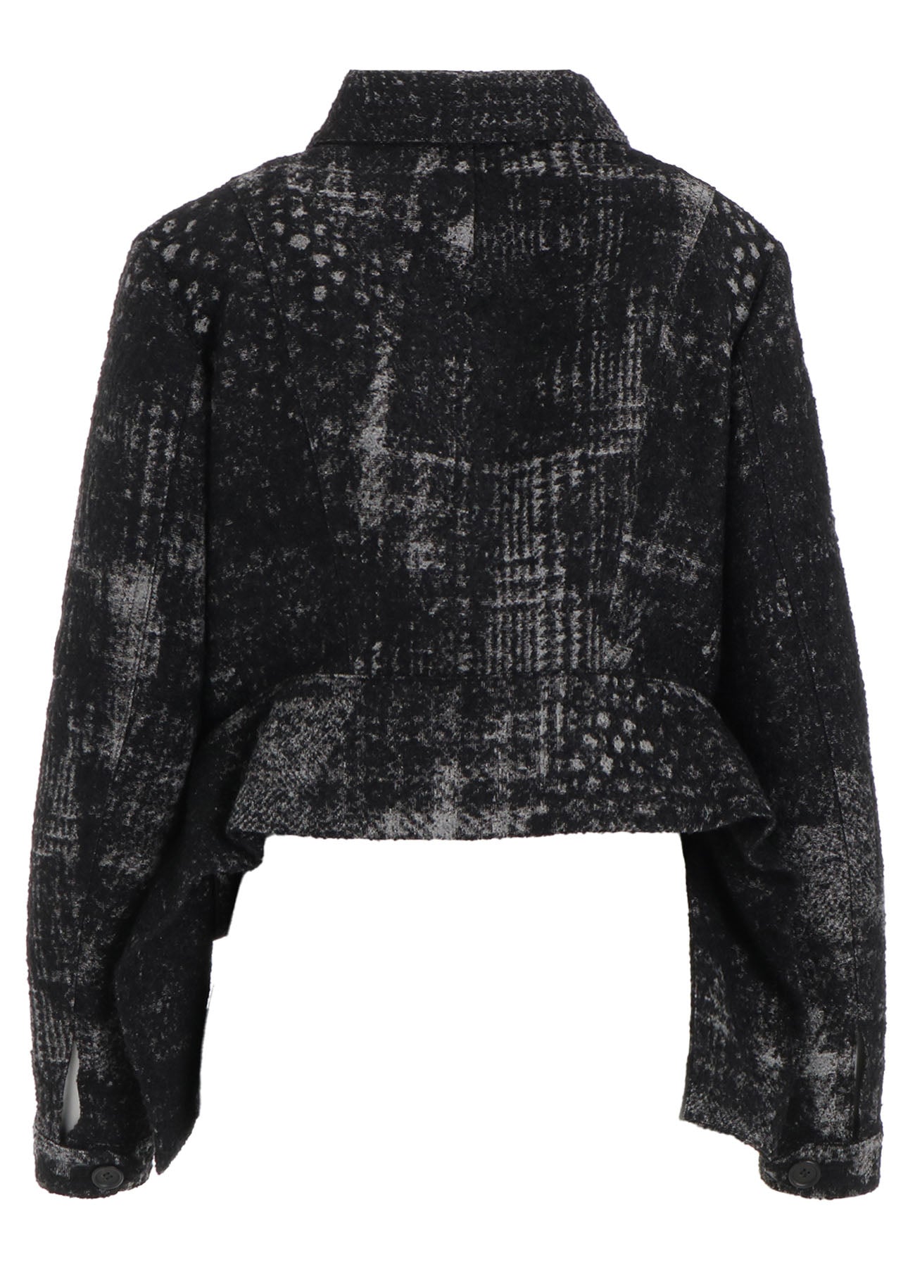 Questa giacca corta presenta un jacquard tagliato con motivo a scatola tridimensionale. La complessa tessitura mostra motivi a quadri e pied-de-poule. Progettata con una silhouette compatta, si abbina bene a pantaloni voluminosi, offrendo un'estetica equilibrata all'outfit.