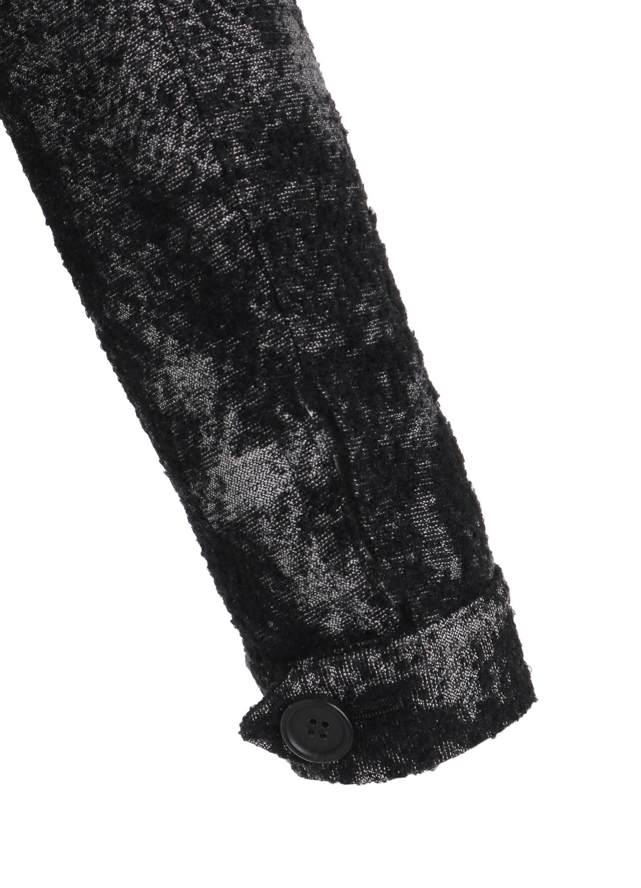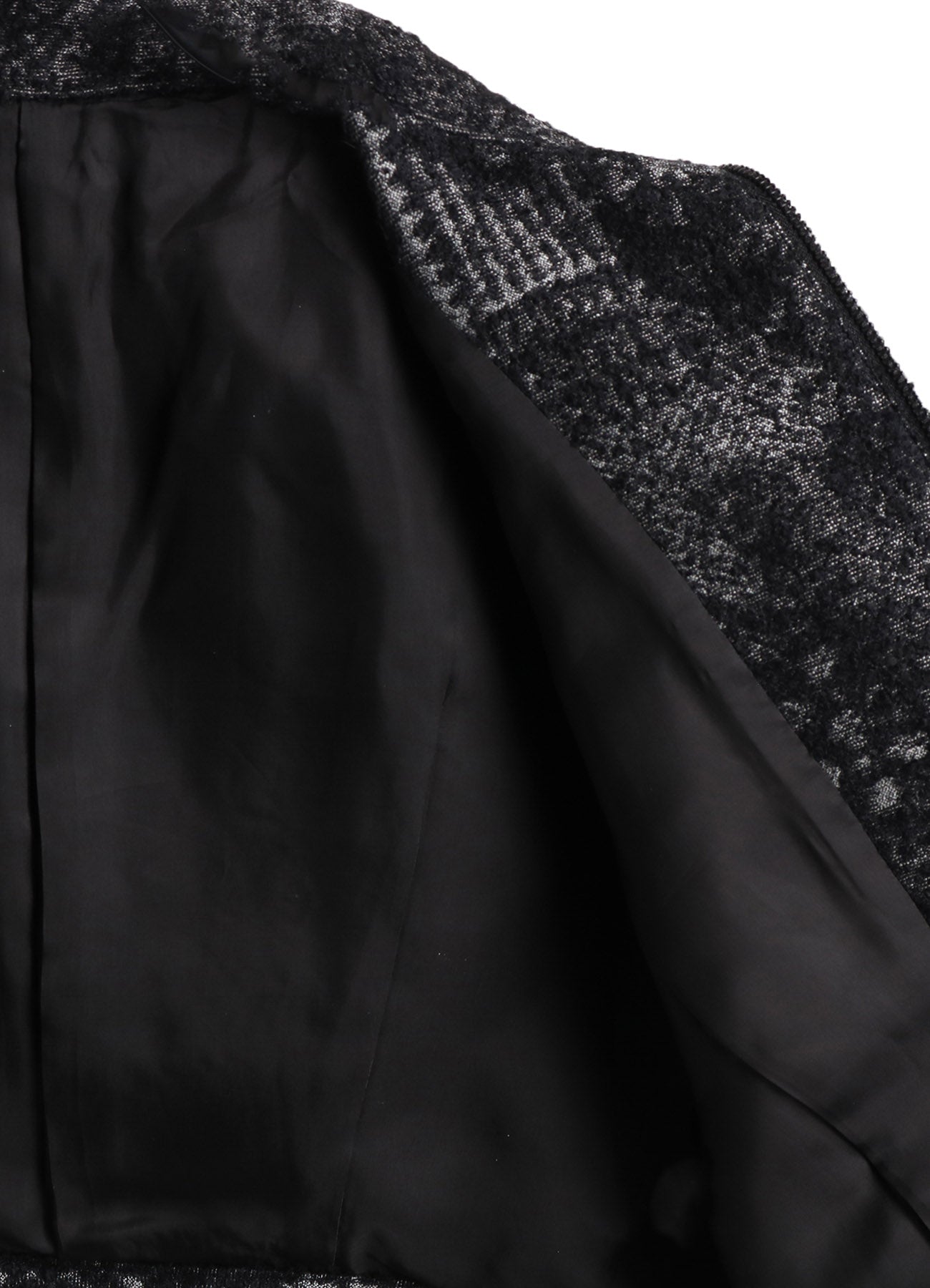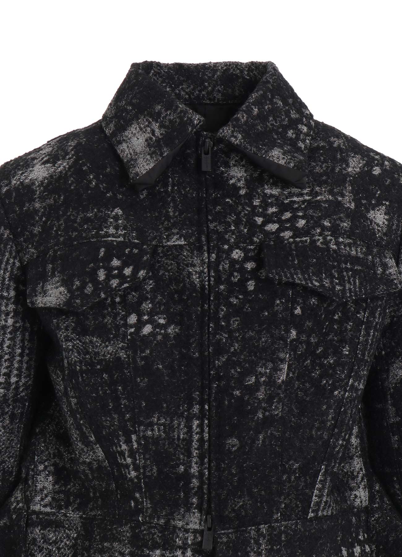 Questa giacca corta presenta un jacquard tagliato con motivo a scatola tridimensionale. La complessa tessitura mostra motivi a quadri e pied-de-poule. Progettata con una silhouette compatta, si abbina bene a pantaloni voluminosi, offrendo un'estetica equilibrata all'outfit.