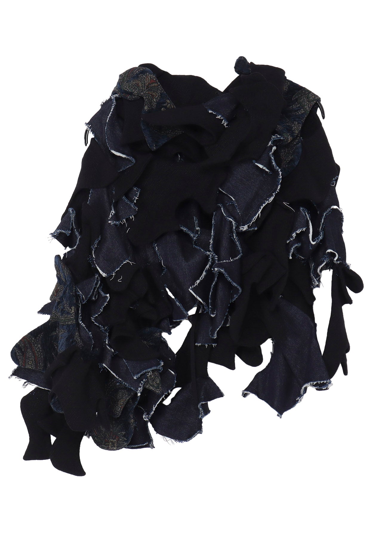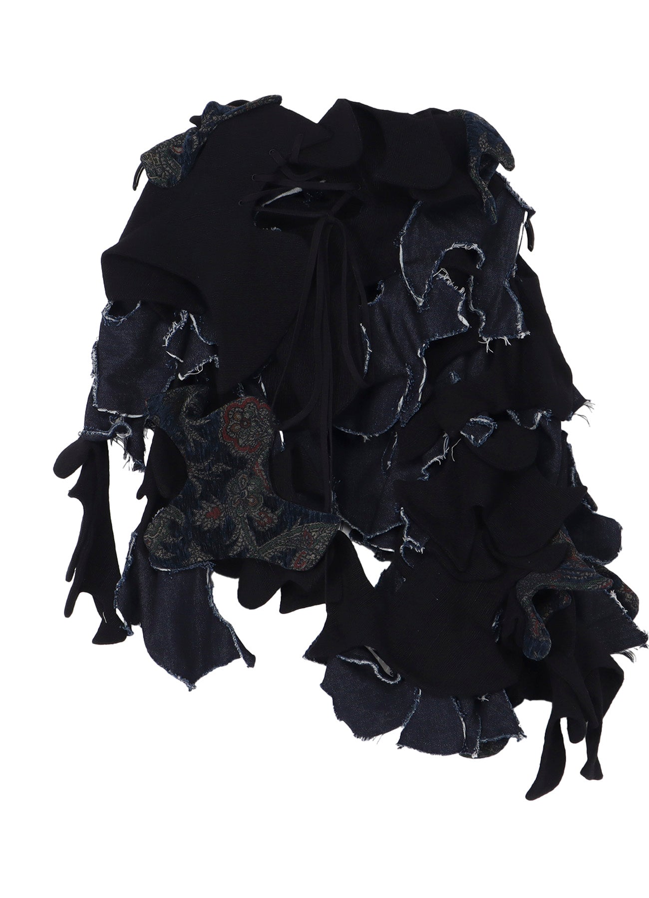 A charming bustier blouse adorned with diverse motifs. This piece features an engaging mix of materials, such as denim, linen, and black-dyed Gobelin jacquard. Due to the denim and black-dyeing techniques used, colors may fade or transfer. Model images show samples, and the final product size or texture might vary. Check SIZE INFO for details.