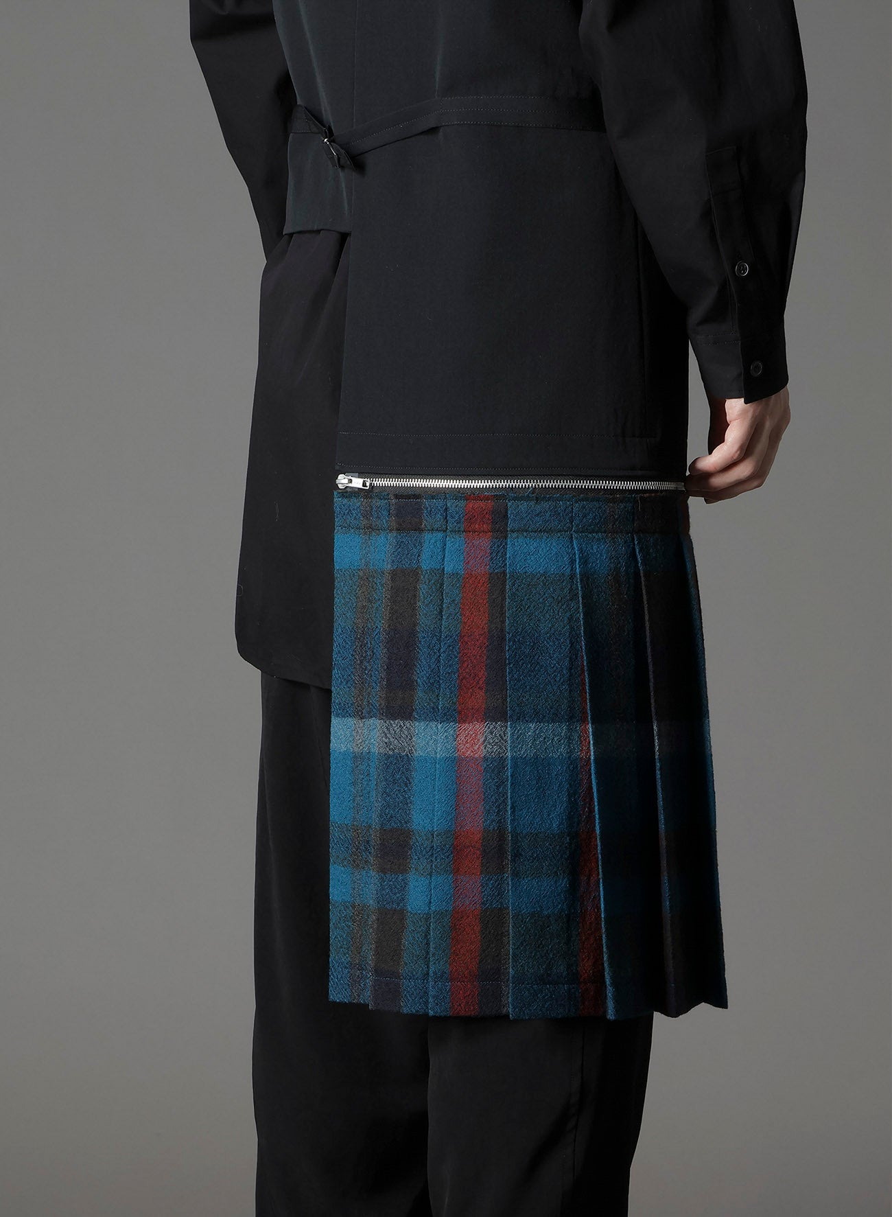 La collezione Autunno/Inverno 2025-26 di Ground Y presenta un gilet asimmetrico con costruzione completamente foderata. Questo capo dispone di tasche a scatola su entrambi i lati e una tasca interna sul petto. Il tessuto plissettato è rimovibile tramite una cerniera e regolabile con una cintura posteriore. Utilizza materiali iconici come la lana gabardine e un tessuto reversibile raffinato per il calore.