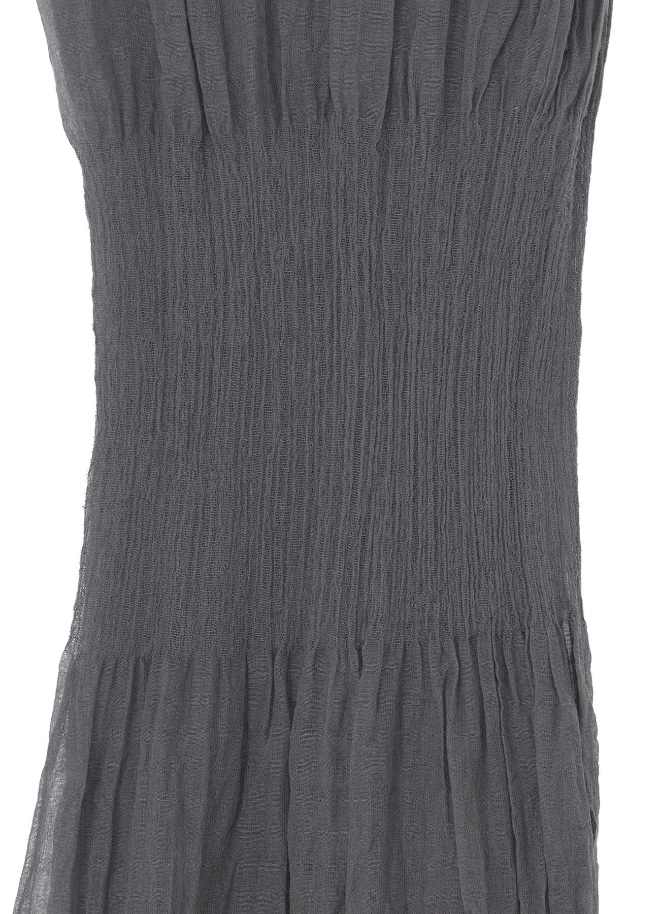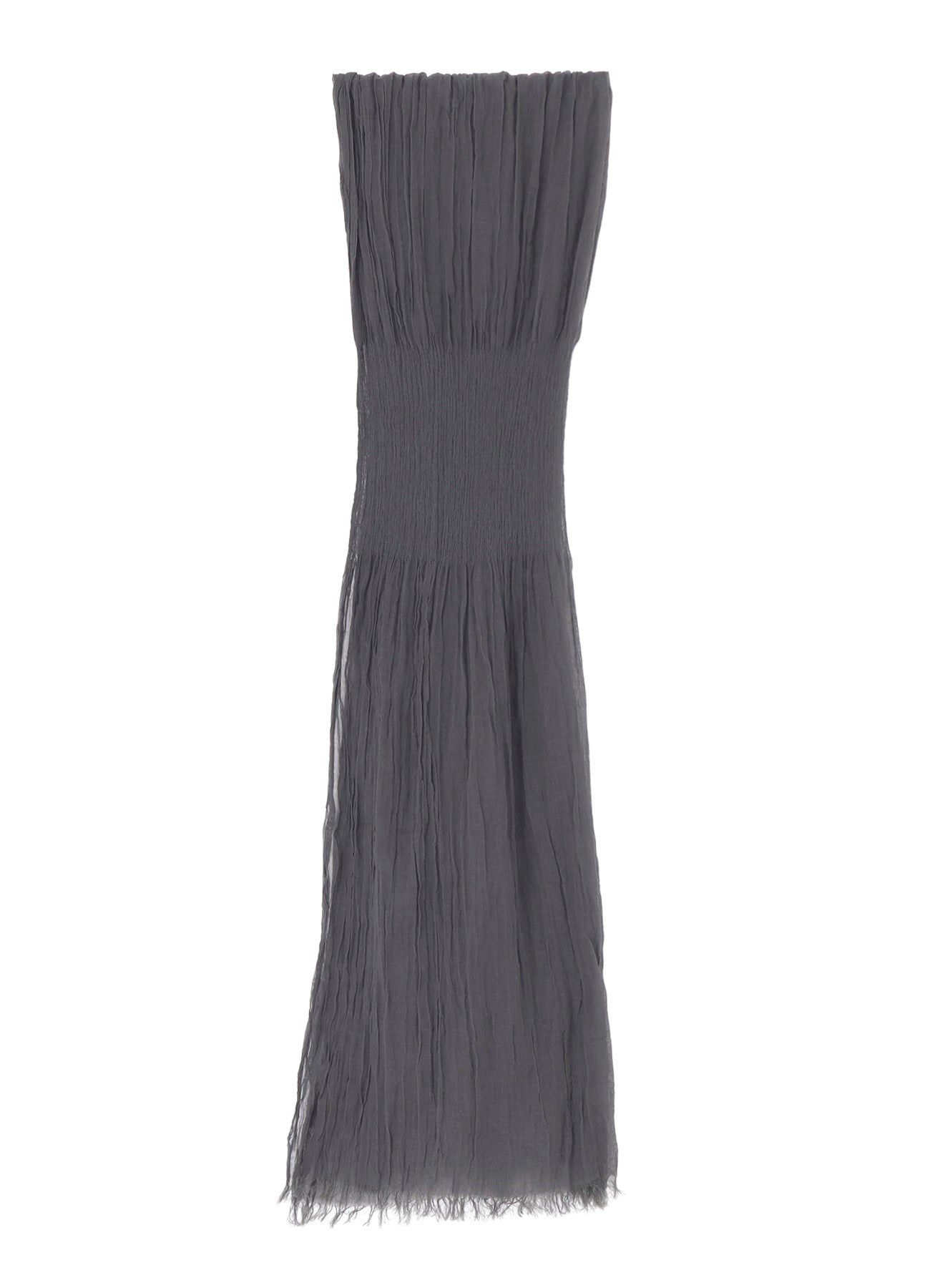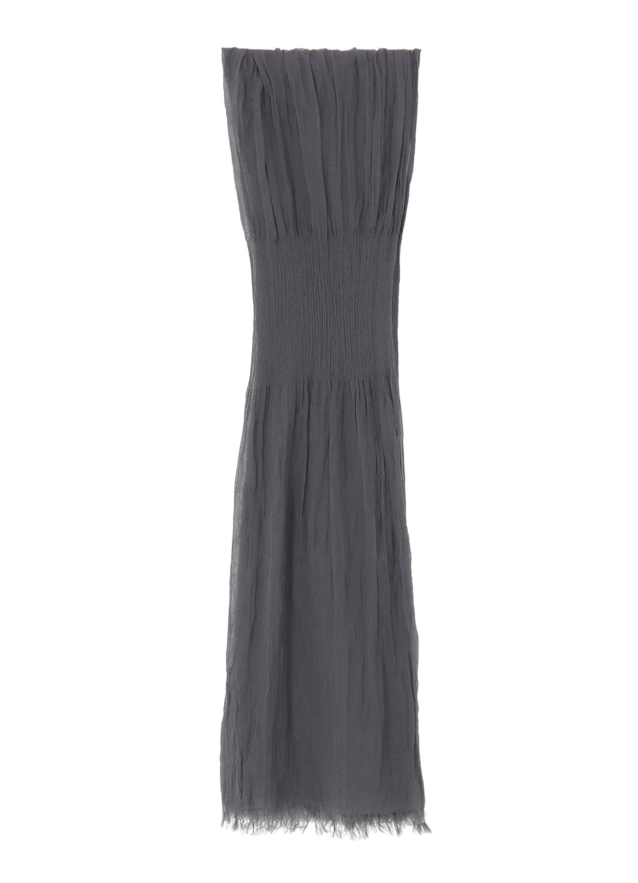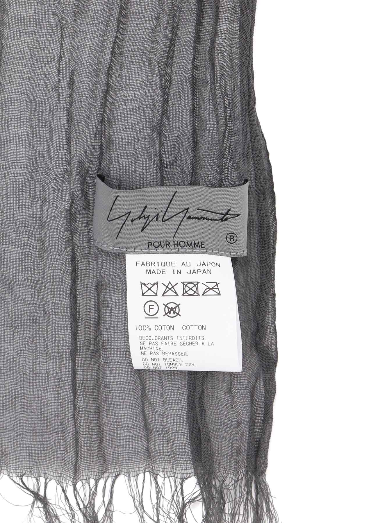 Questa stola è realizzata in cotone a tessitura liscia, caratterizzata da una consistenza morbida. Presenta design con dettagli arricciati, ottenuti attraverso il processo esclusivo di Yohji Yamamoto, che include grinze e arricciature ottenute mediante restringimento selettivo con filati ritorti.